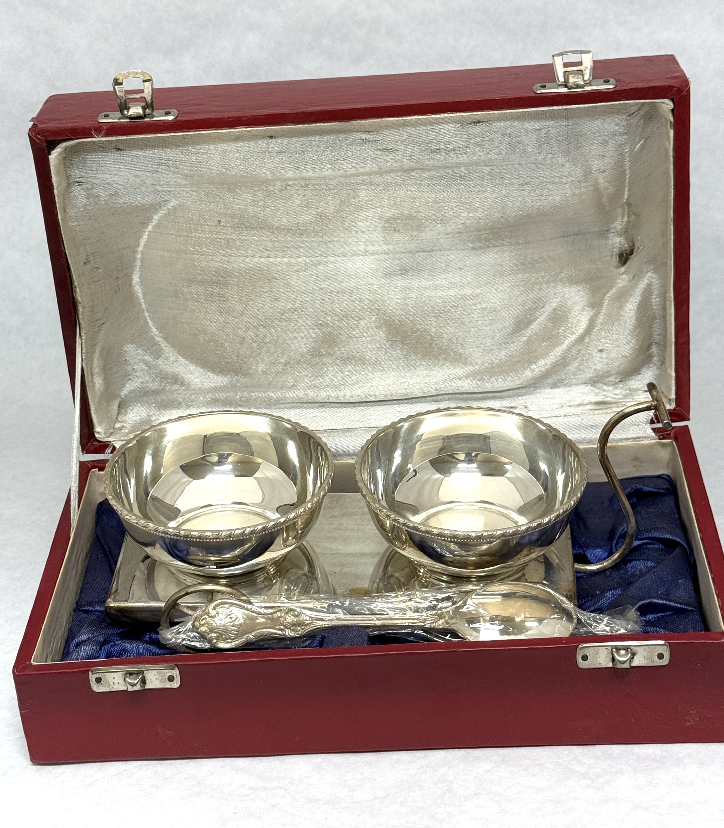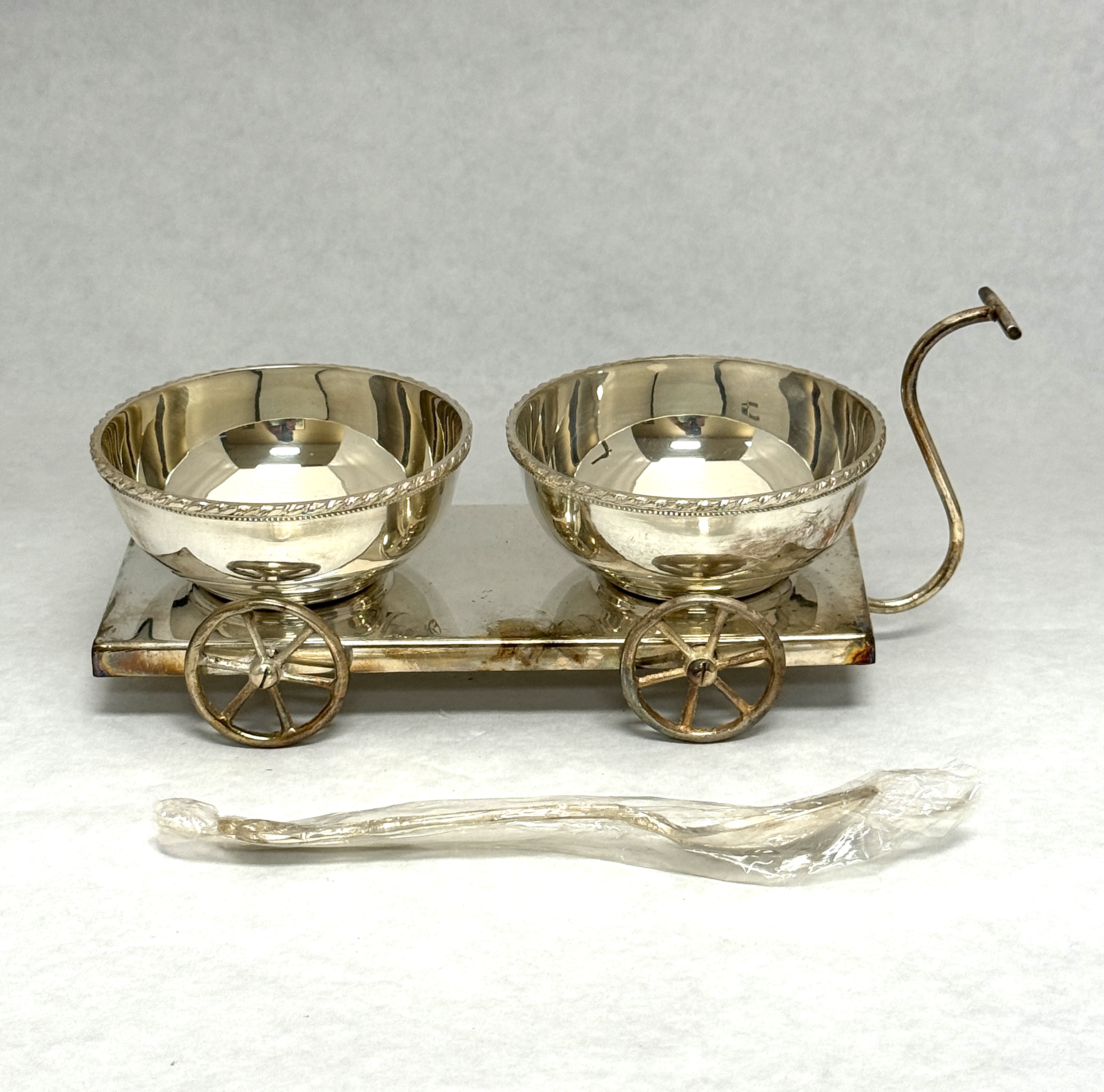 Silver plate condiment set with two bowls set on a wagon tray with a spoon, in gift box; gift box 10″ length. CONDITION: no chips, cracks, repairs, or material defects found, Jaremos attempts to call any material flaw that affects the price, but minor scratches and color variances are inherent to glass and antiques.
