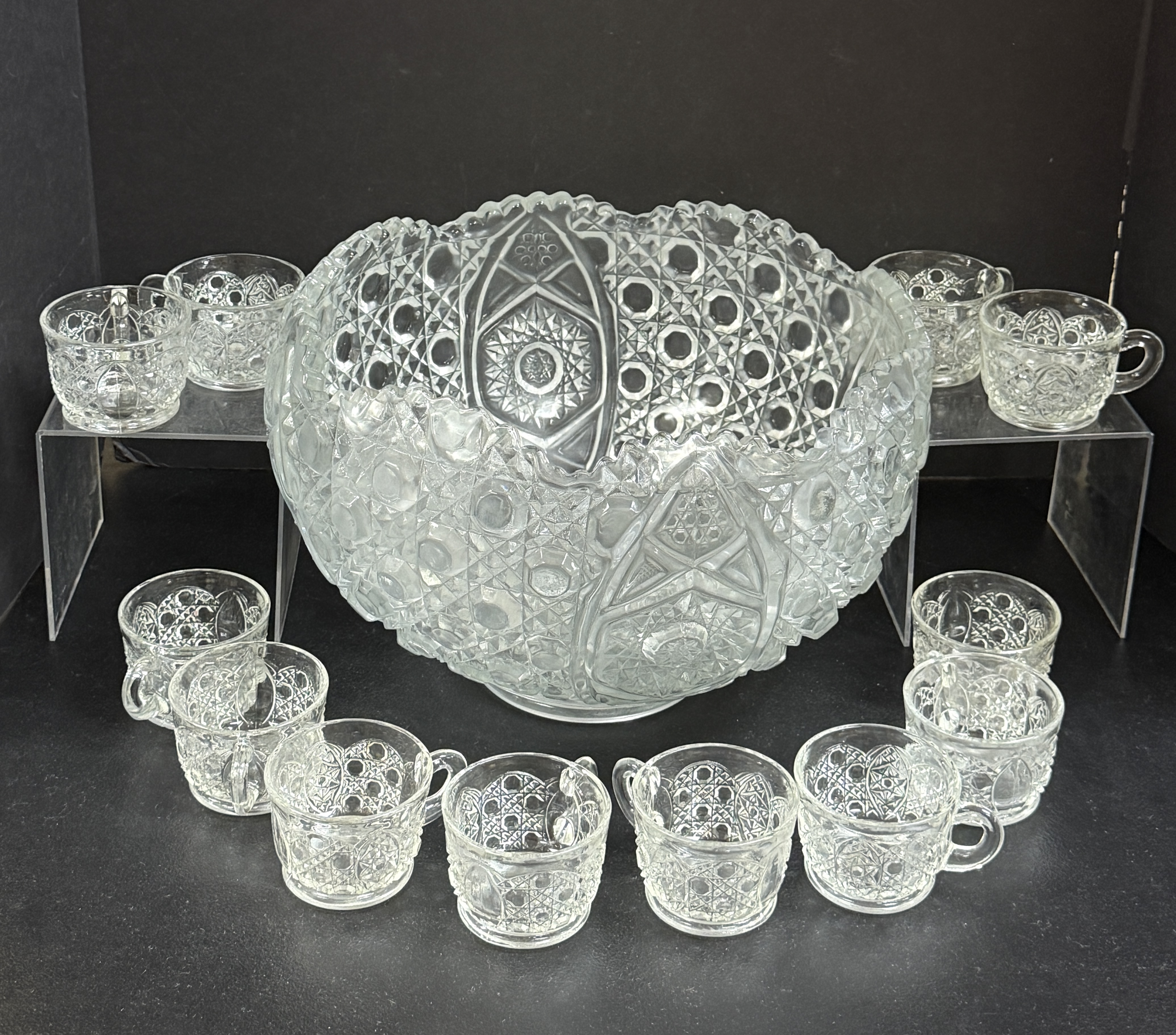 Pressed glass punch bowl and 12 cups in the daisy and button pattern, 11″ ht. CONDITION: no chips, cracks, repairs, or material defects found, Jaremos attempts to call any material flaw that affects the price, but minor scratches and color variances are inherent to glass and antiques.