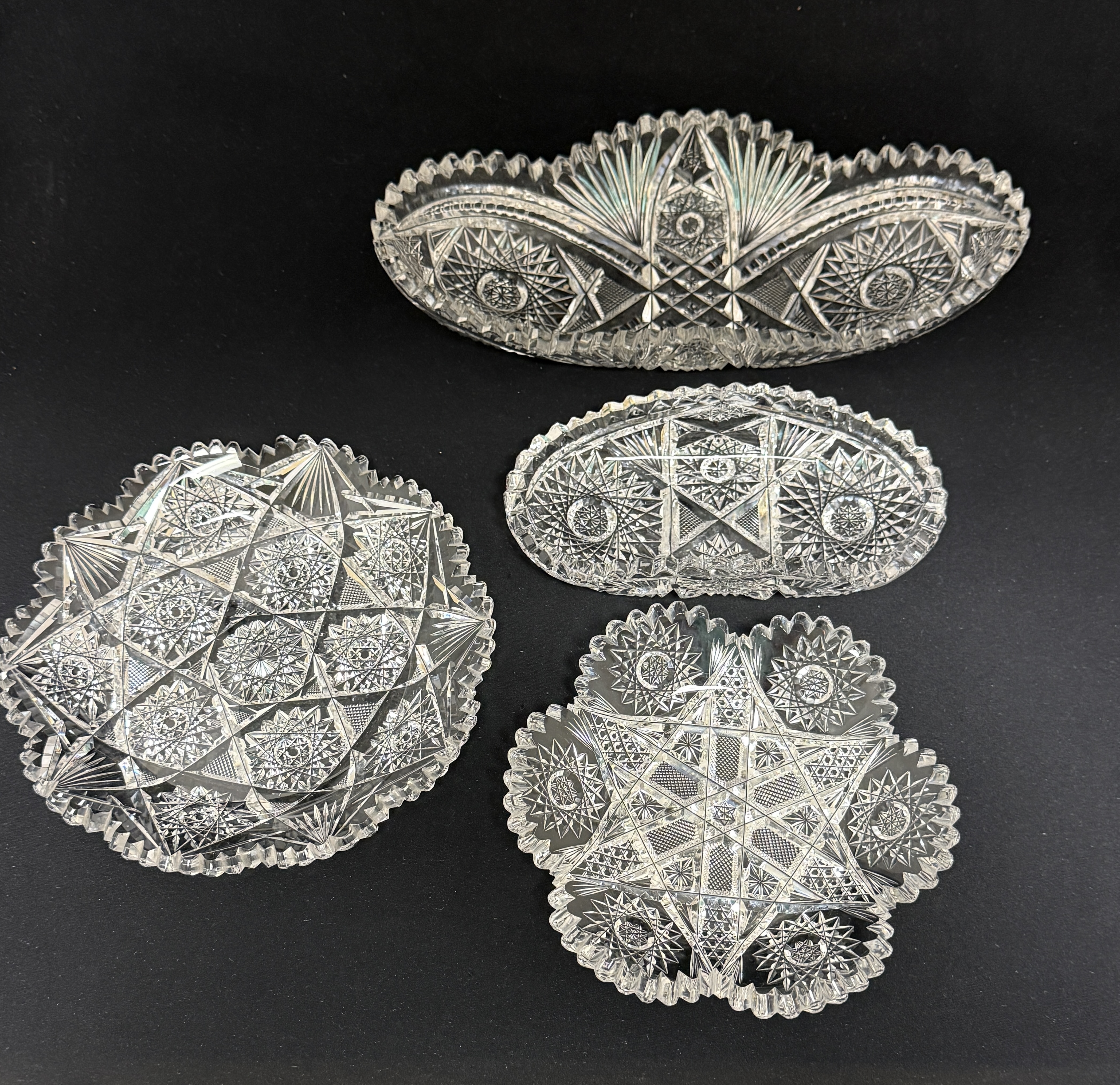 4 cut glass items, 2 trays and 2 bowls; longest length 11 1/8″. CONDITION: no chips, cracks, repairs, or material defects found, Jaremos attempts to call any material flaw that affects the price, but minor scratches and color variances are inherent to glass and antiques.