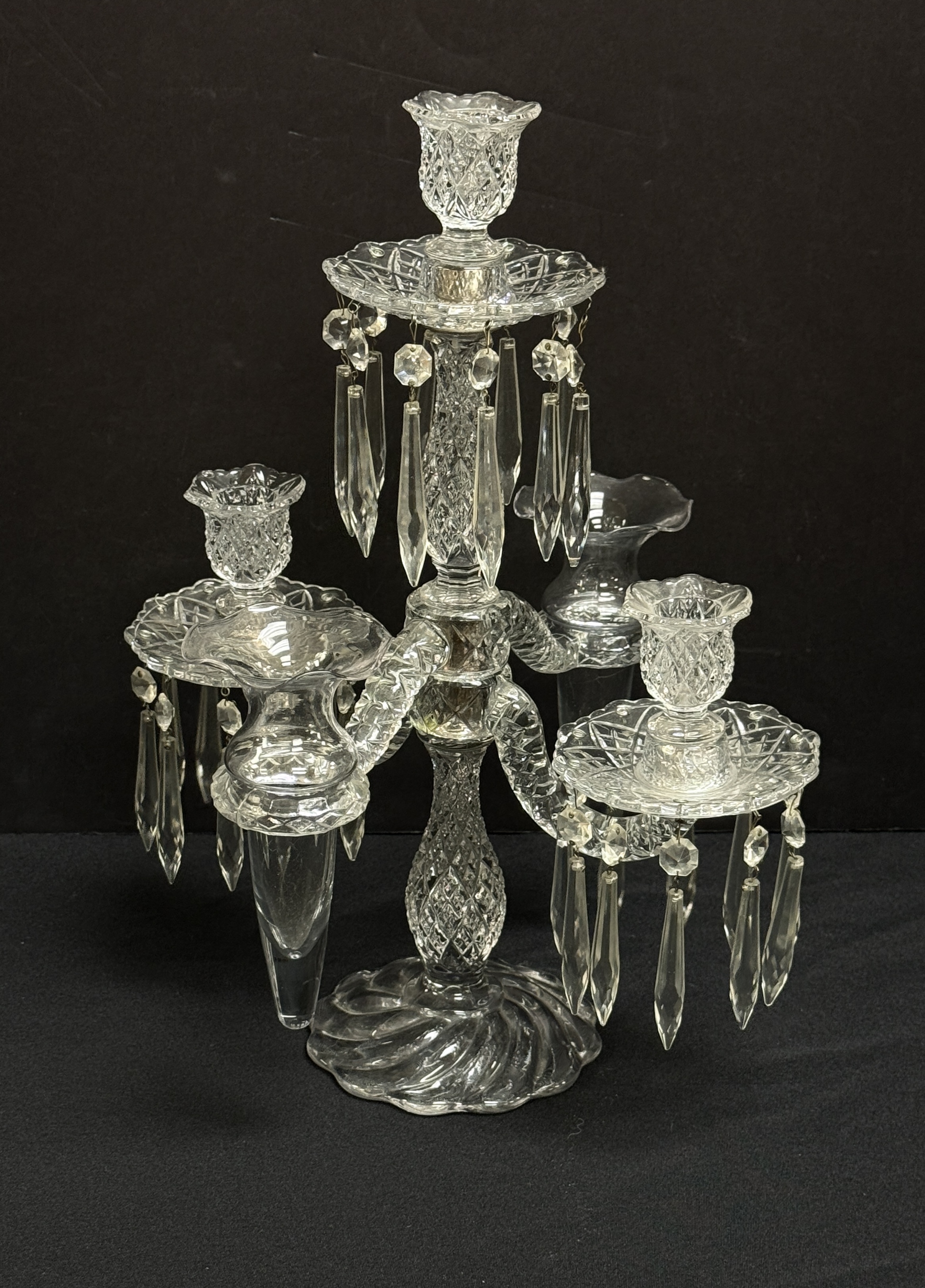 Cambridge candelabra/epergne with 3 holders with 2 side posey vases and prisms; ht. 17″. CONDITION: no chips, cracks, repairs, or material defects found, Jaremos attempts to call any material flaw that affects the price, but minor scratches and color variances are inherent to glass and antiques.