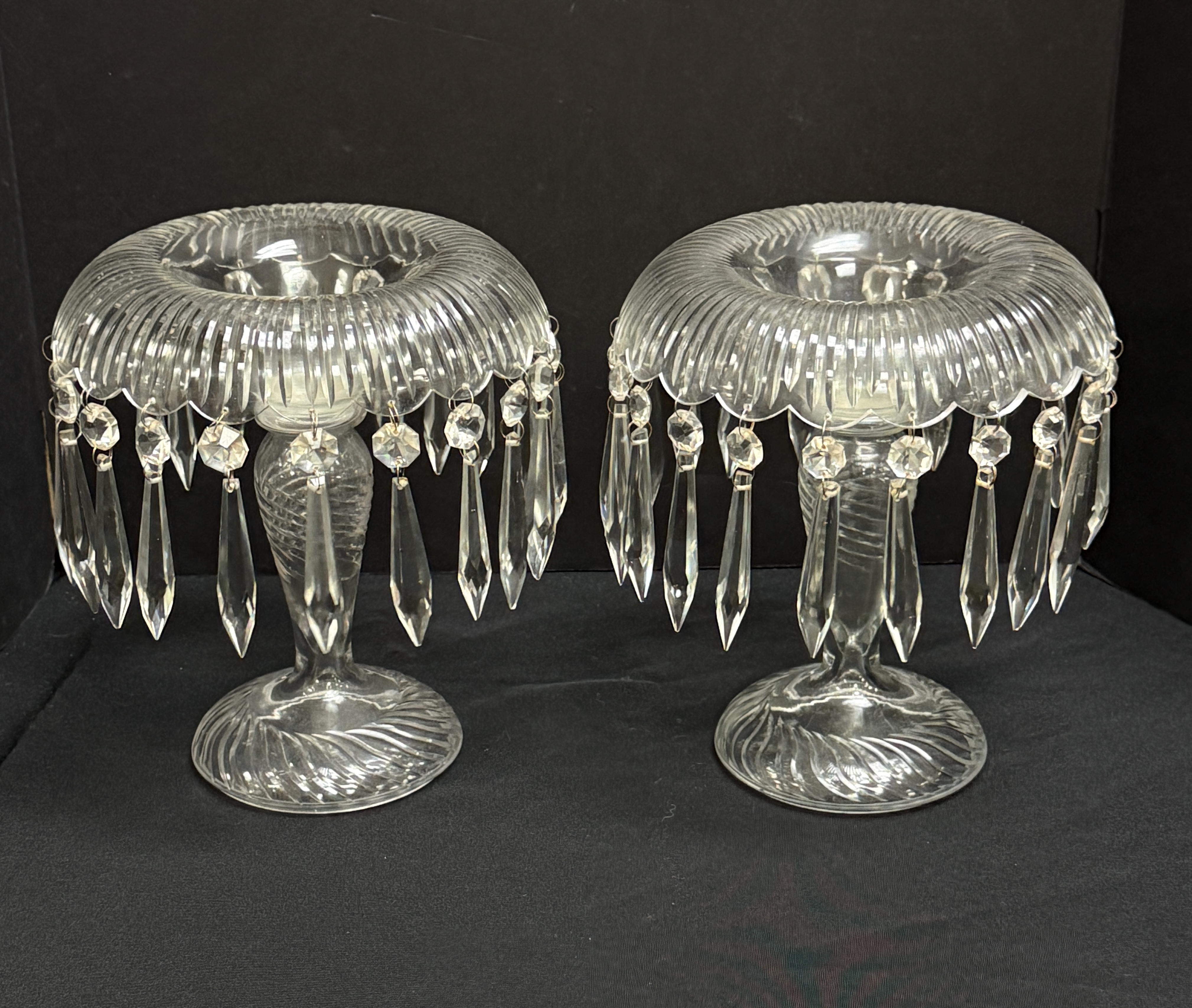 2 Cambridge compotes with prisms; ht. 11″. CONDITION: no chips, cracks, repairs, or material defects found, Jaremos attempts to call any material flaw that affects the price, but minor scratches and color variances are inherent to glass and antiques.