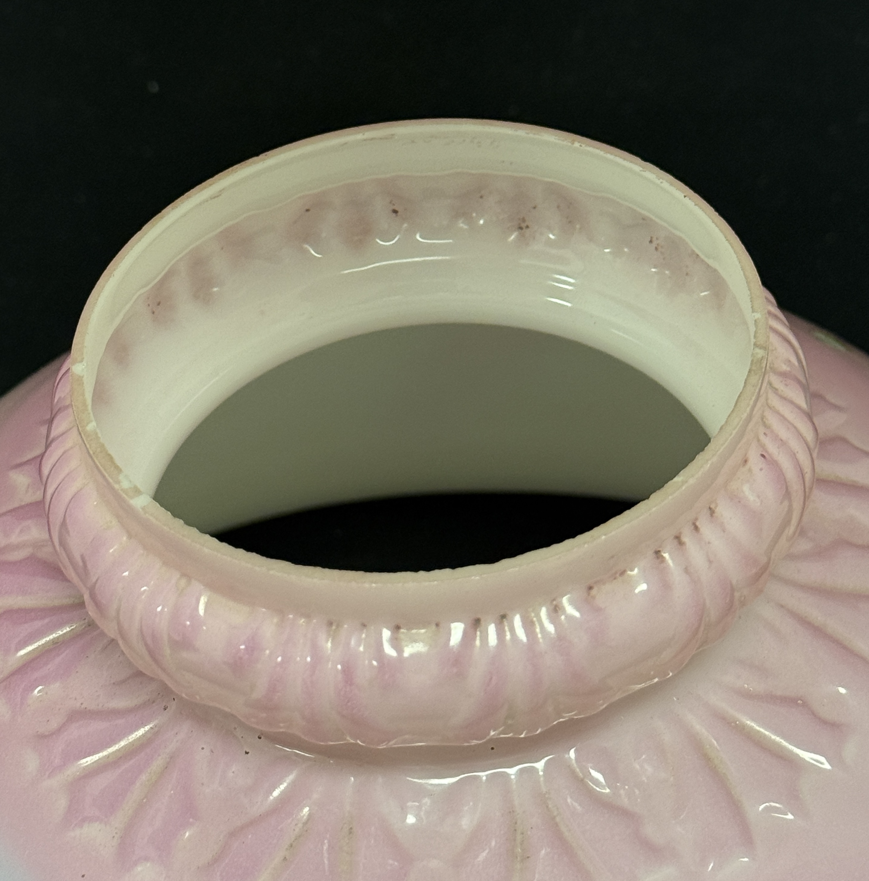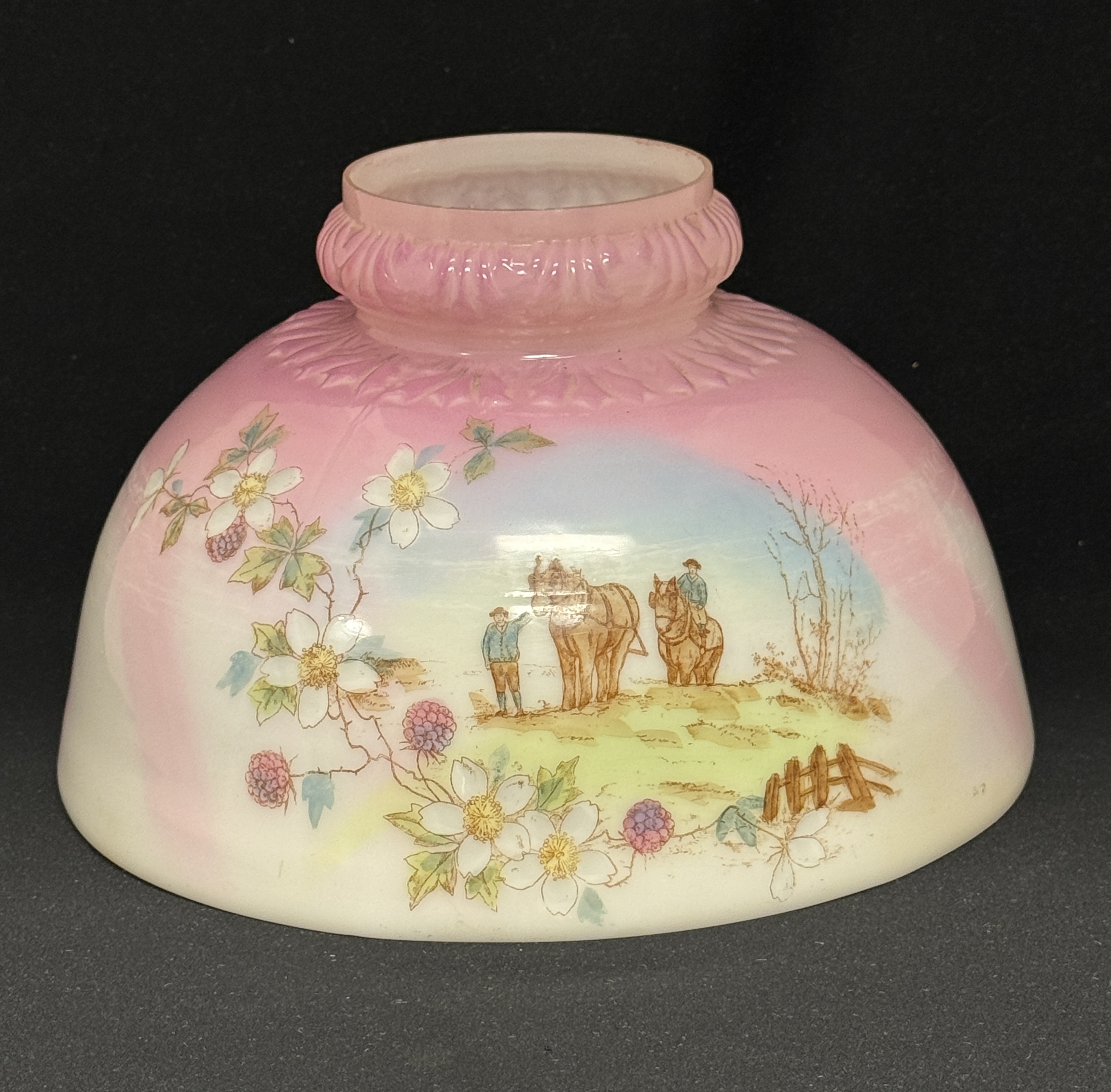 Victorian glass shade, pink with farm scene, 10″ wide. CONDITION: minor rim roughness see picture