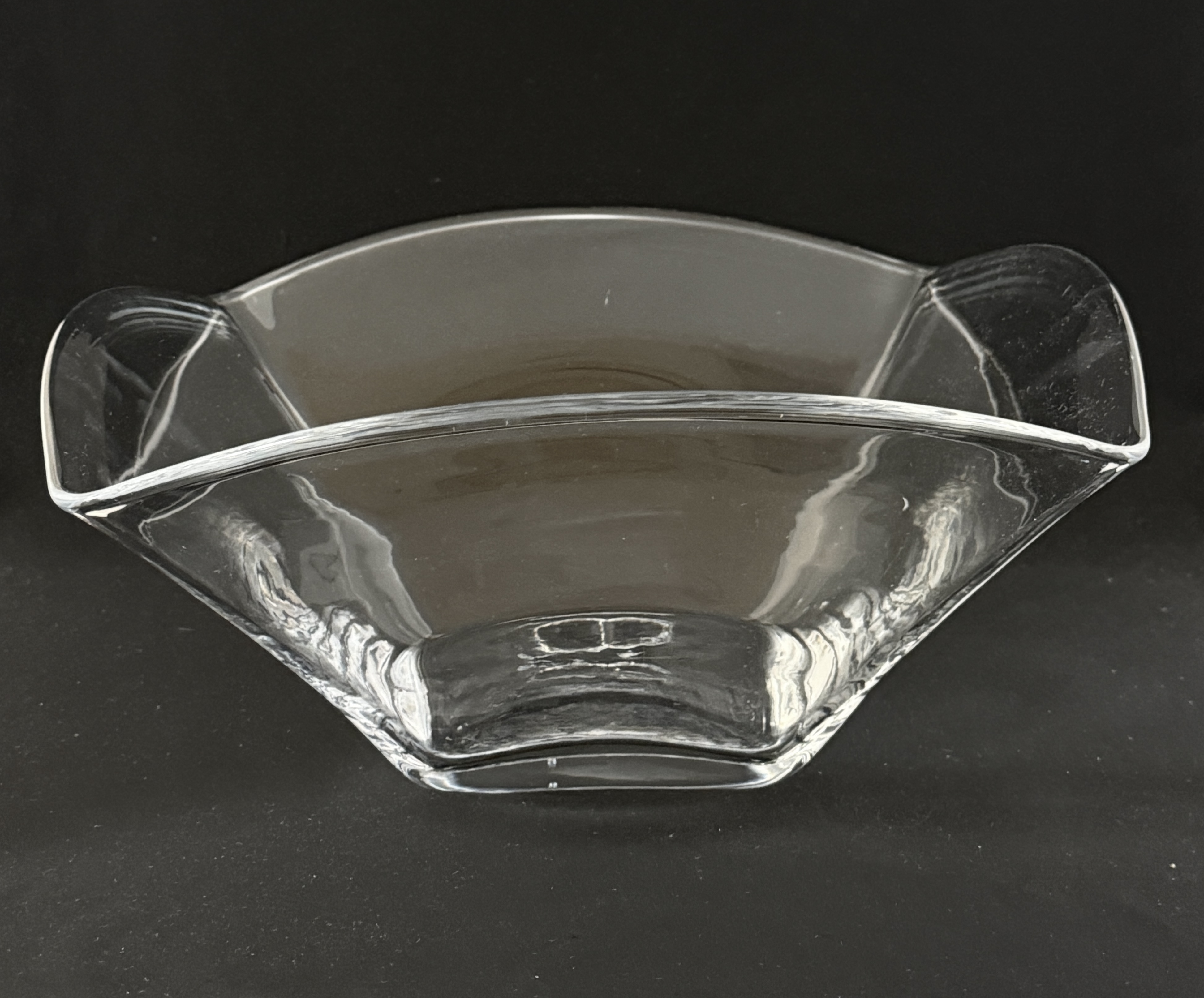 Simon Pearce large square bowl with scalloped rim, signed Simon Pearce; 13 1/4″ diameter. CONDITION: no chips, cracks, repairs, or material defects found, Jaremos attempts to call any material flaw that affects the price, but minor scratches and color variances are inherent to glass and antiques.
