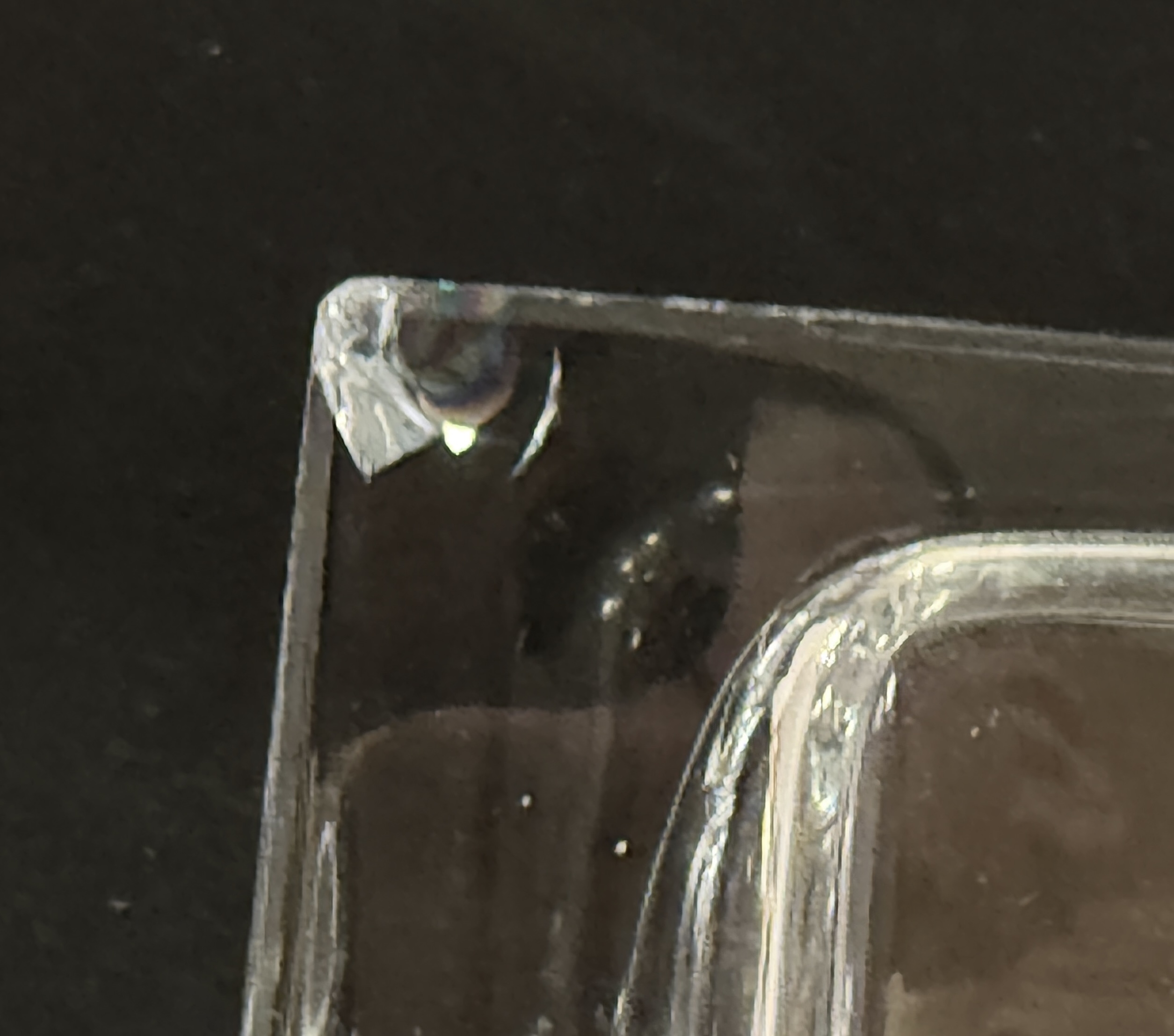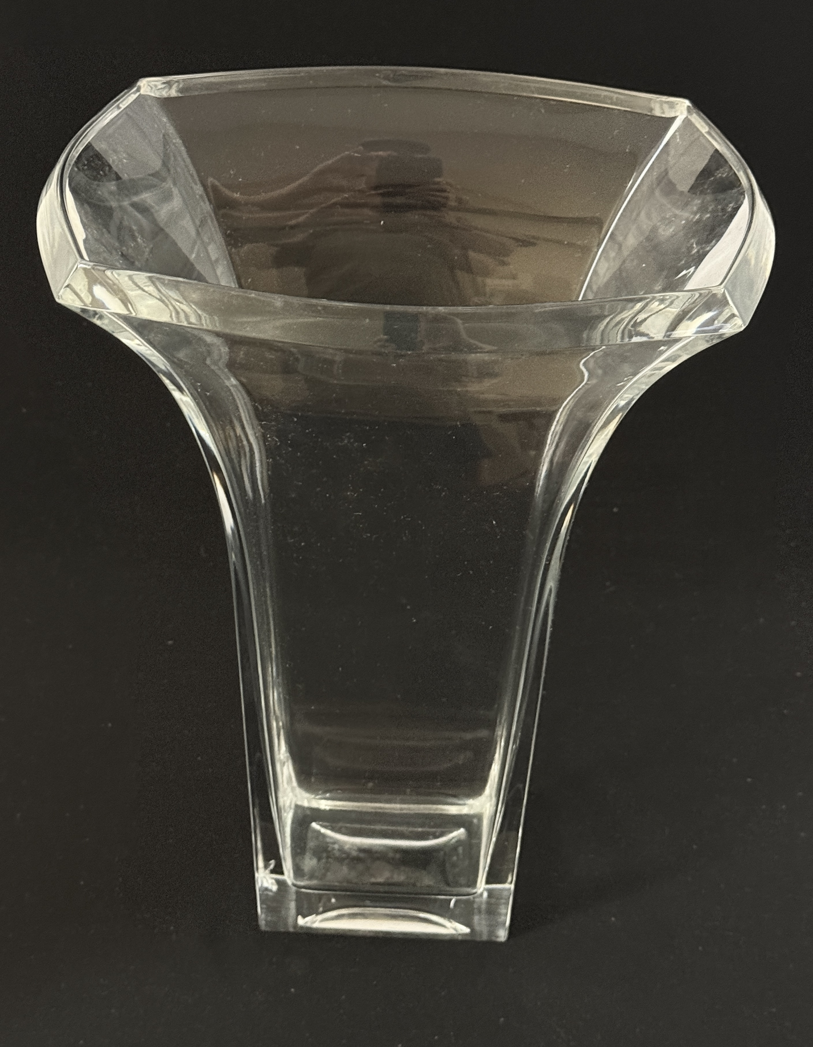 Tall crystal rectangular vase; 14″ ht. CONDITION: internal bruising and a small flea bite on base, see picture.