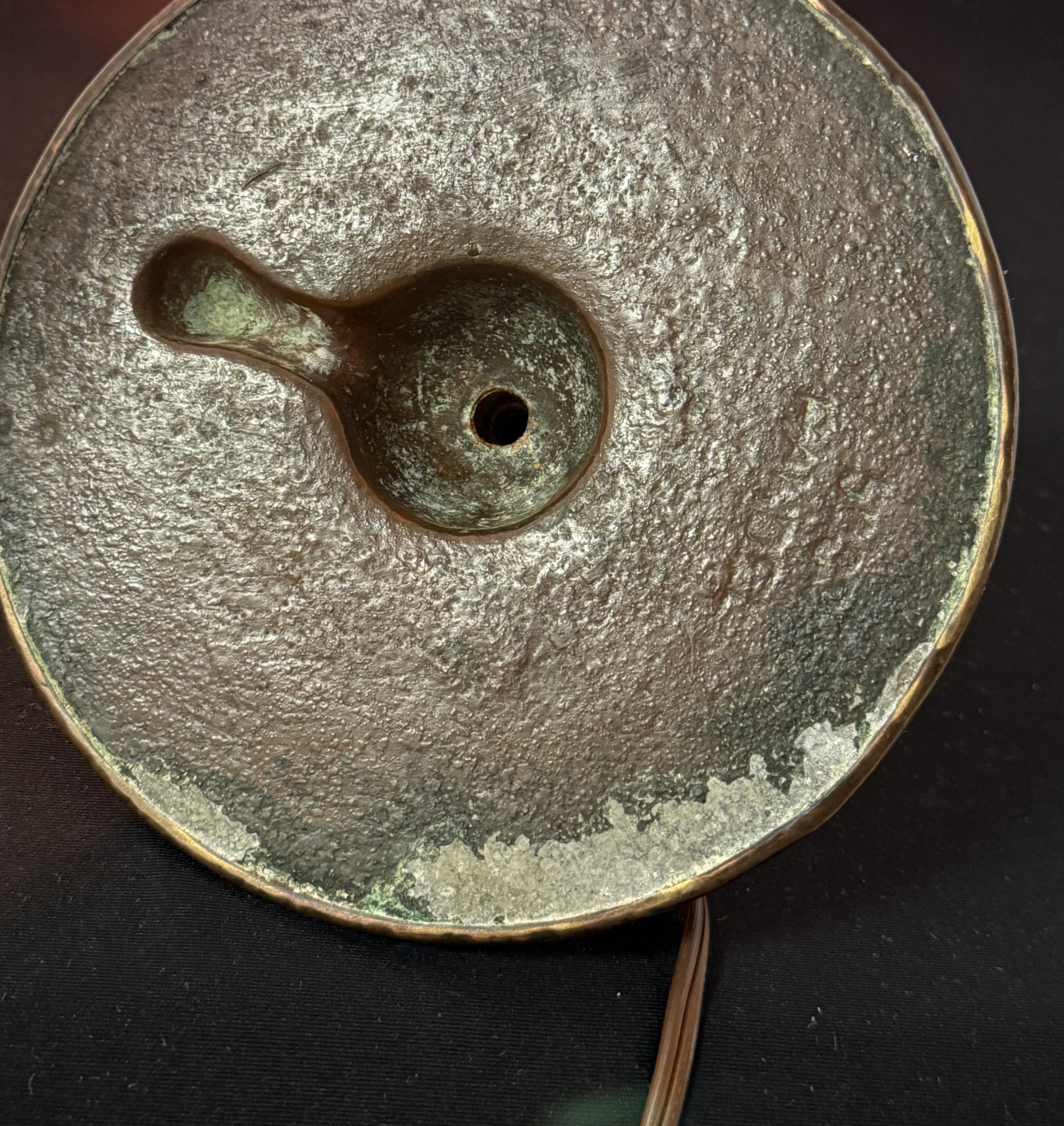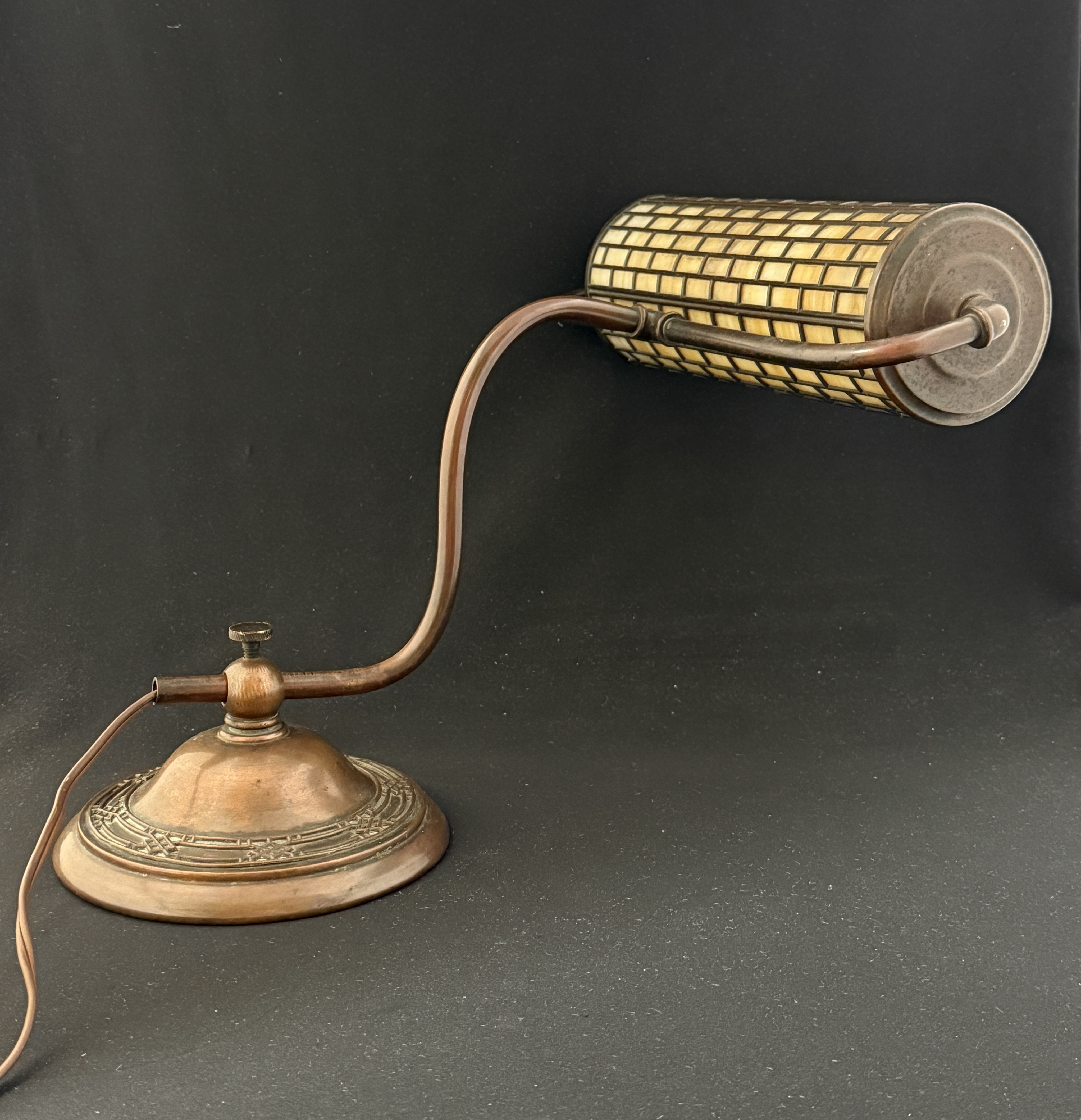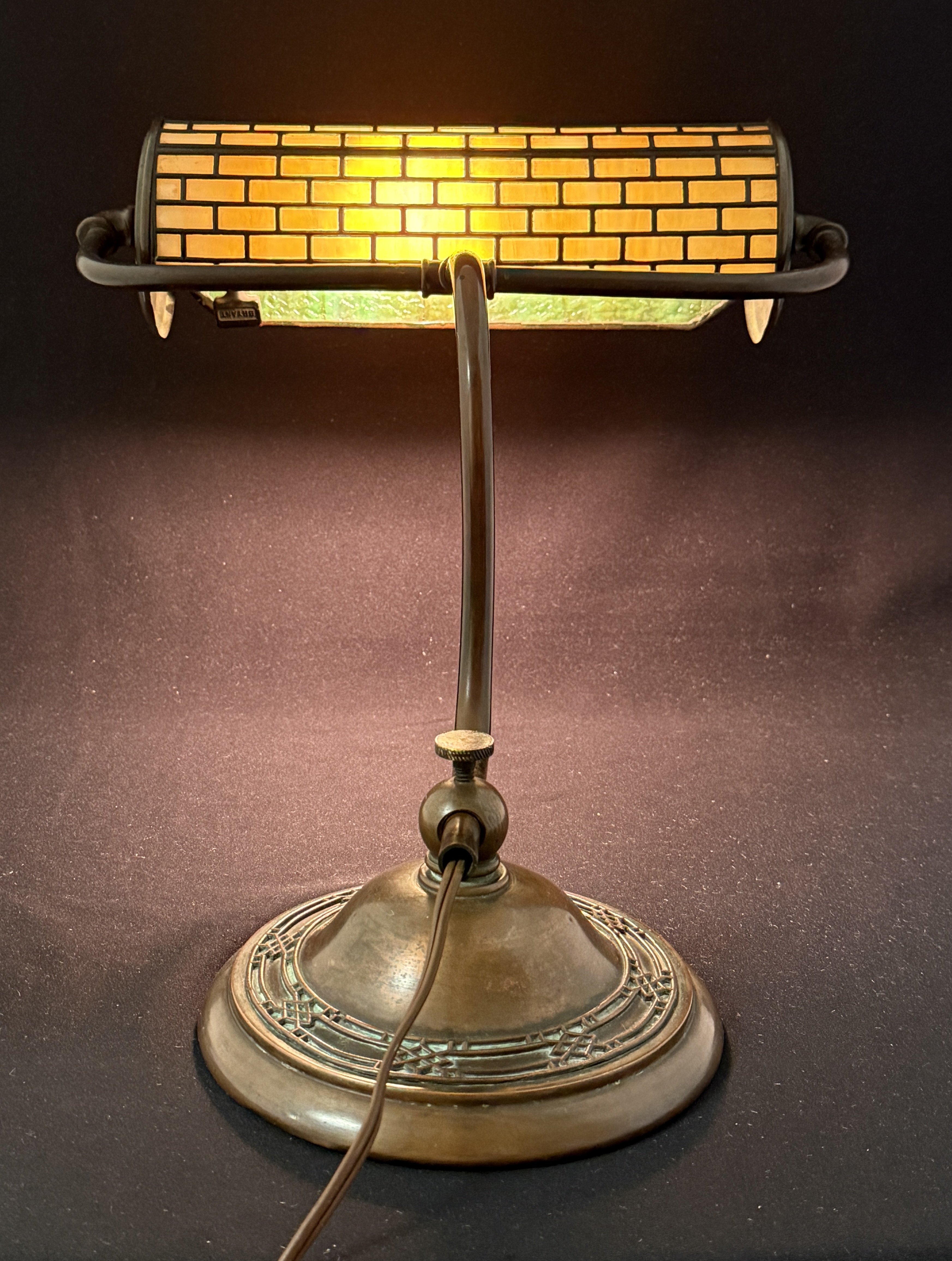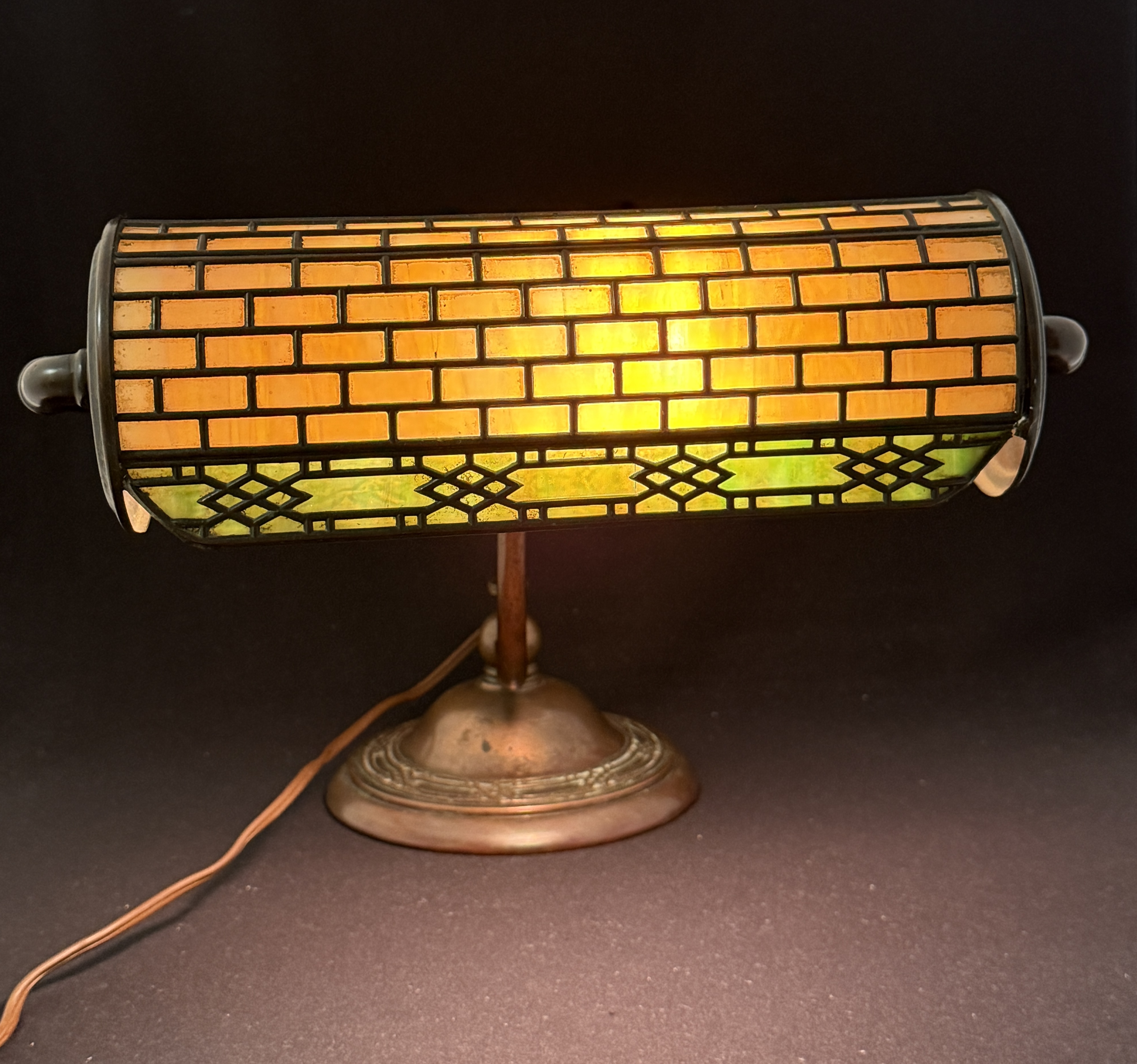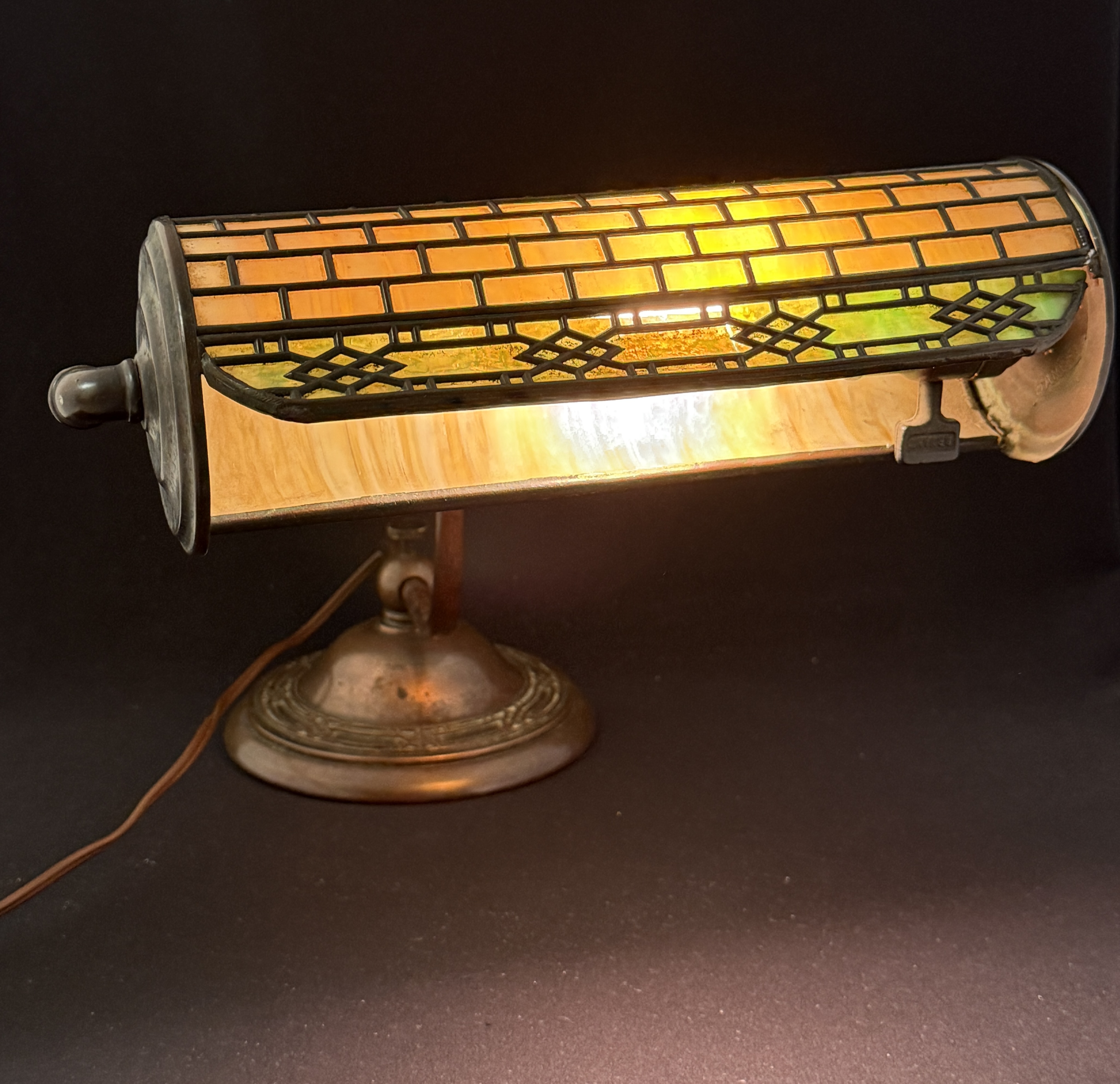 Handel bronze stained glass adjustable arm piano lamp with amber and green base, signed Handel; 11″ ht by 14″ long. CONDITION: no chips, cracks, repairs or material defects found, Jaremos attempts to call any material flaw that affects the price, but minor scratches and color variances are inherent to glass and antiques.