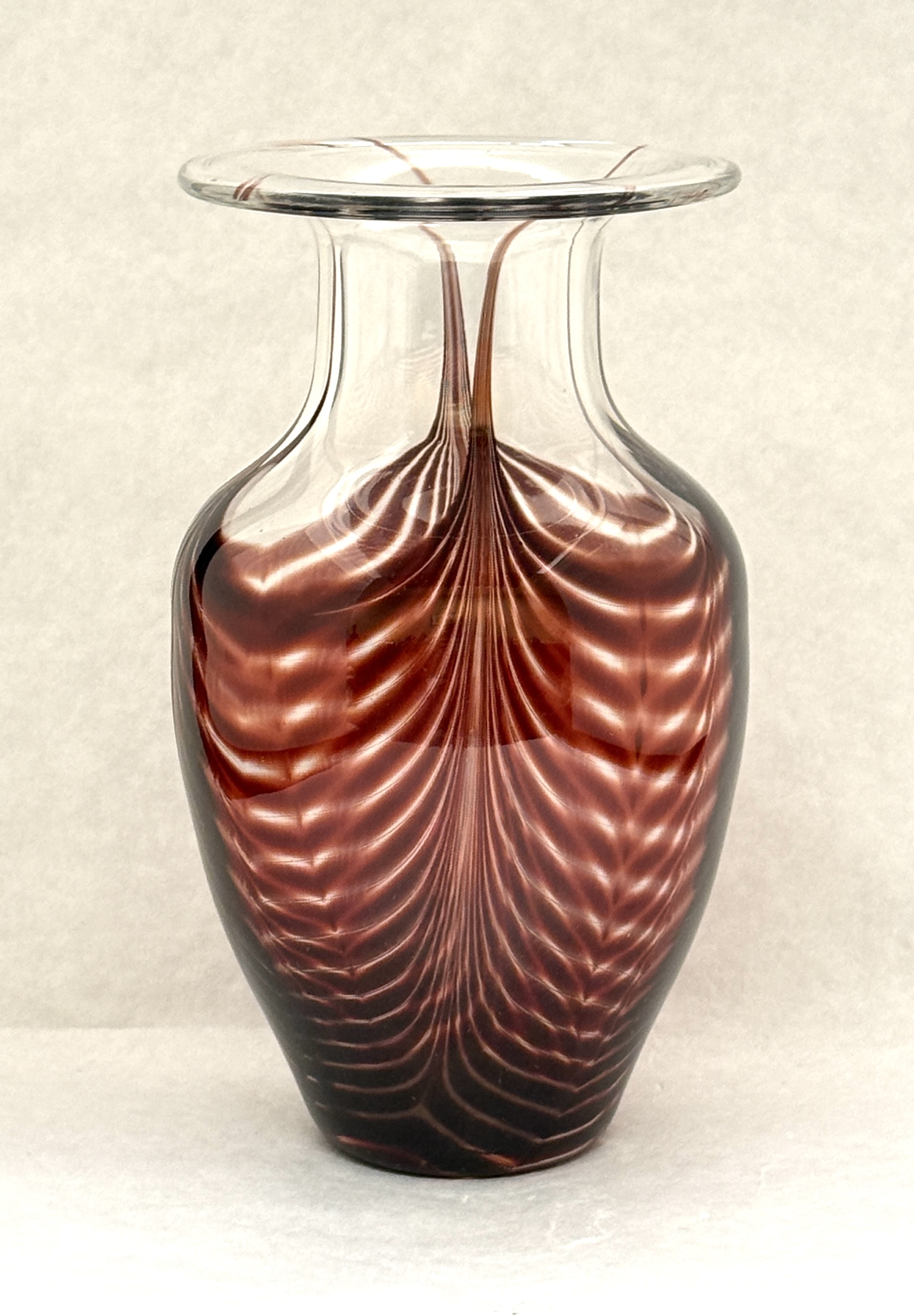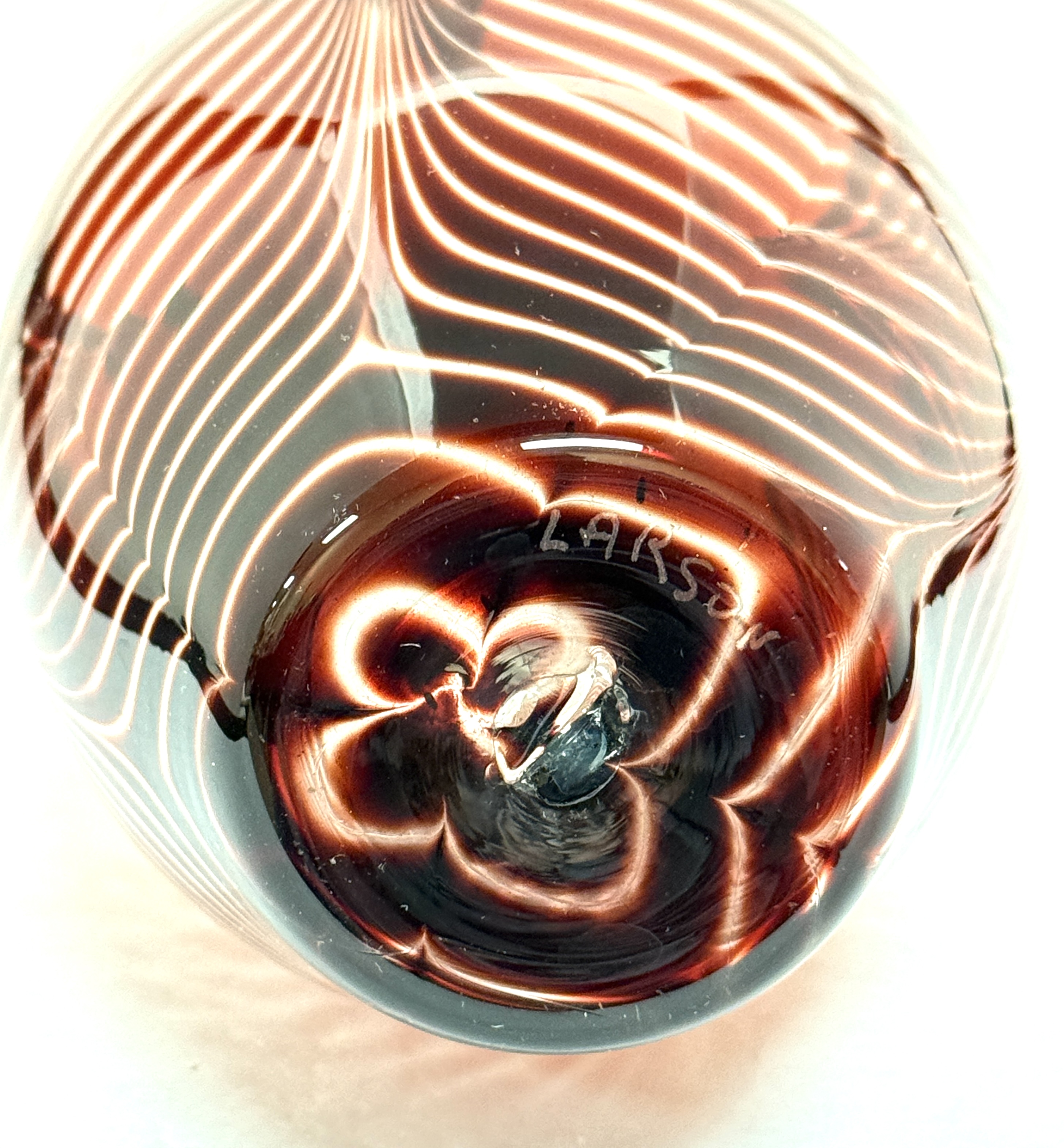 Translucent vase with red swags, signed Larson; ht 8 3/4″. CONDITION: no chips, cracks, repairs, or material defects found, Jaremos attempts to call any material flaw that affects the price, but minor scratches and color variances are inherent to glass and antiques.