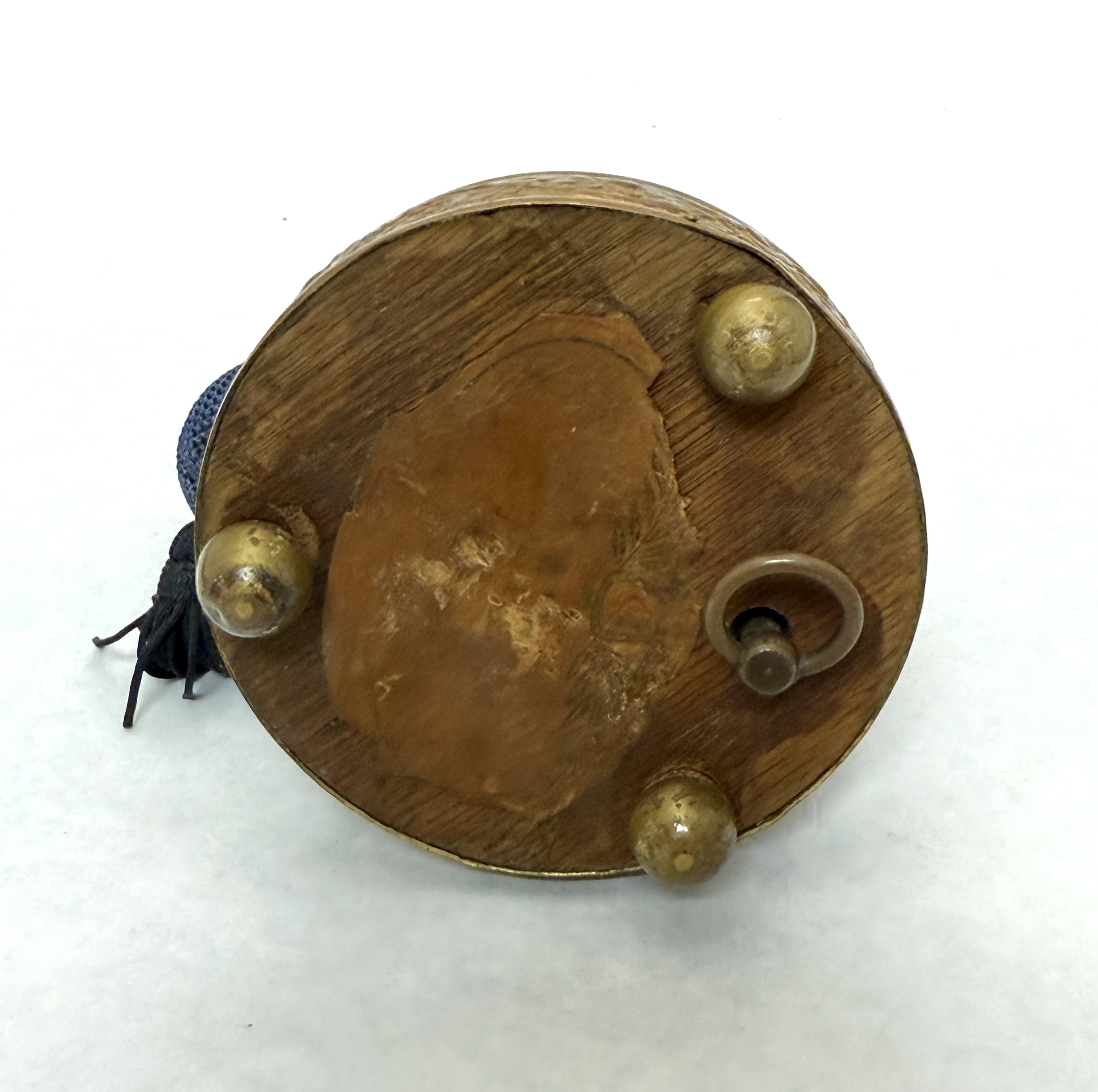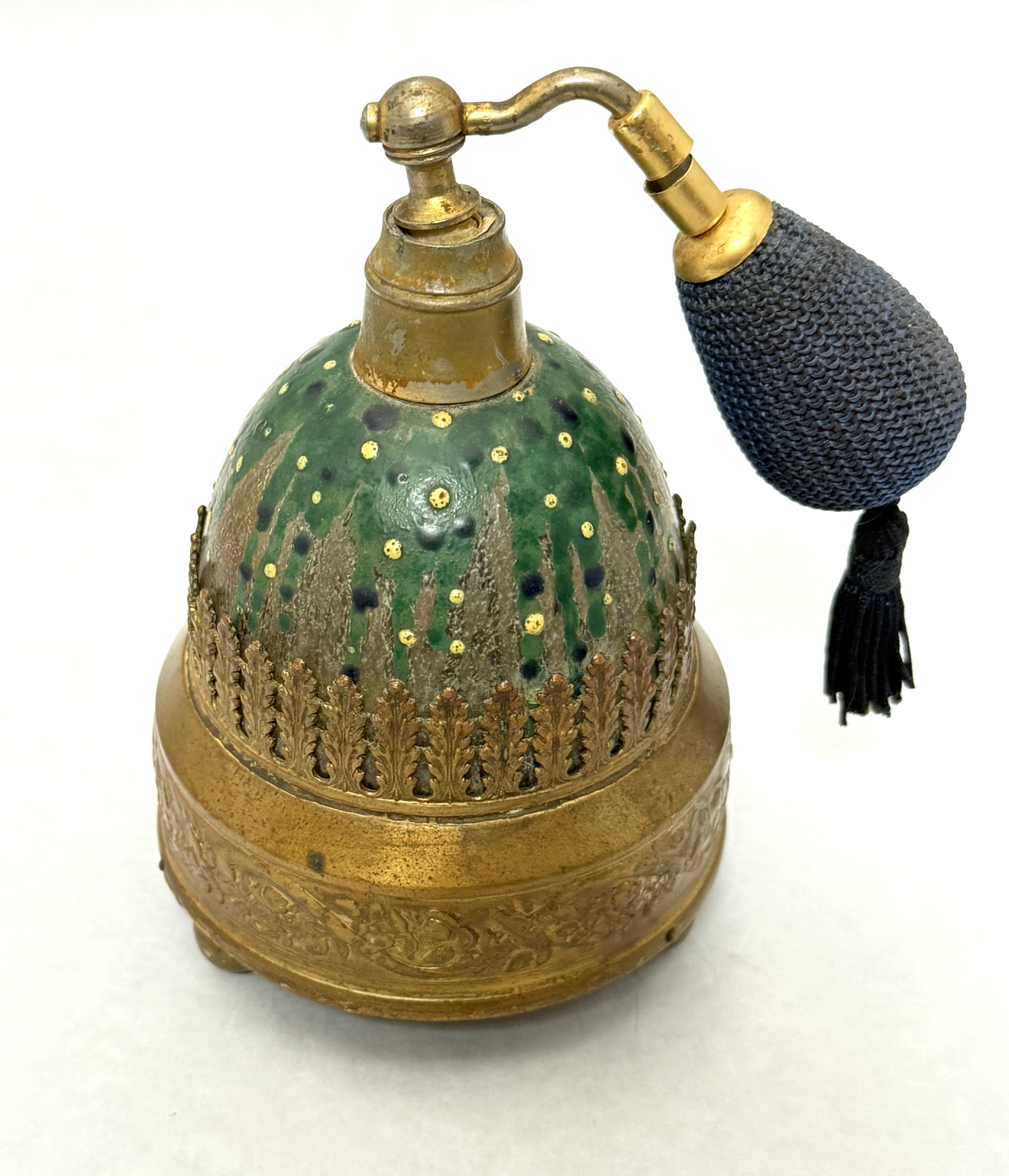 Attributed to Marcel Goupy mottled oviform enameled and cameo perfume bottle with atomizer decorated with enameled royal blue and white depicting berries and swags of green set in a metal music box, has an old paper label that is unreadable; ht 5 1/2″. CONDITION: no chips, cracks, repairs or material defects found, Jaremos attempts to call any material flaw that affects the price, but minor scratches and color variances are inherent to glass and antiques.
