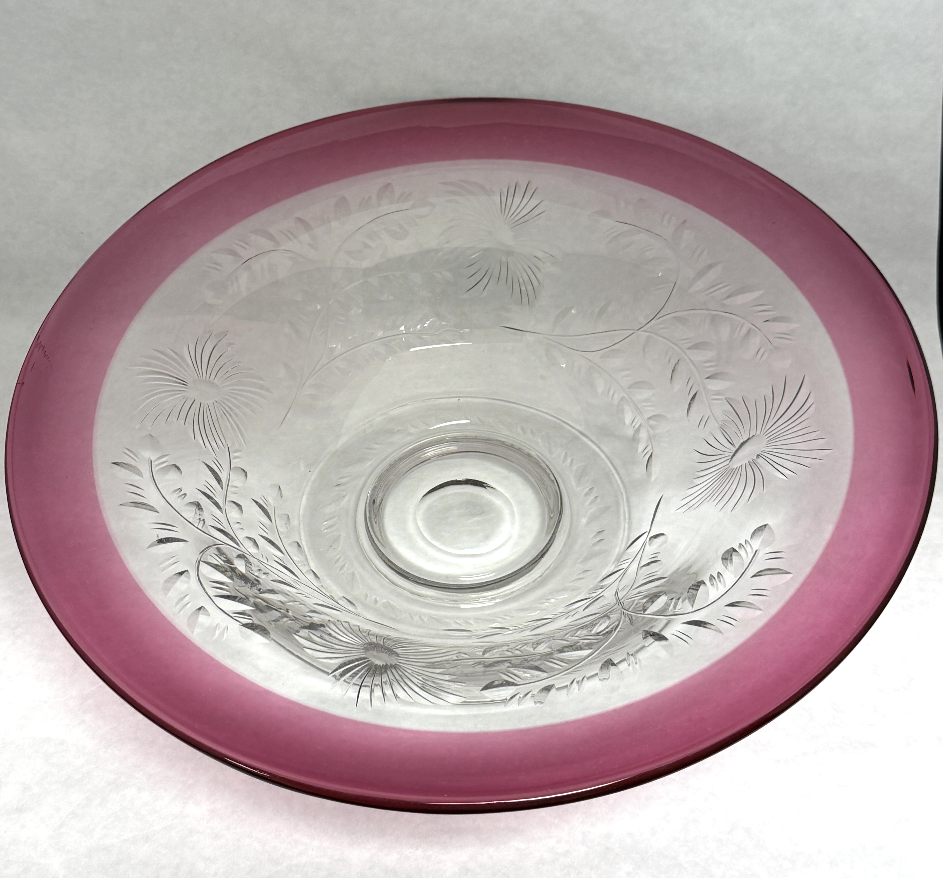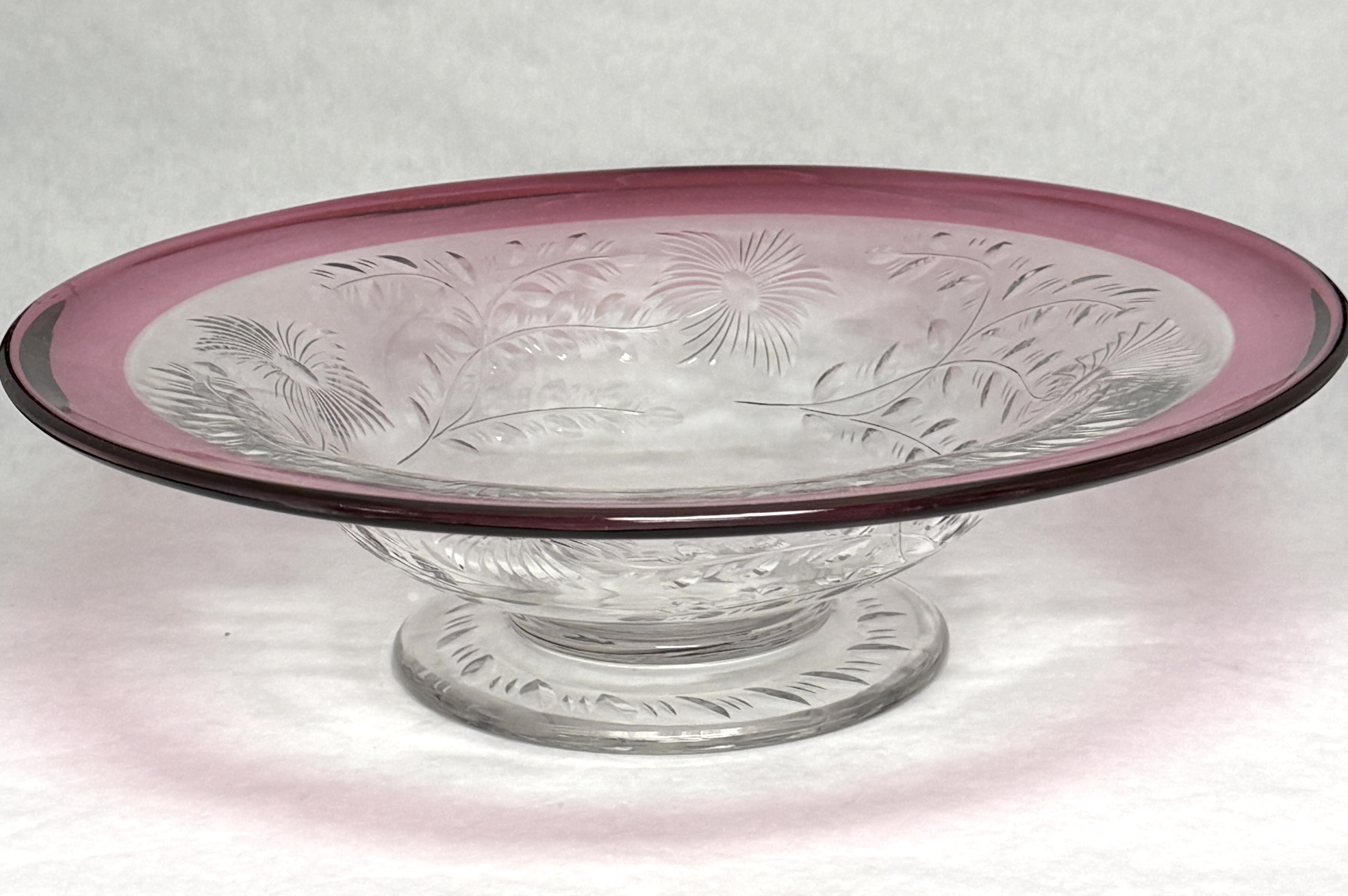 Pairpoint large central compote with flower etching and a red rim, 14″ wide. CONDITION: no chips, cracks, repairs or material defects found, Jaremos attempts to call any material flaw that affects the price, but minor scratches and color variances are inherent to glass and antiques.