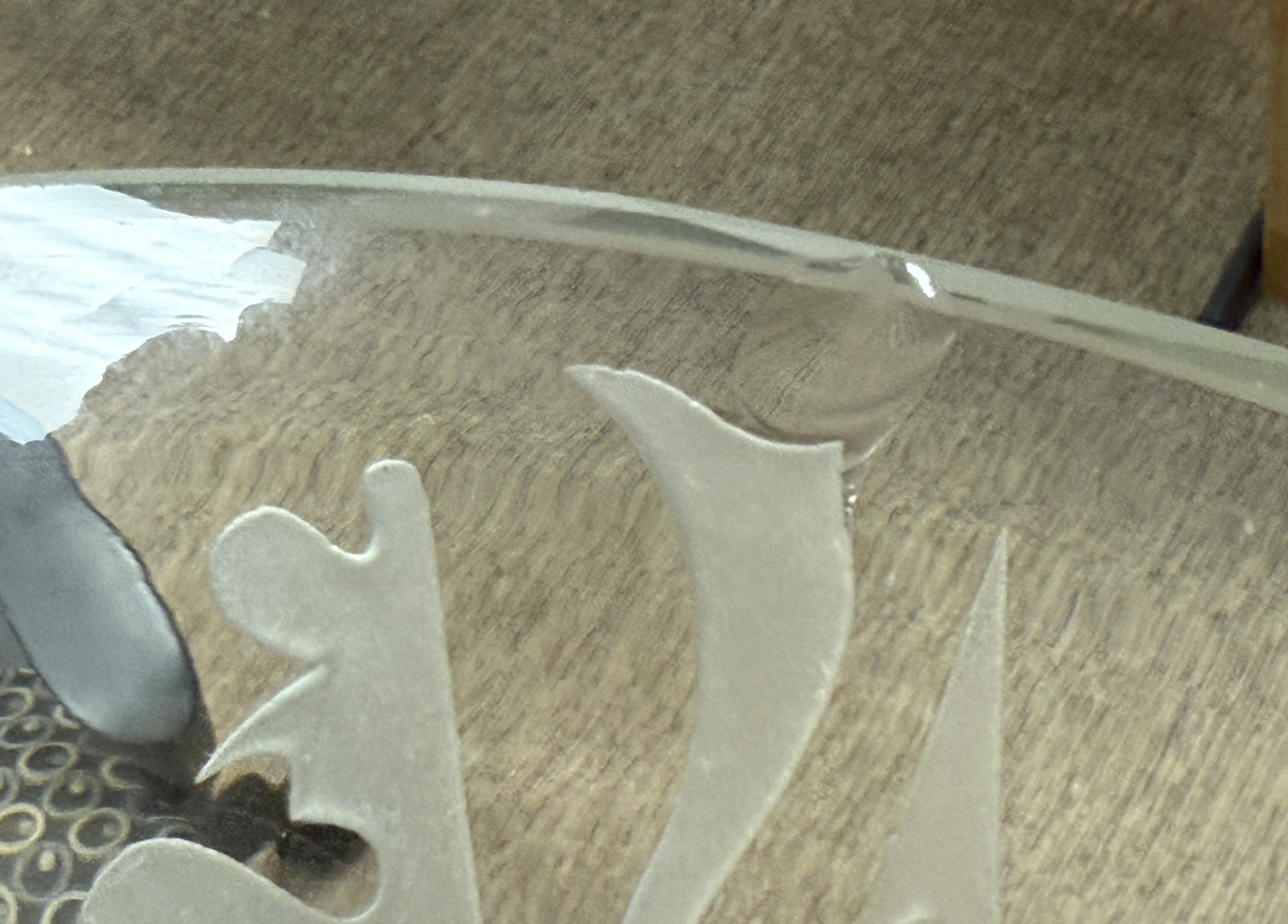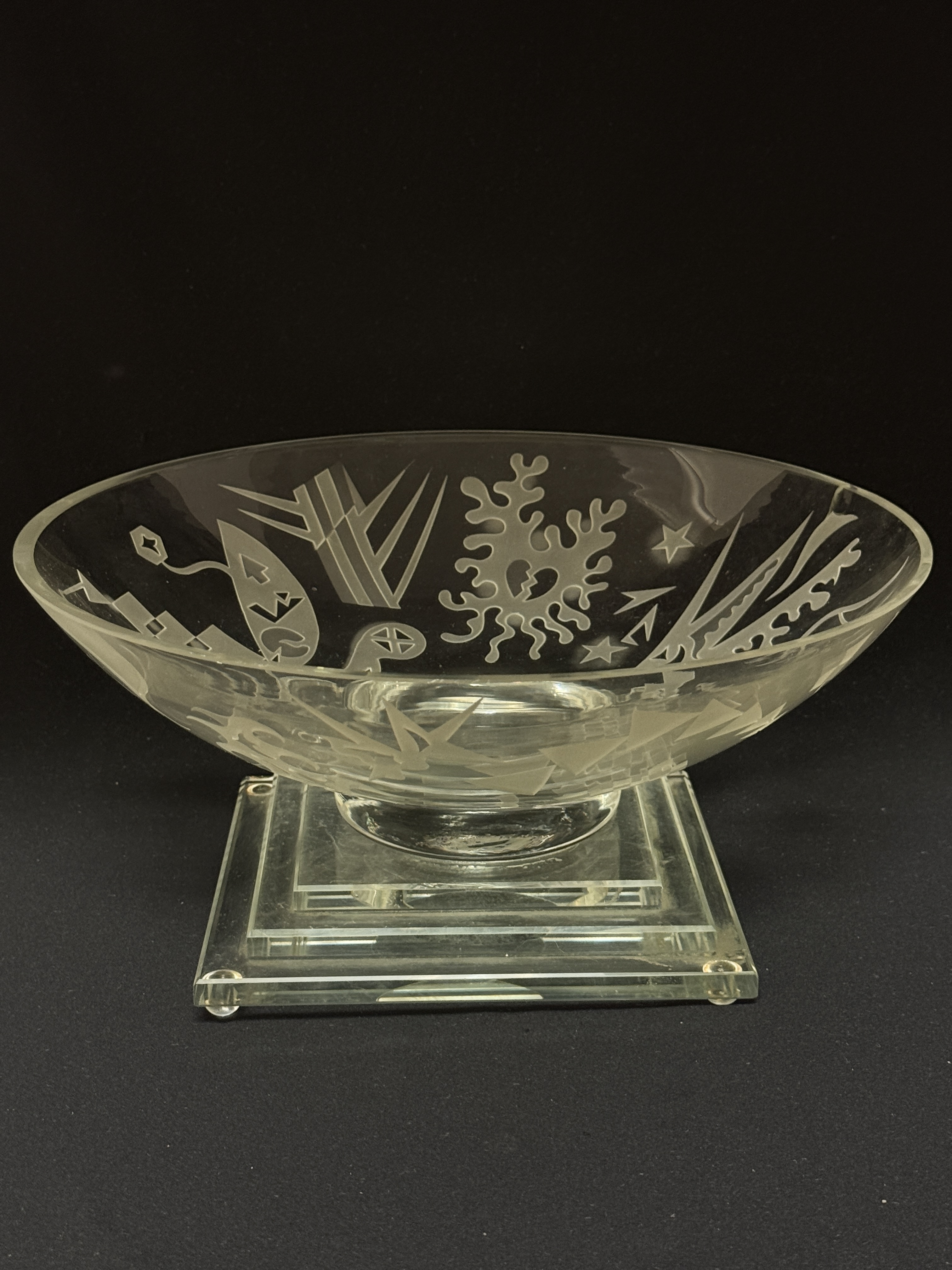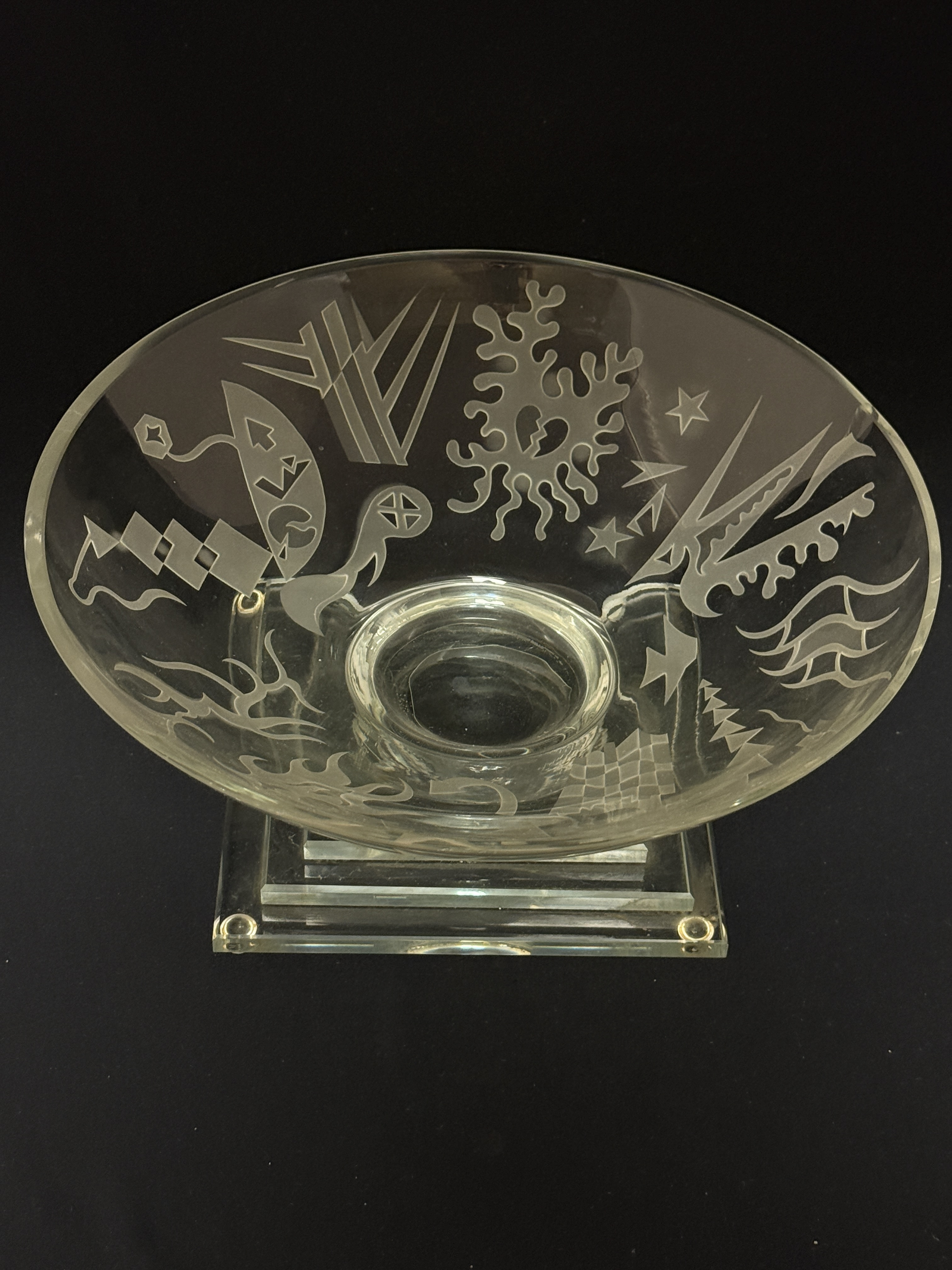J Anthony R etched bowl on 3 stair step square base, geometric etchings; diameter 11 7/8″ ht 5 3/4″. CONDITION: large chip on rim.