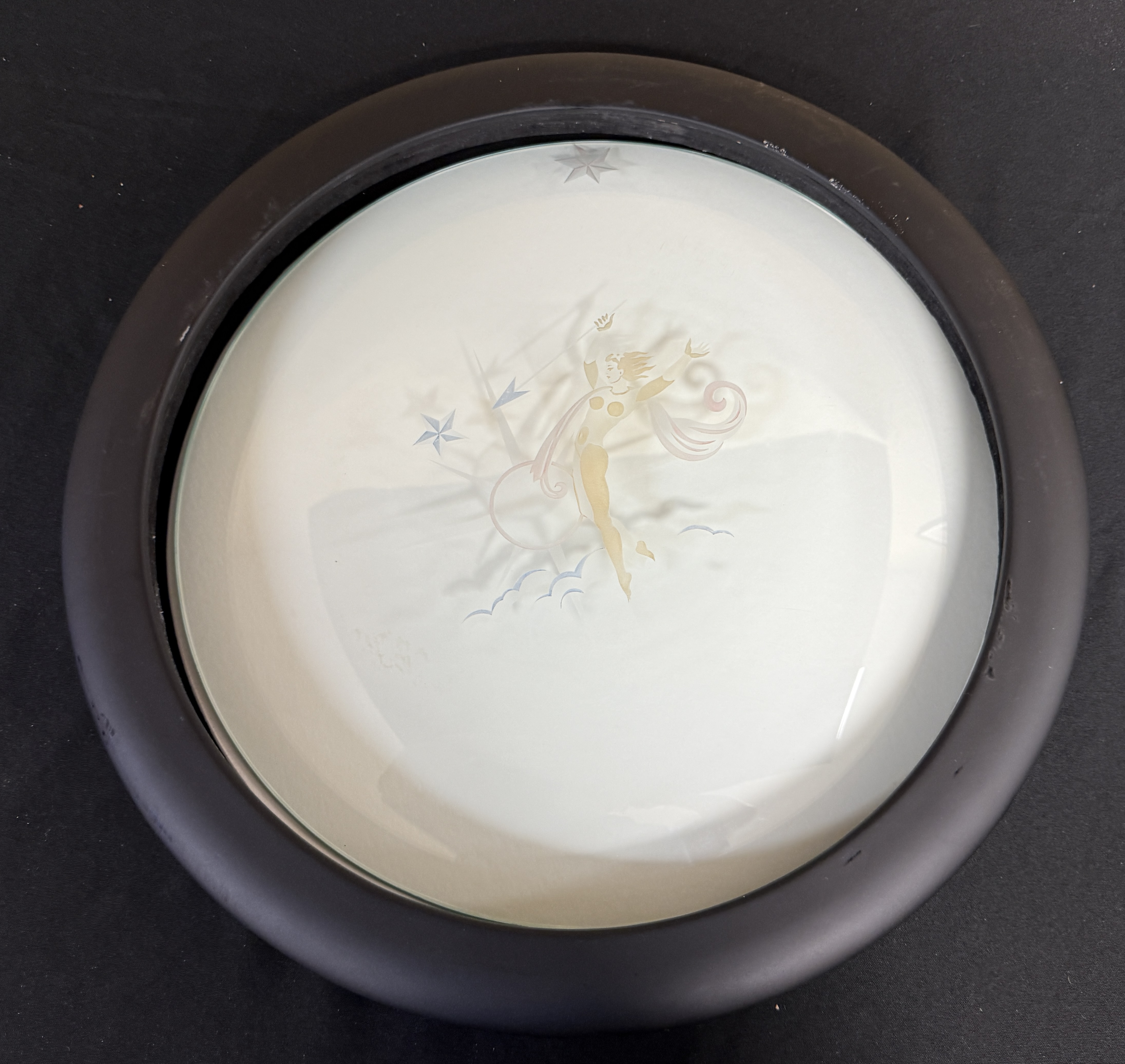 Franz Grosz clear plate, etched with art deco figure with frame, signed Franz Grosz; site 19″. NOTE: out of frame. CONDITION: no chips, cracks, repairs or material defects found, Jaremos attempts to call any material flaw that affects the price, but minor scratches and color variances are inherent to glass and antiques.