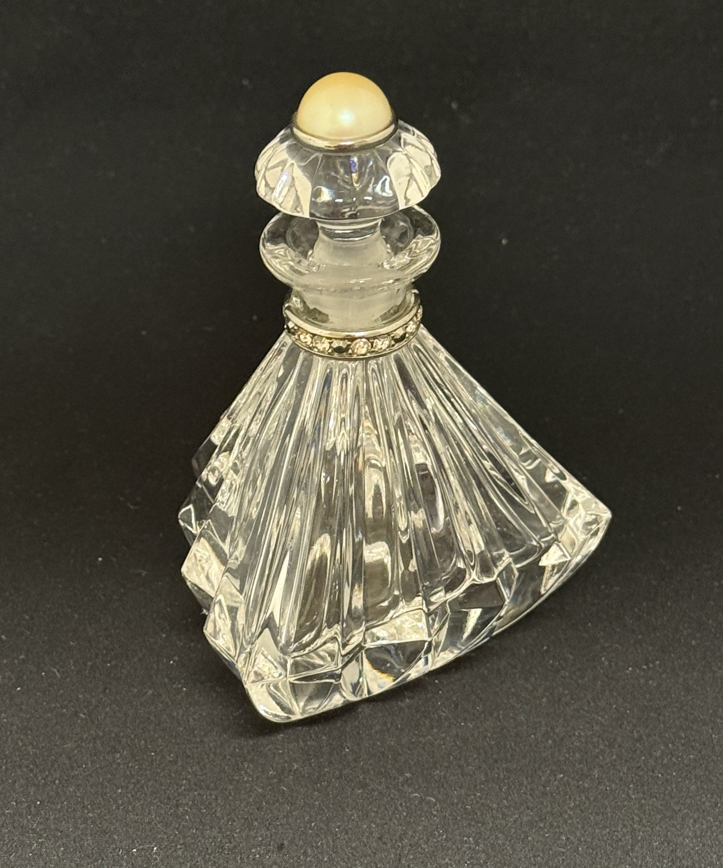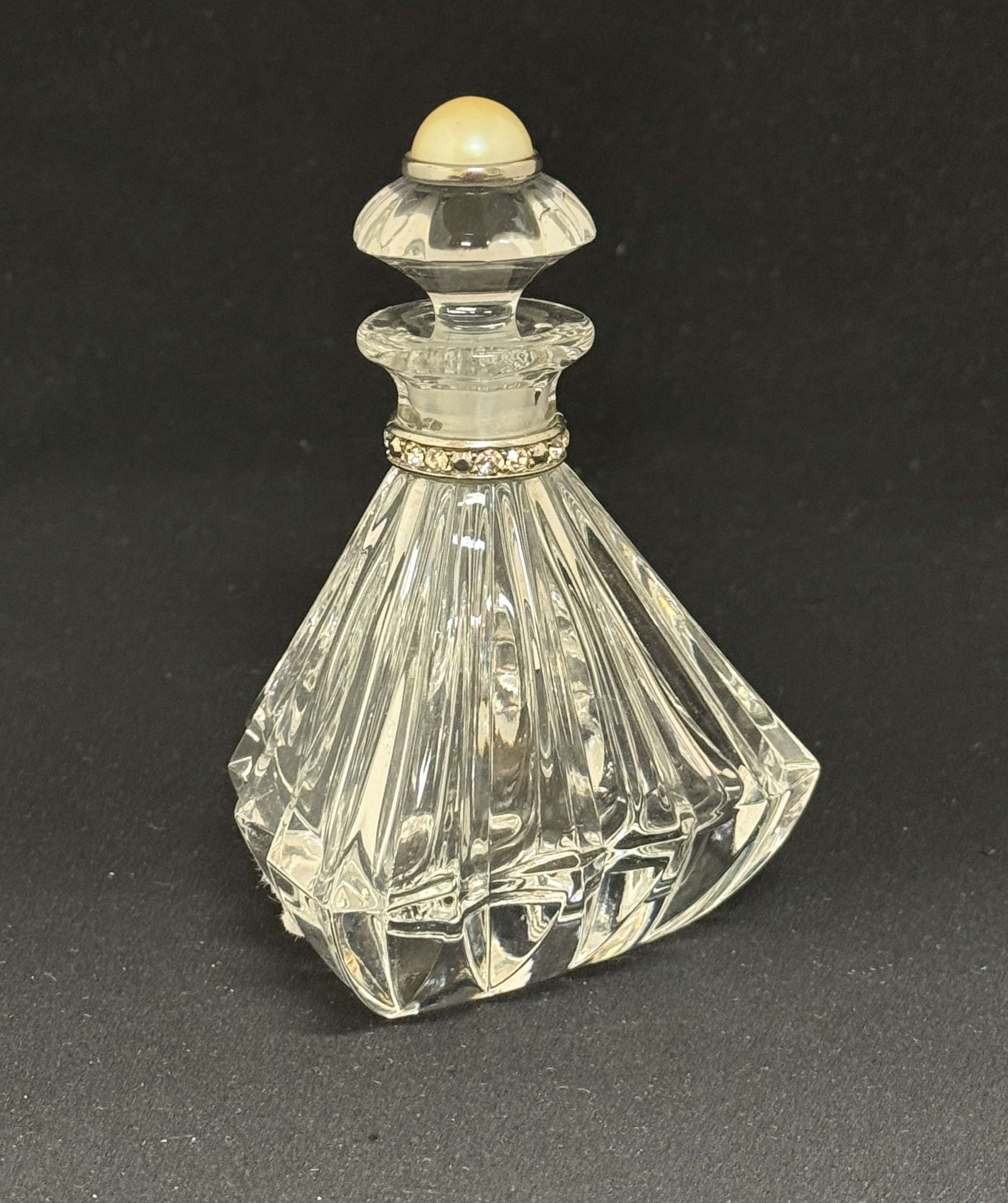 Czech Republic crystal perfume with pearl on stopper; ht. 5 3/4″. CONDITION: no chips, cracks, repairs, or material defects found, Jaremos attempts to call any material flaw that affects the price, but minor scratches and color variances are inherent to glass and antiques.