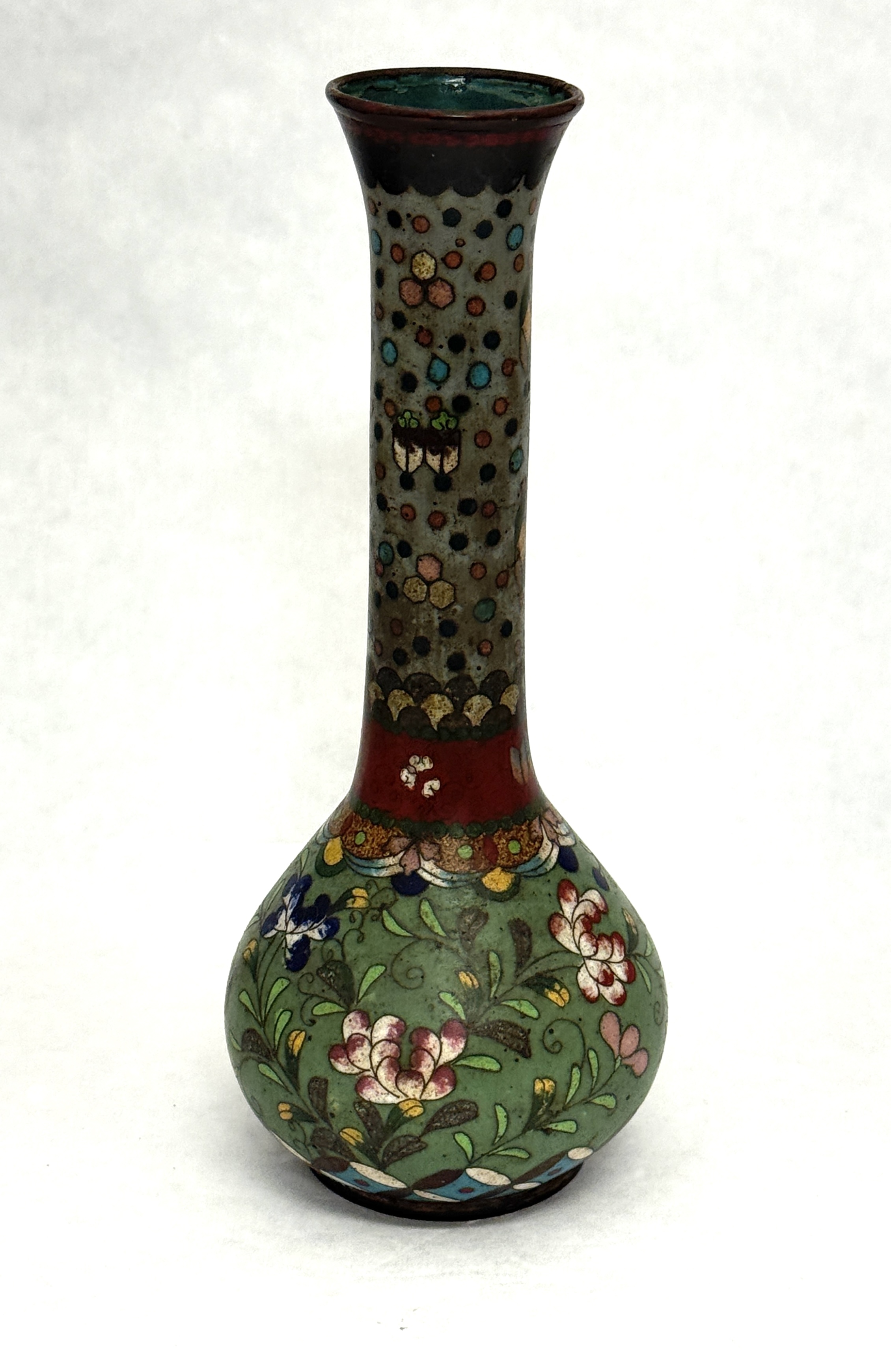 Cloisonne stick vase green with flowers and copper rim; ht. 7 3/8″. CONDITION: no chips, cracks, repairs or material defects found, Jaremos attempts to call any material flaw that affects the price, but minor scratches and color variances are inherent to glass and antiques.