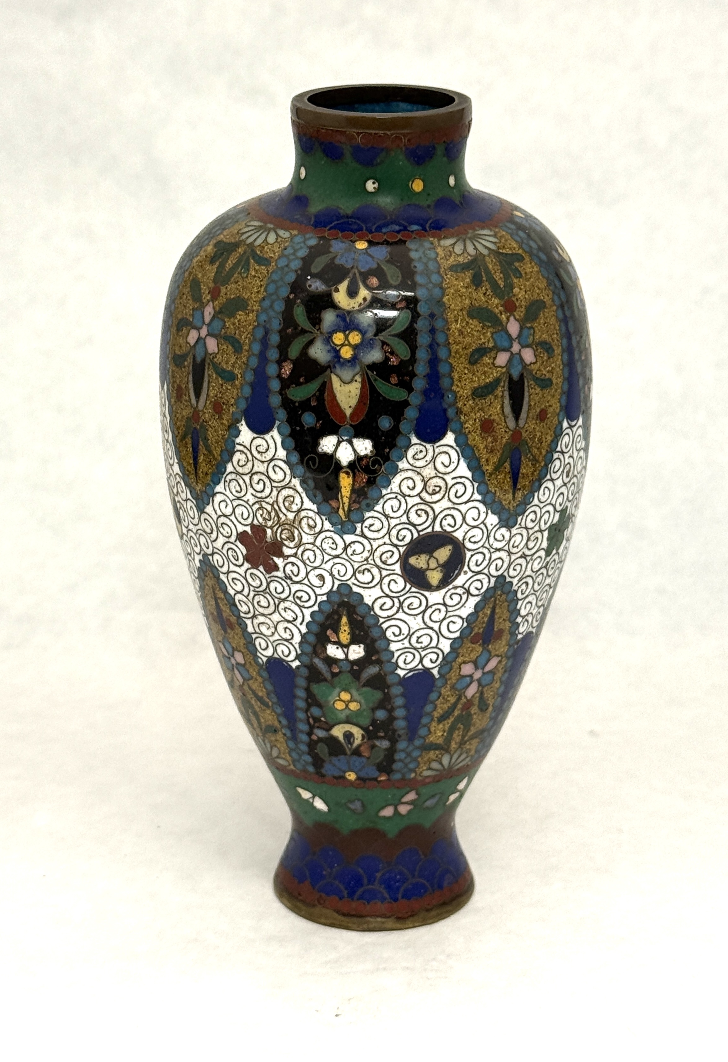 Cloisonne shouldered vase with Moorish design; ht. 6″. CONDITION: no chips, cracks, repairs or material defects found, Jaremos attempts to call any material flaw that affects the price, but minor scratches and color variances are inherent to glass and antiques.