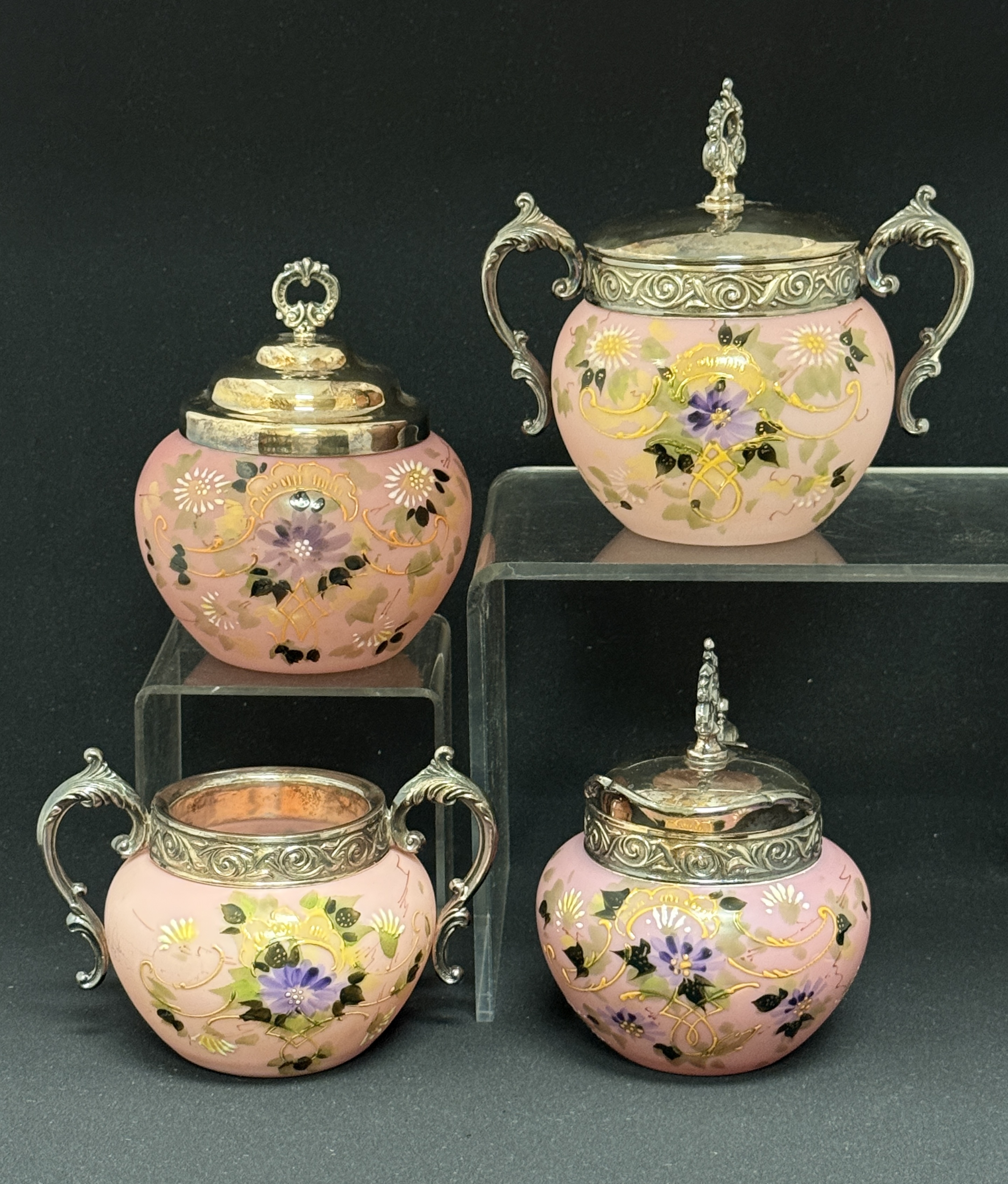 Fireglow condiment set, 6″ ht. CONDITION: no chips, cracks, repairs, or material defects found, Jaremos attempts to call any material flaw that affects the price, but minor scratches and color variances are inherent to glass and antiques.