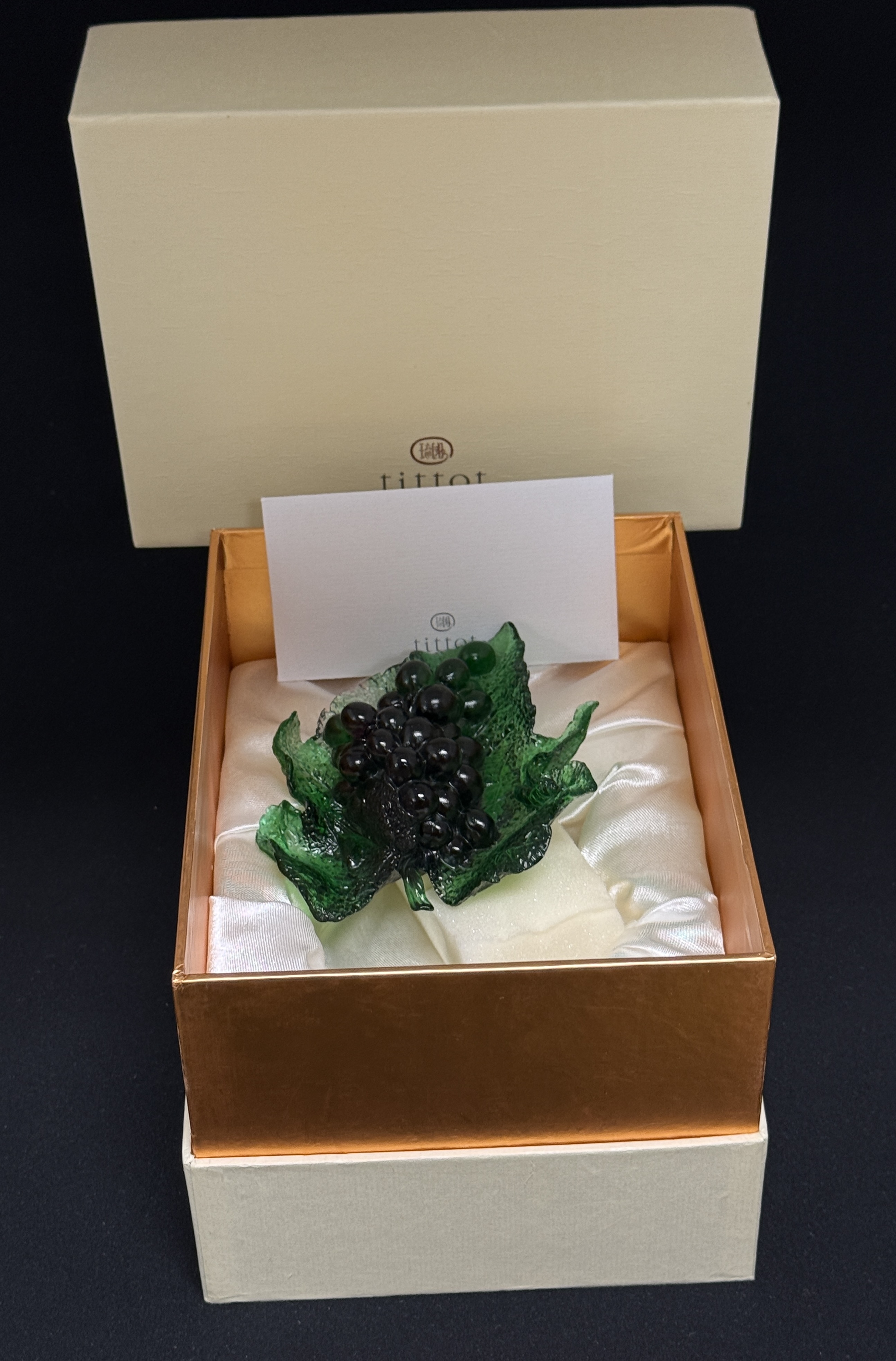 Tittot glass sculpture “Sweetness” with gift box; ht. 5 1/2″. CONDITION: no chips, cracks, repairs or material defects found, Jaremos attempts to call any material flaw that affects the price, but minor scratches and color variances are inherent to glass and antiques.