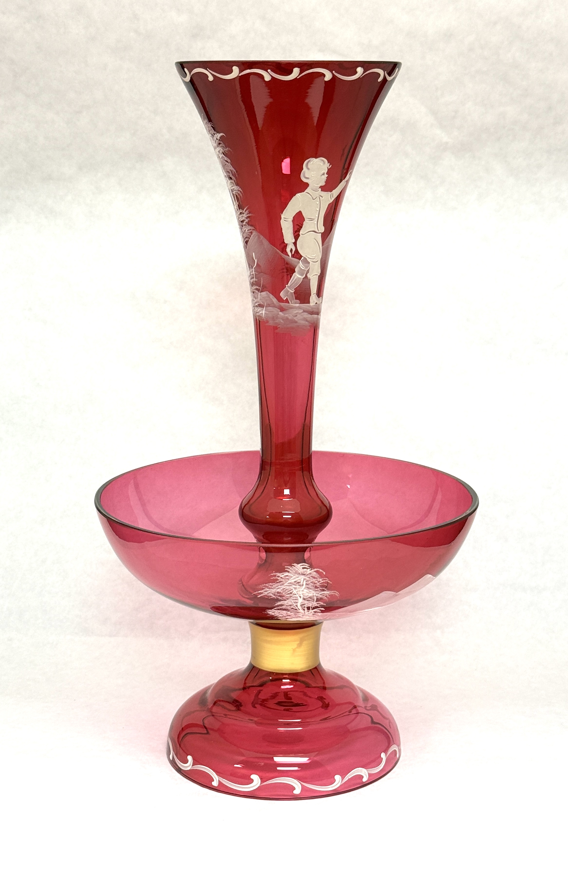 Mary Gregory cranberry epergne, 13″ ht. CONDITION: no chips, cracks, repairs, or material defects found, Jaremos attempts to call any material flaw that affects the price, but minor scratches and color variances are inherent to glass and antiques.