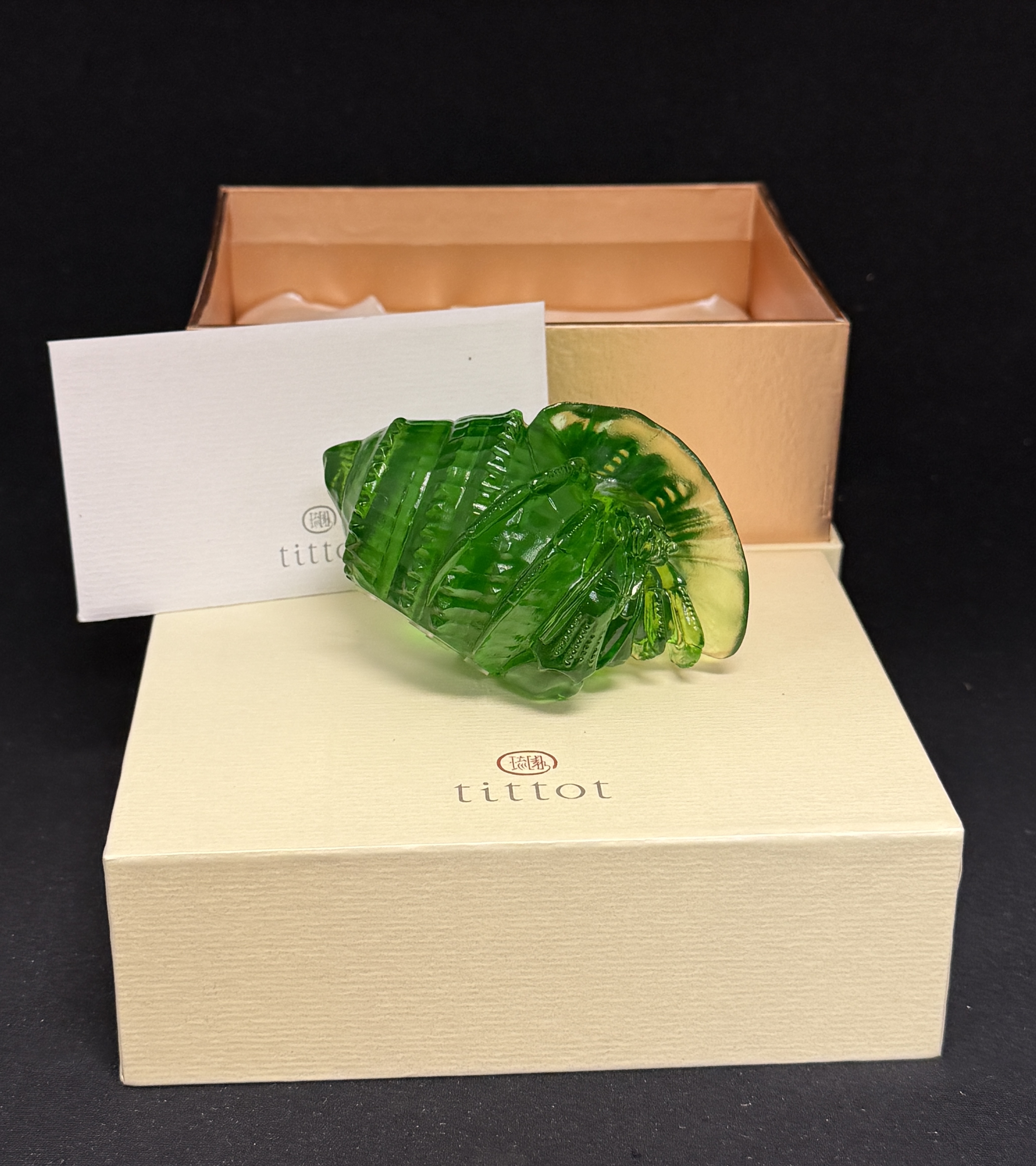 Tittot glass sculpture “Every Place Is Home” with gift box; length 4″. CONDITION: no chips, cracks, repairs or material defects found, Jaremos attempts to call any material flaw that affects the price, but minor scratches and color variances are inherent to glass and antiques.