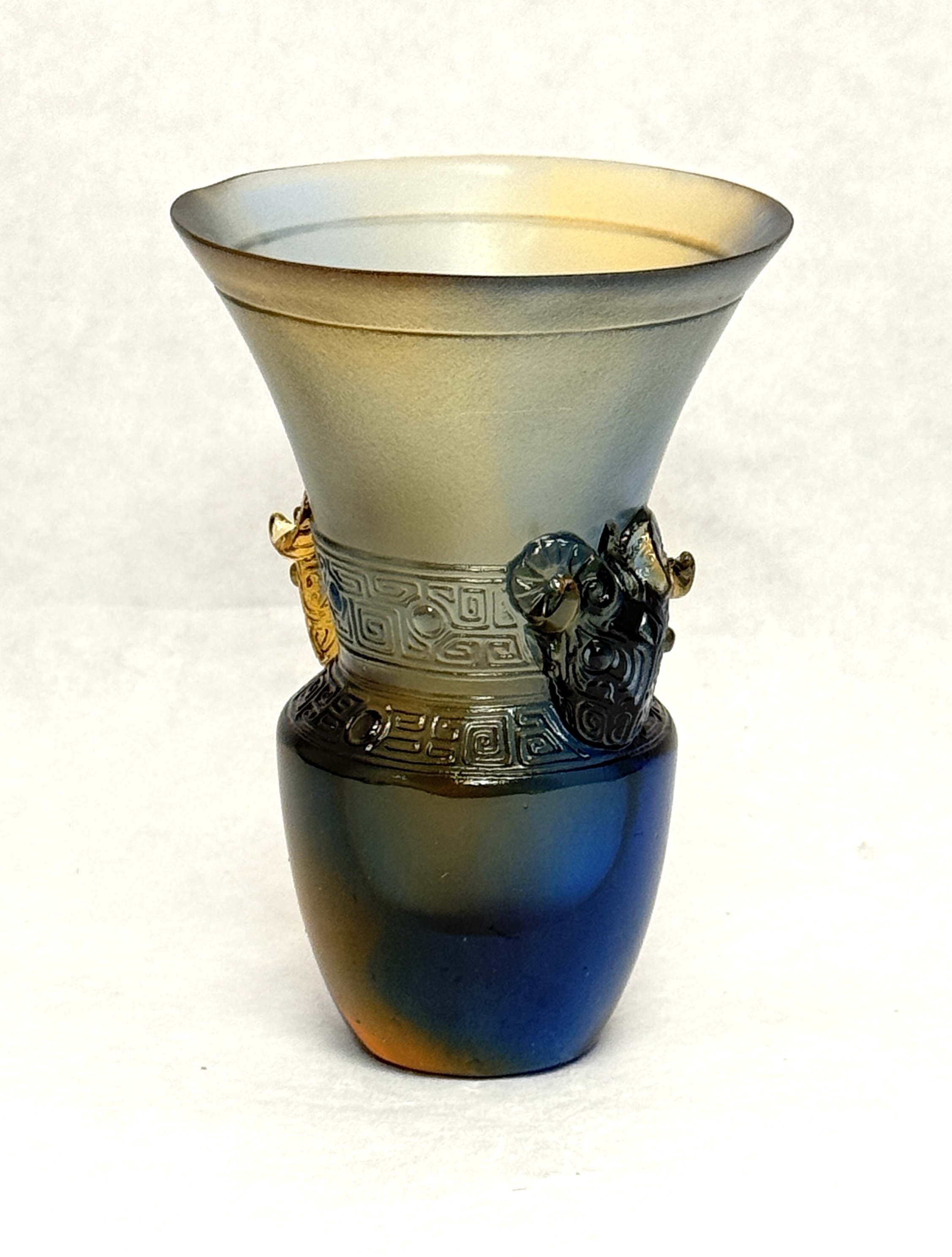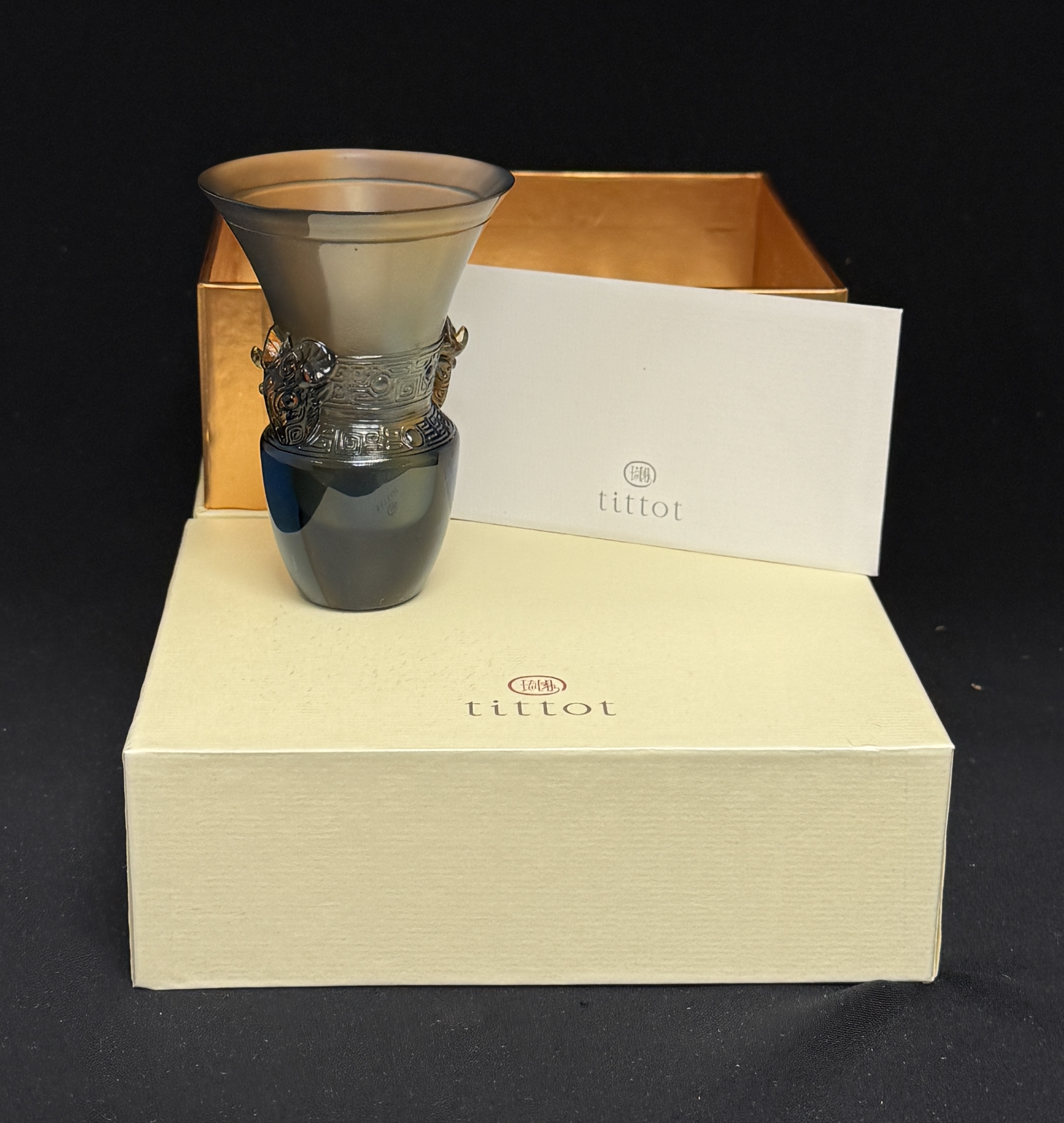 Tittot glass sculpture “Undaunting Spirit” with gift box; 3 3/4″. CONDITION: no chips, cracks, repairs or material defects found, Jaremos attempts to call any material flaw that affects the price, but minor scratches and color variances are inherent to glass and antiques.