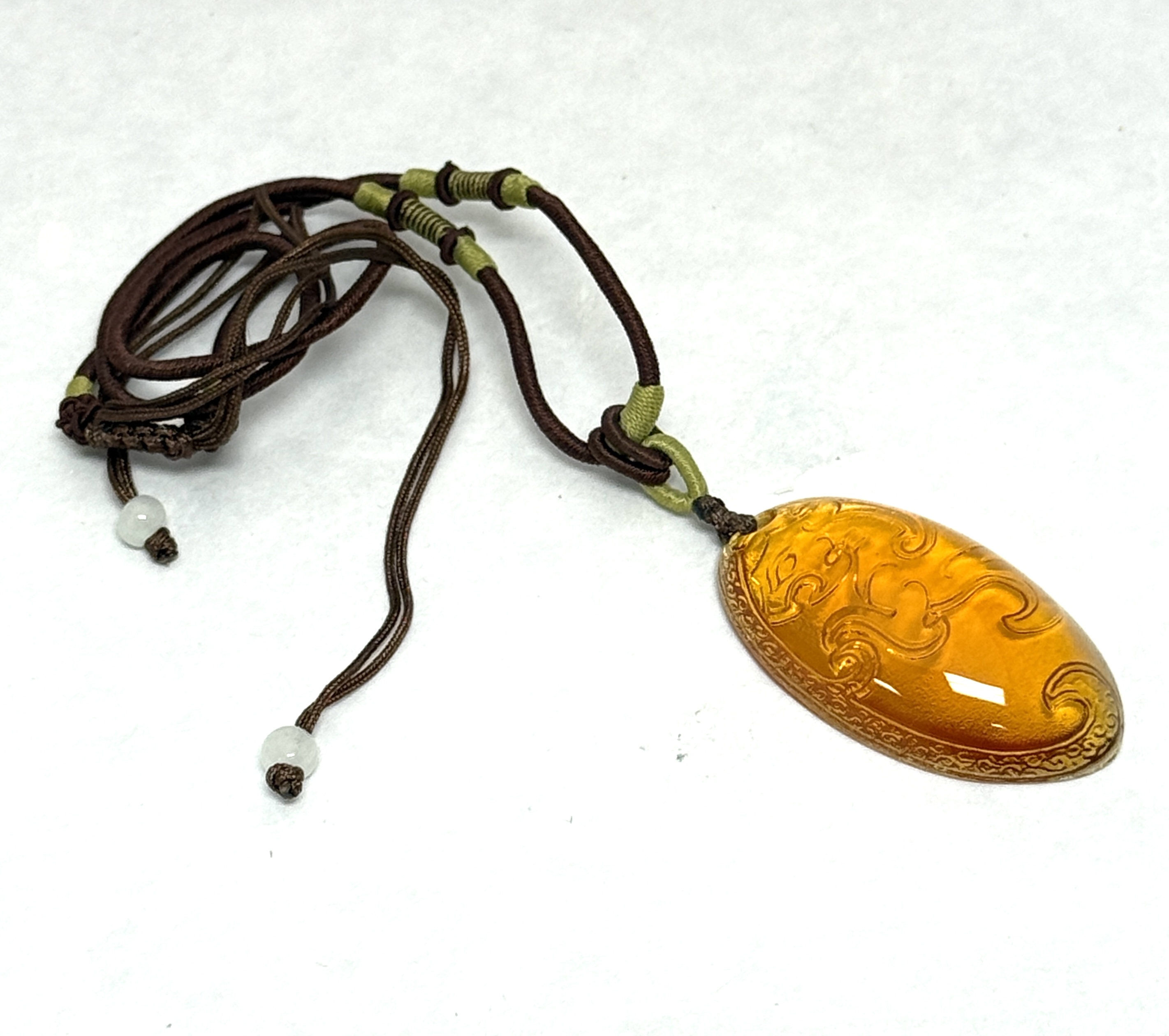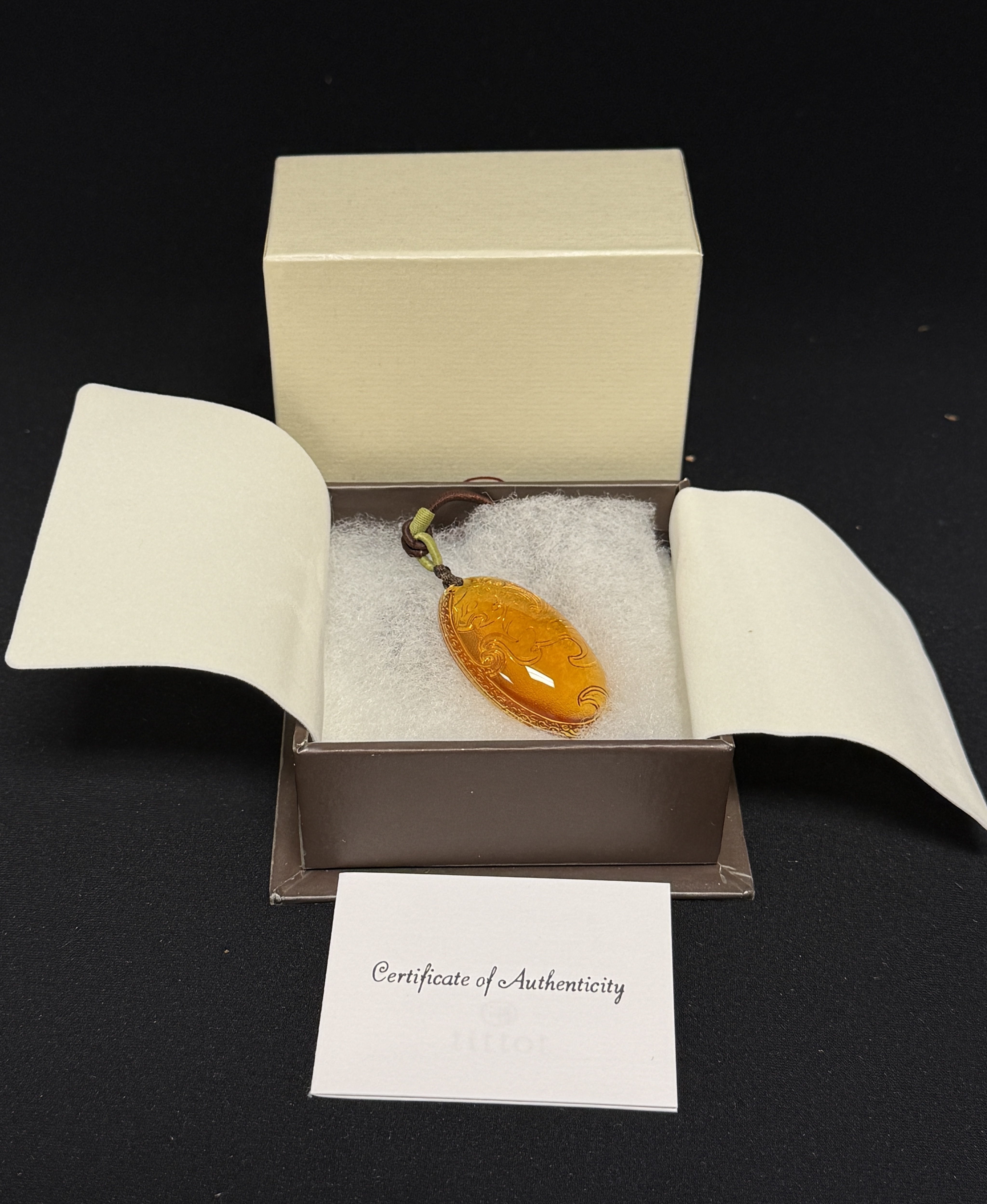 Tittot glass necklace “Thunder Clap of Calm” with gift box; medallion 1 3/4″. CONDITION: no chips, cracks, repairs or material defects found, Jaremos attempts to call any material flaw that affects the price, but minor scratches and color variances are inherent to glass and antiques.