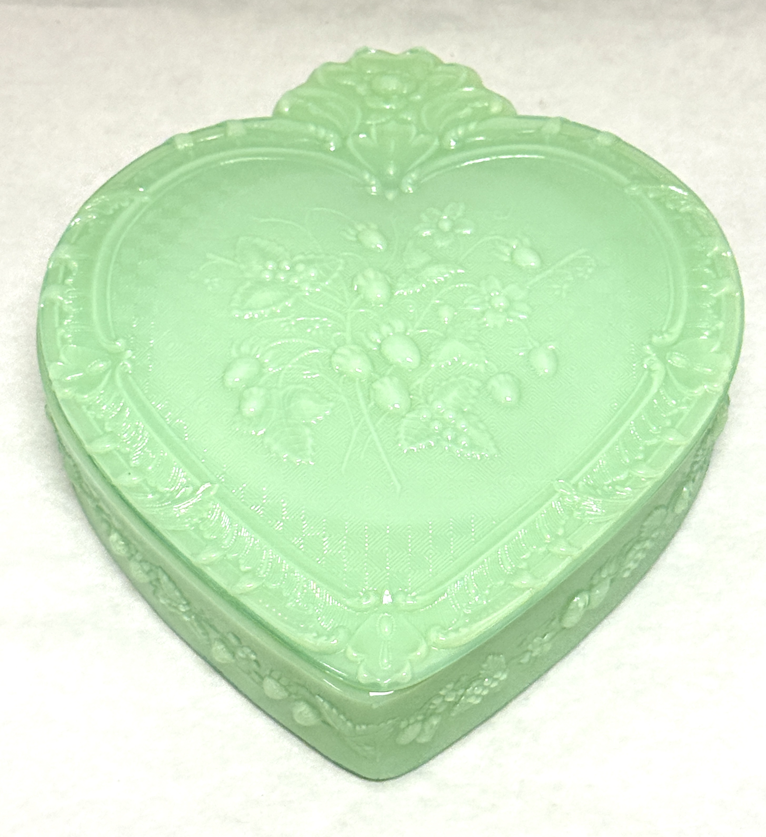 Jadeite covered heart dish; length 8 1/2″. CONDITION: no chips, cracks, repairs or material defects found, Jaremos attempts to call any material flaw that affects the price, but minor scratches and color variances are inherent to glass and antiques.