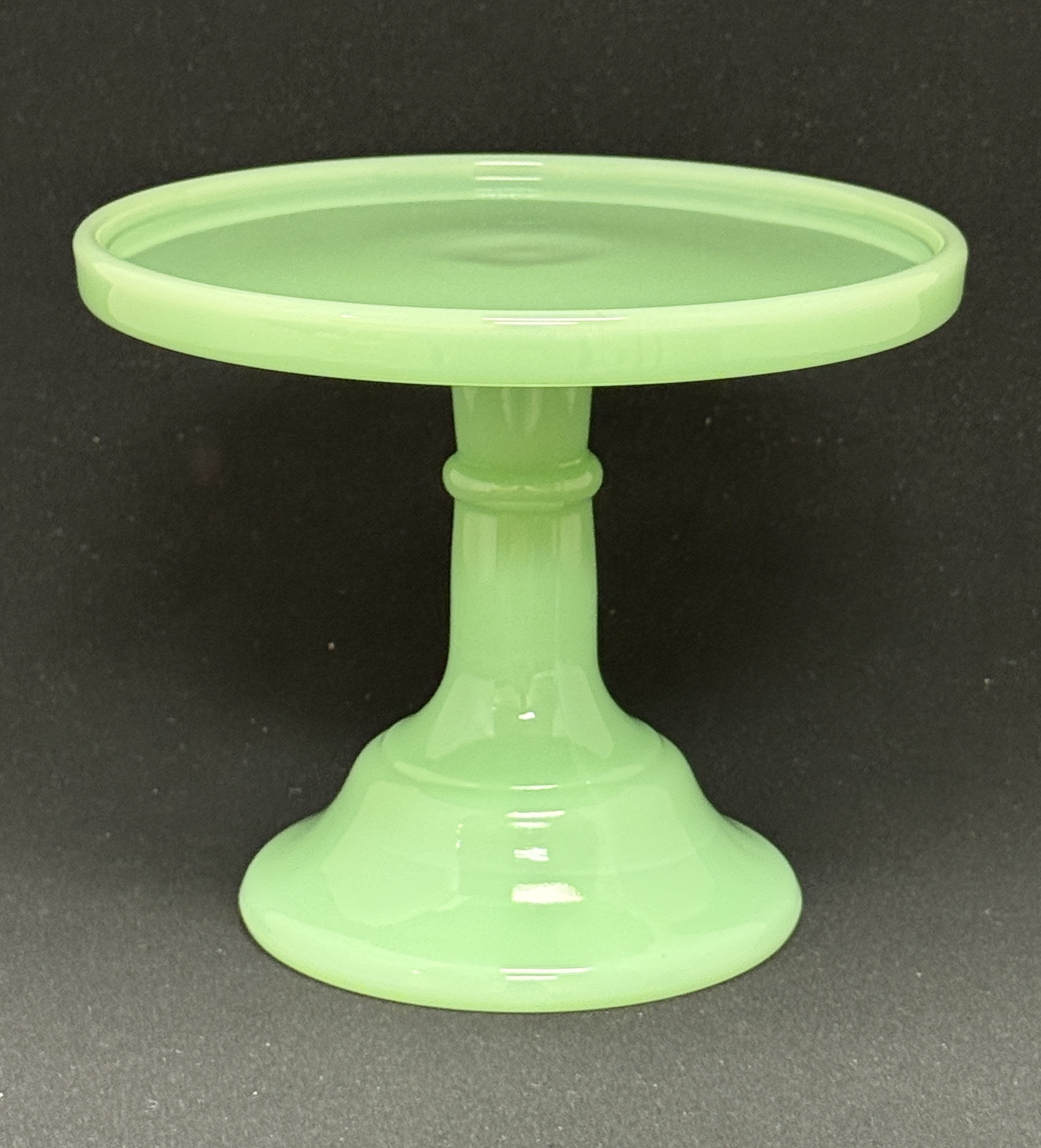 Small Jadeite cake stand; ht. 6″. CONDITION: no chips, cracks, repairs or material defects found, Jaremos attempts to call any material flaw that affects the price, but minor scratches and color variances are inherent to glass and antiques.