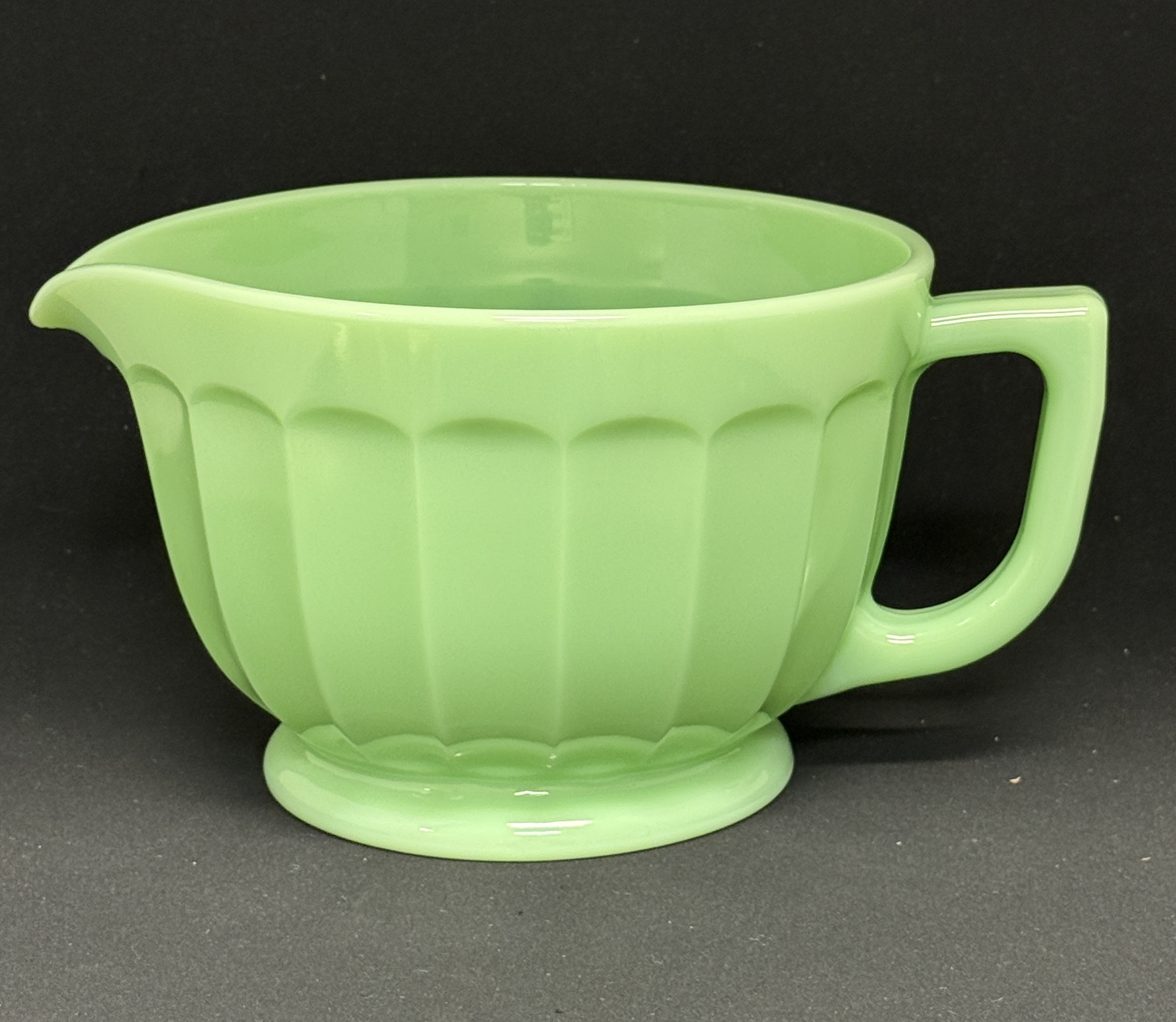 Large Jadeite batter bowl; diameter 9 1/2″. CONDITION: no chips, cracks, repairs or material defects found, Jaremos attempts to call any material flaw that affects the price, but minor scratches and color variances are inherent to glass and antiques.