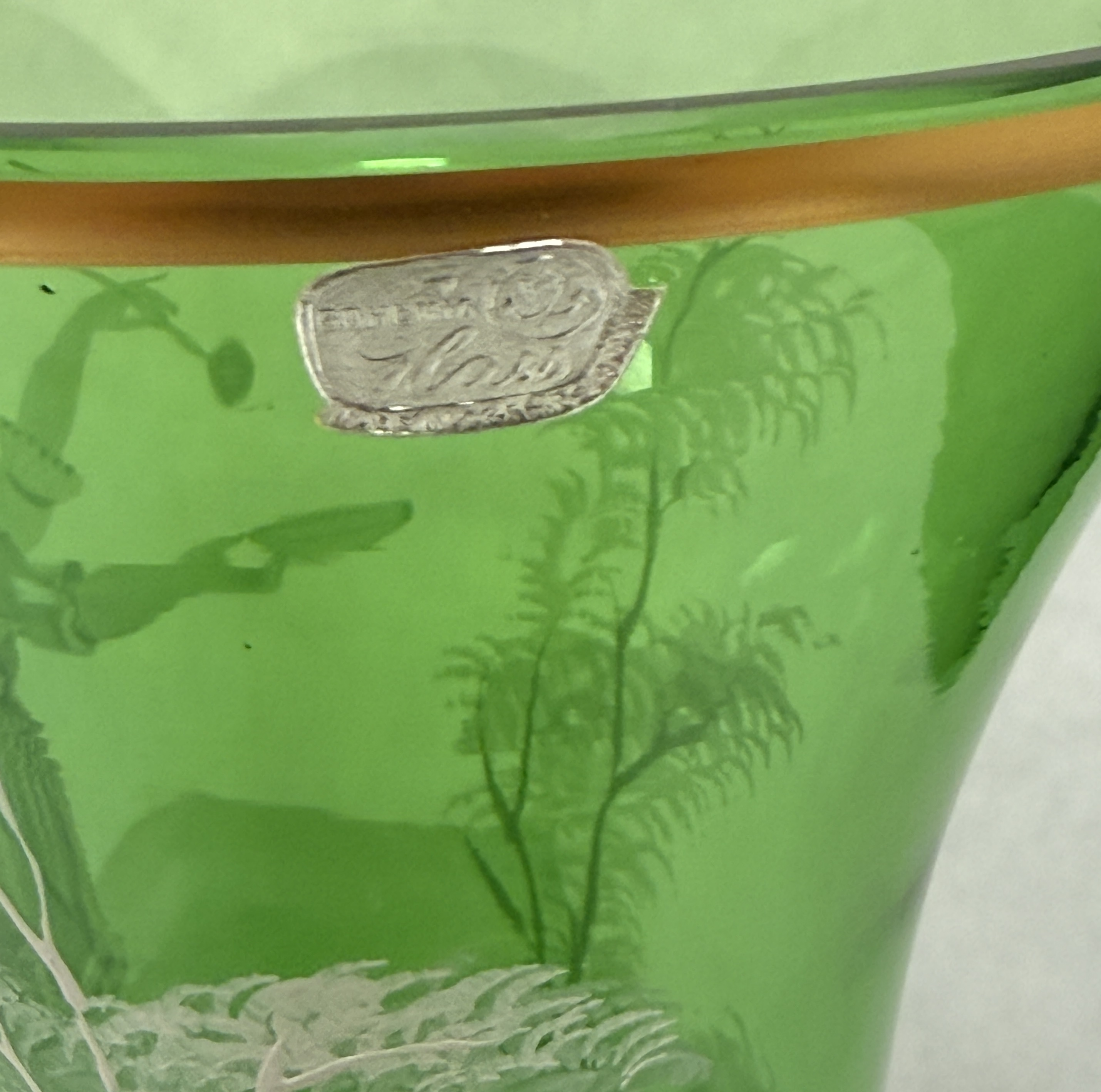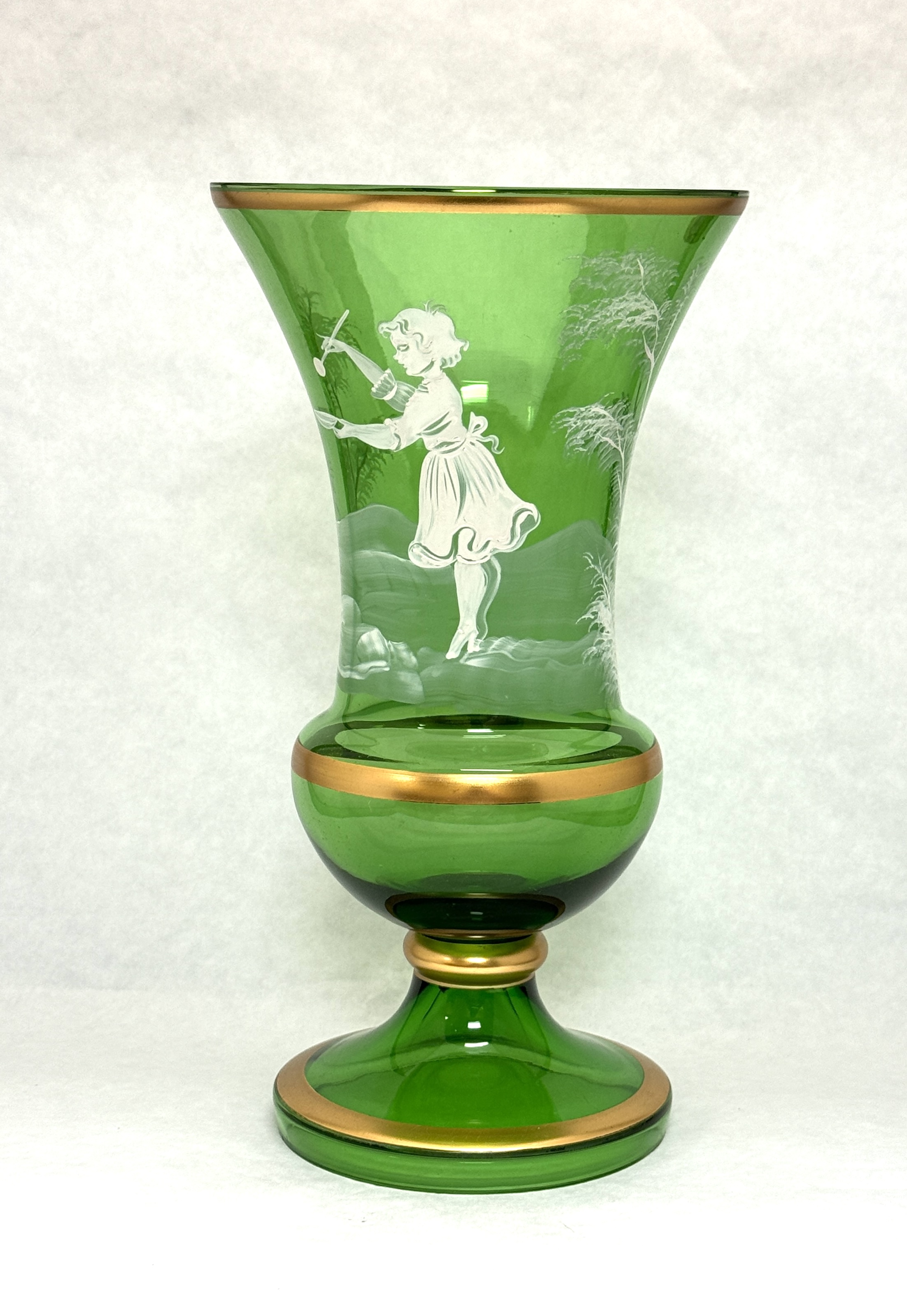 Mary Gregory green vase, 10″ ht. CONDITION: no chips, cracks, repairs, or material defects found, Jaremos attempts to call any material flaw that affects the price, but minor scratches and color variances are inherent to glass and antiques.