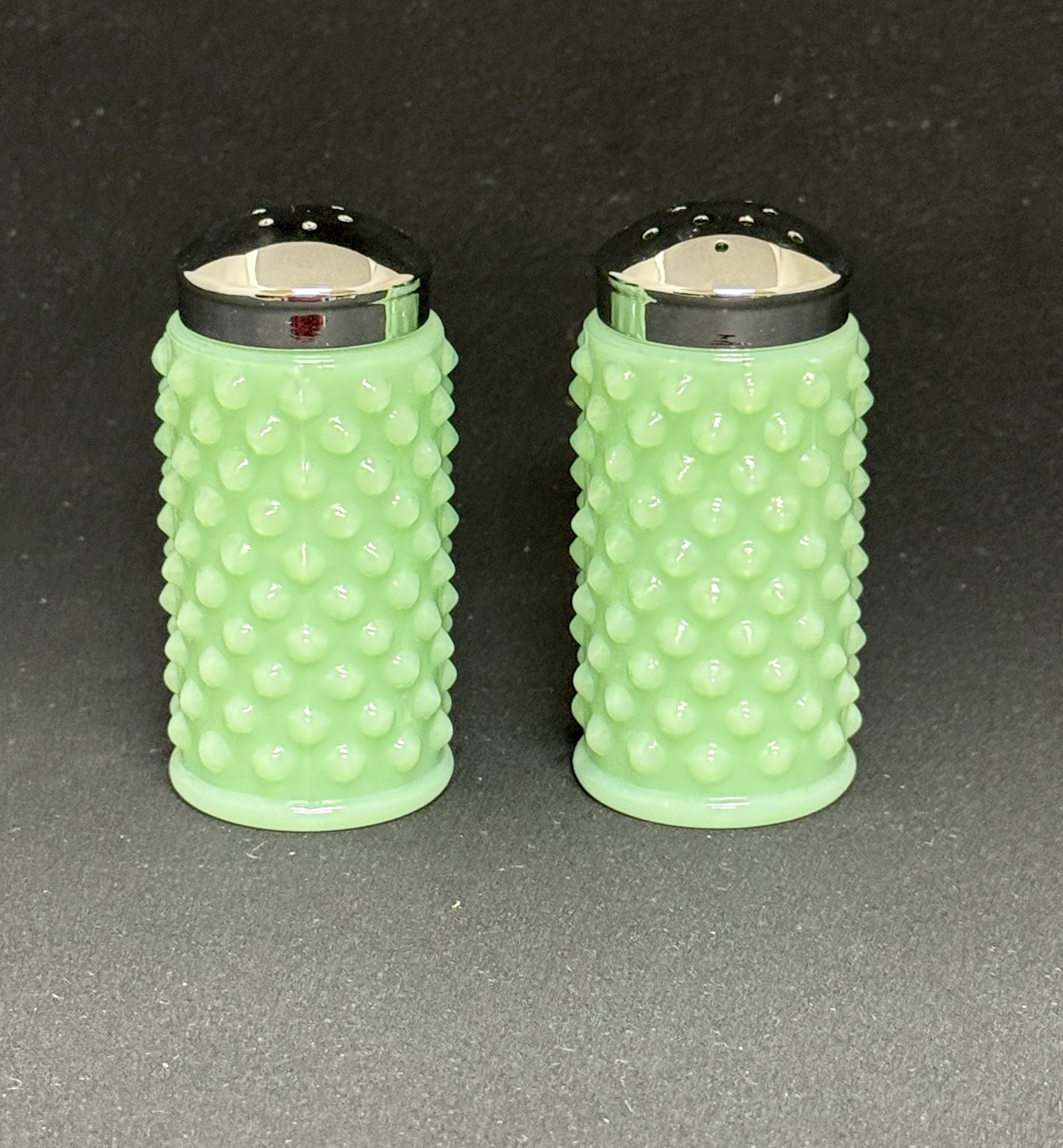 Pair of Jadeite hobnail salt and pepper shakers; ht. 3 1/4″. CONDITION: no chips, cracks, repairs or material defects found, Jaremos attempts to call any material flaw that affects the price, but minor scratches and color variances are inherent to glass and antiques.