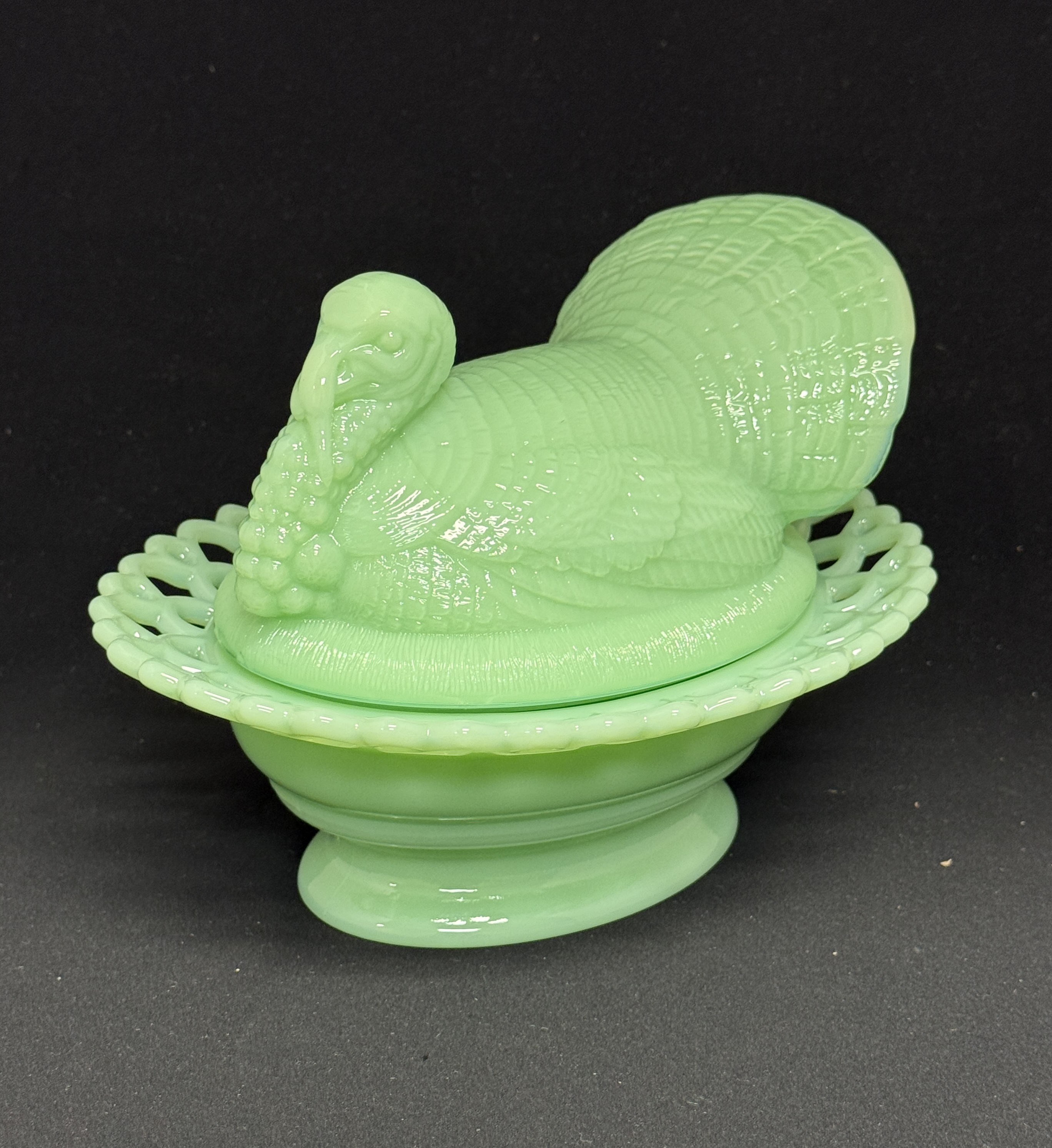 Large Jadeite covered turkey dish; length 8″. CONDITION: no chips, cracks, repairs or material defects found, Jaremos attempts to call any material flaw that affects the price, but minor scratches and color variances are inherent to glass and antiques.