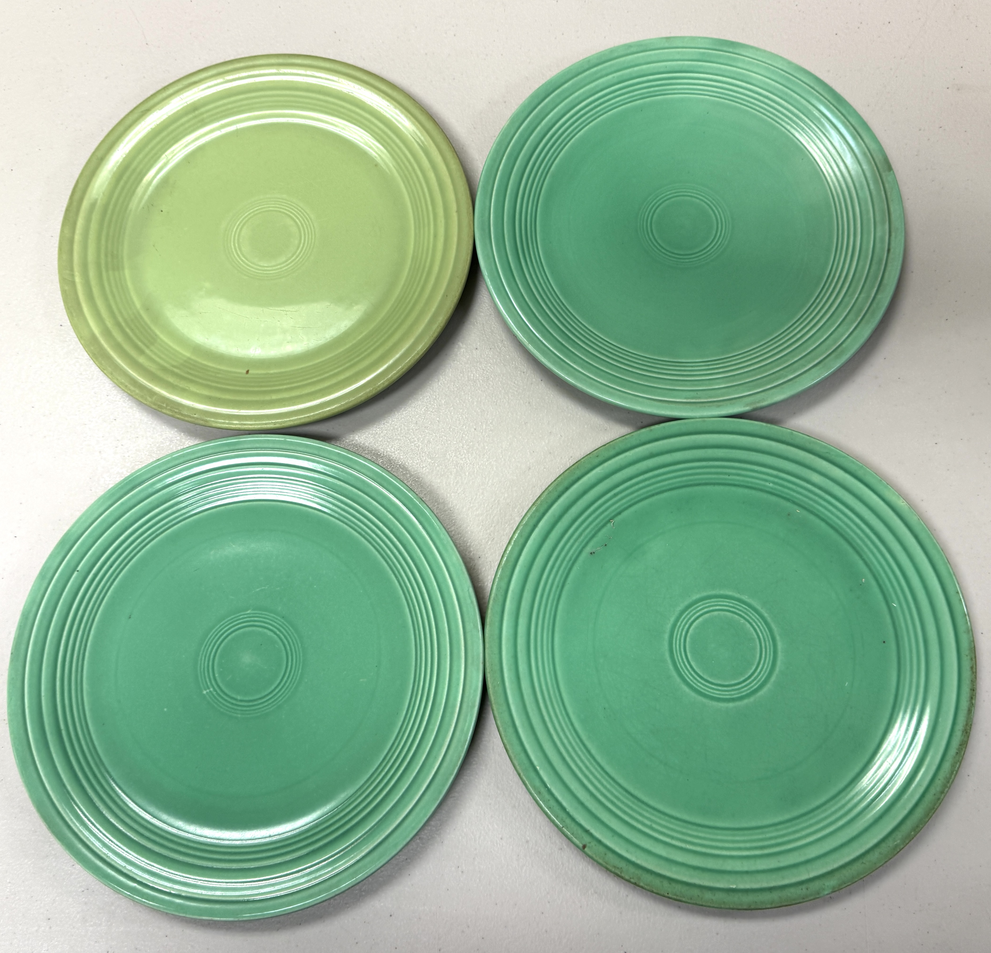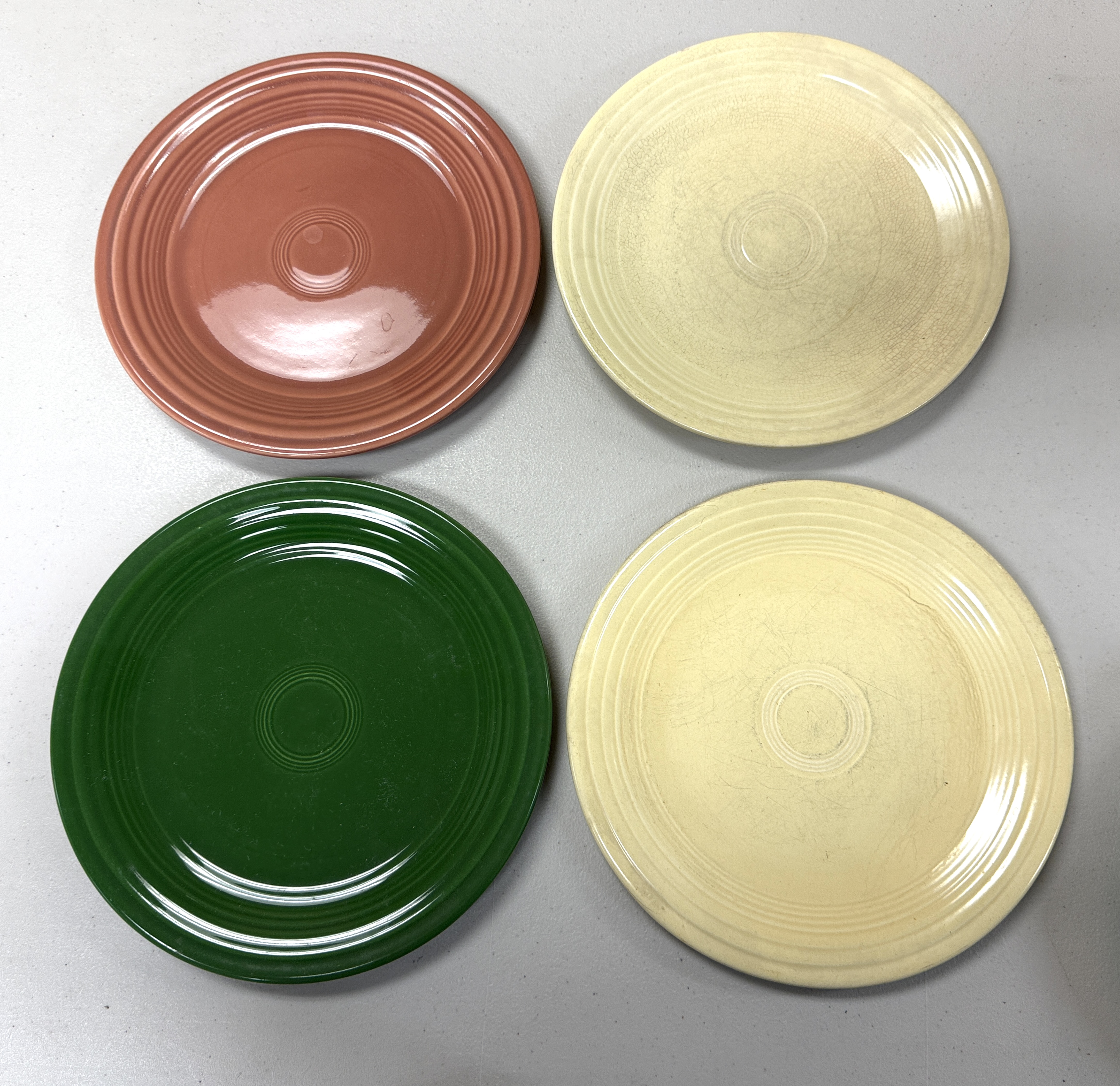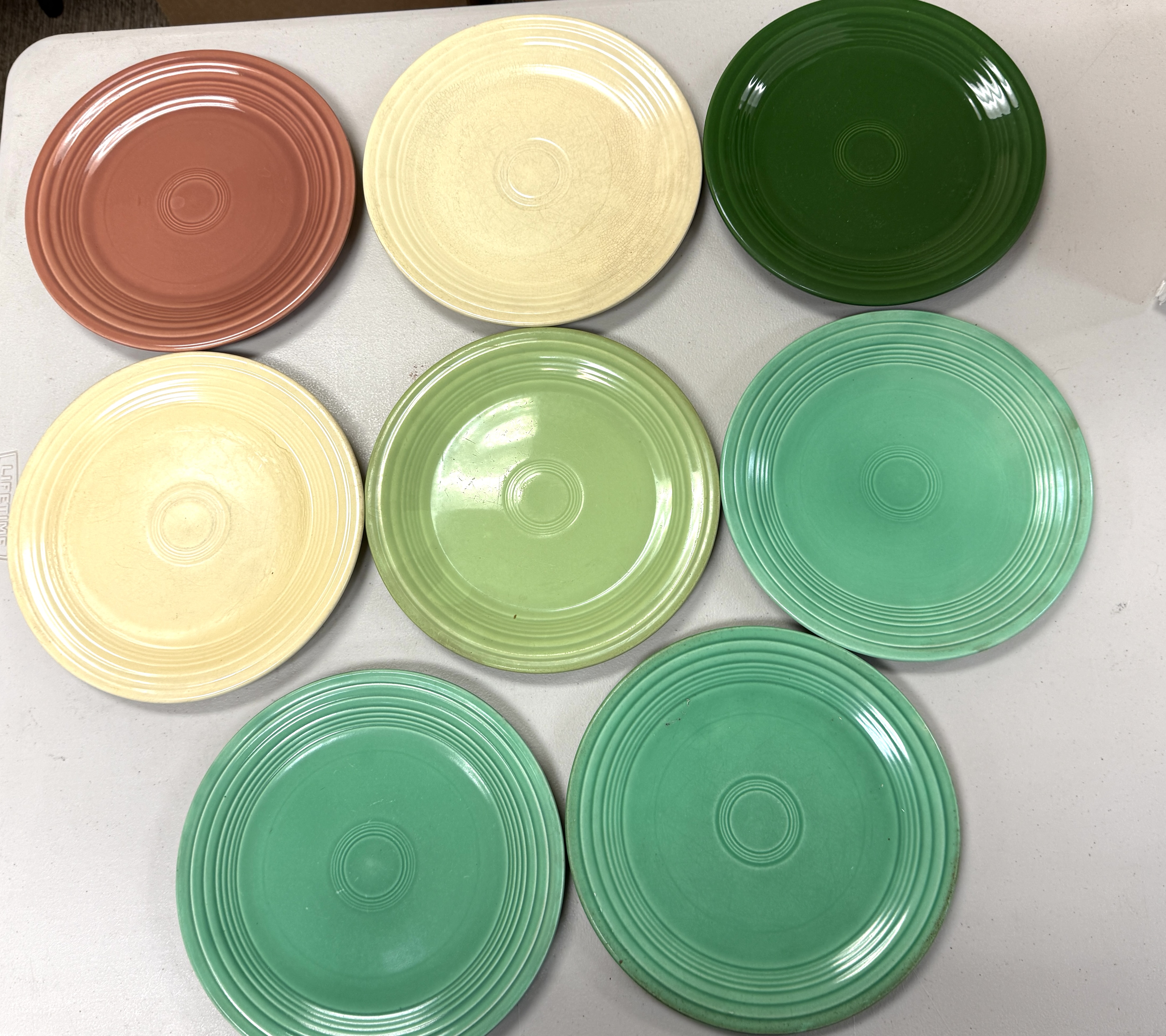 8 vintage Fiesta luncheon plates, various colors; diameter 9″. CONDITION: some wear.