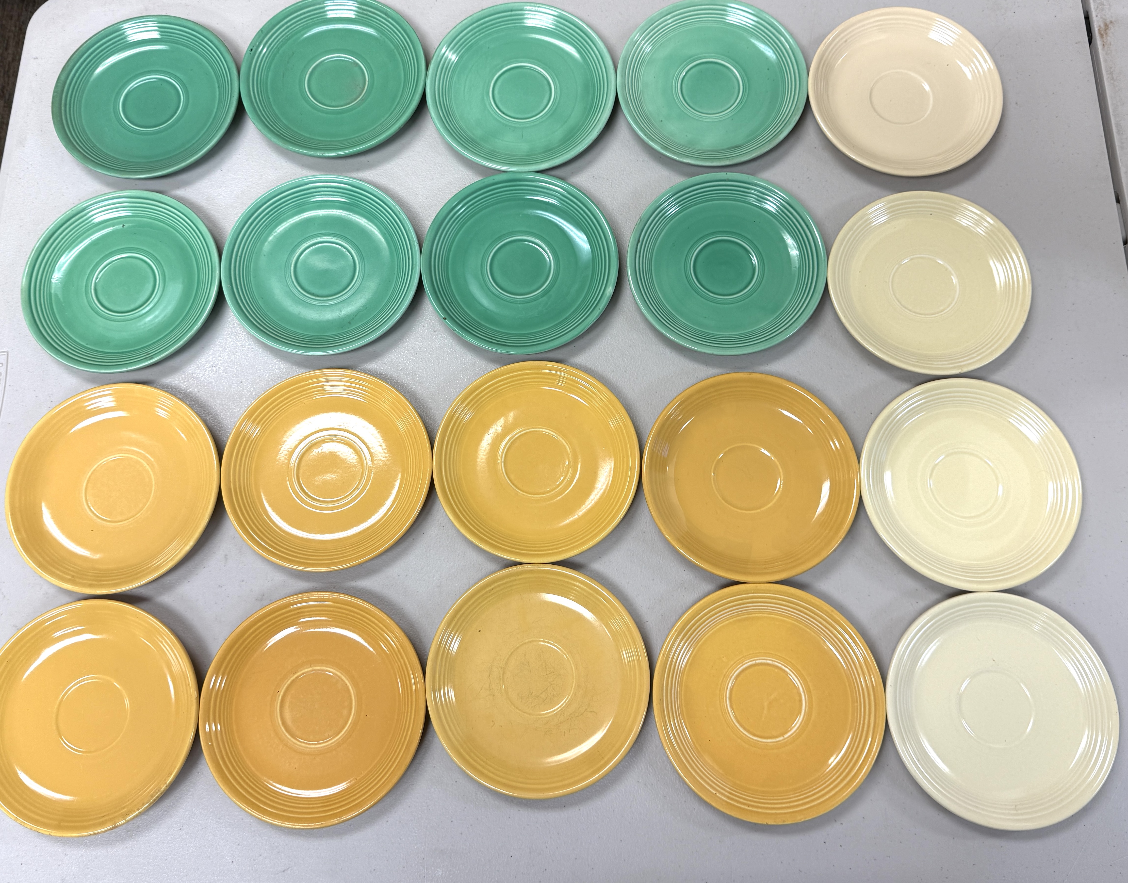 20 vintage fiesta saucers, 4 ivory, 8 yellow, 8 light green; diameter 6″. CONDITION: good.