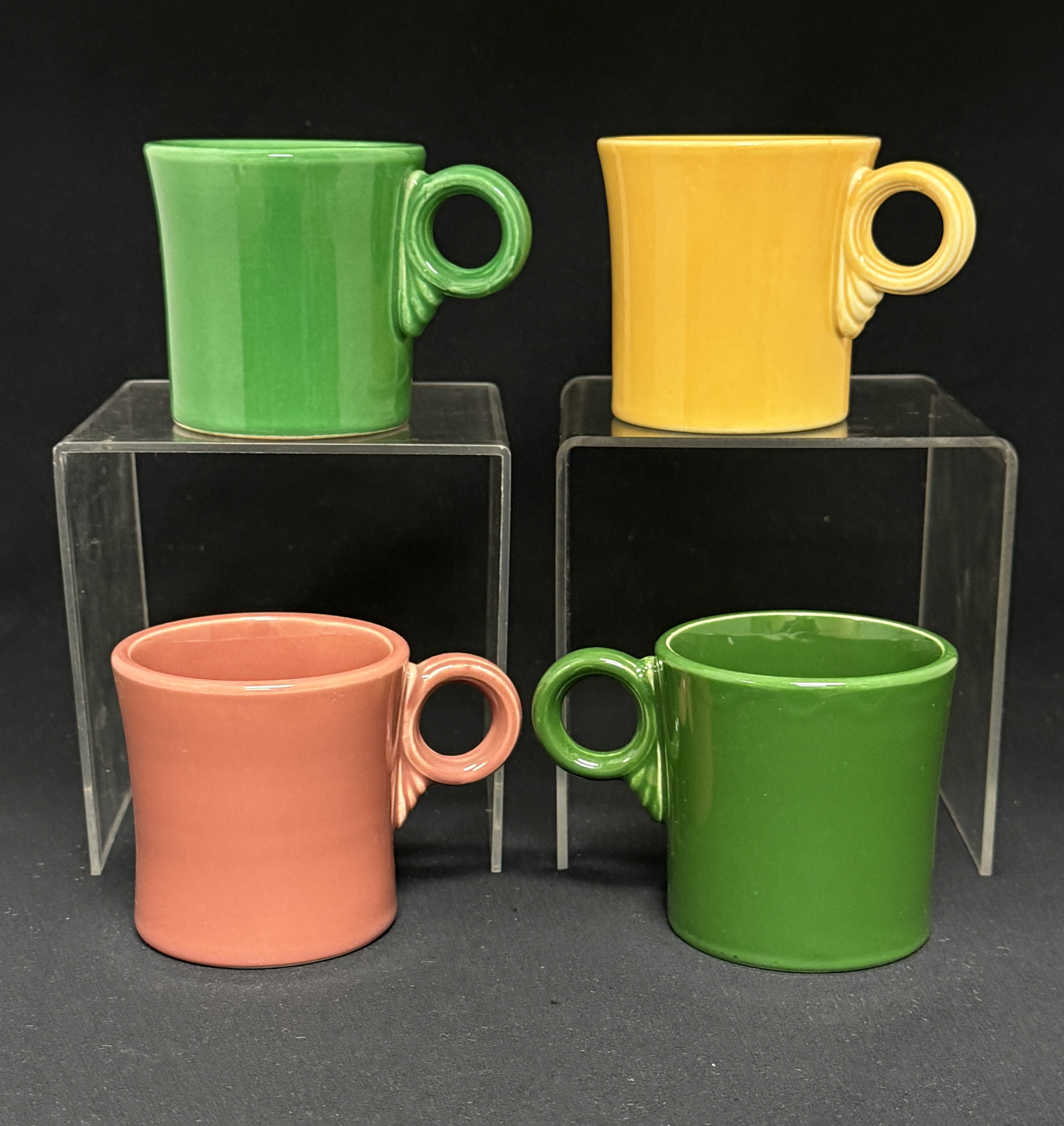 4 Fiesta mugs, yellow, rose, medium green, dark green; ht. 3″. CONDITION: good.