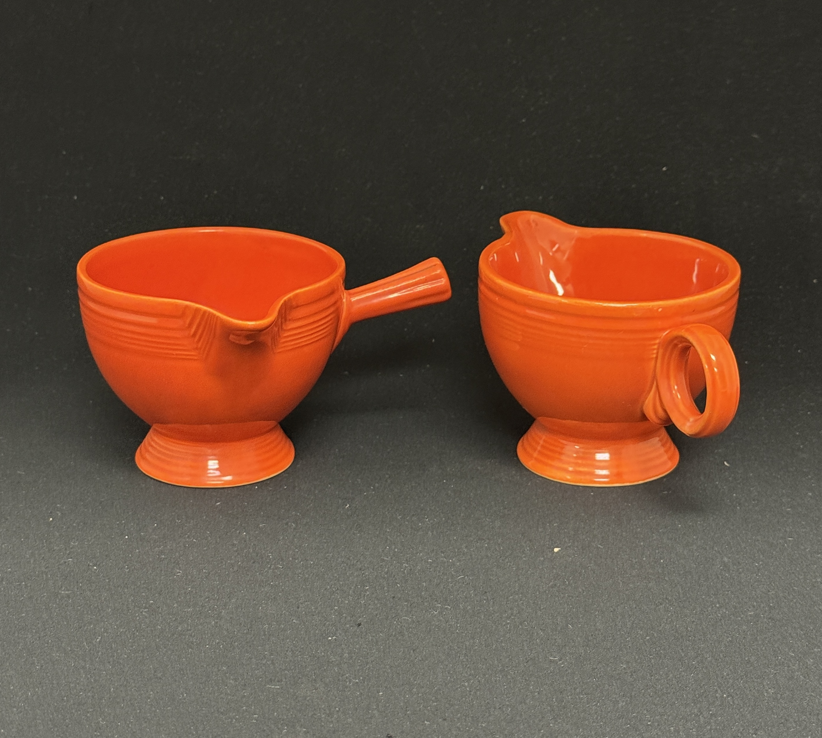 2 vintage Fiesta red radioactive creamers; ht. 3″. CONDITION: good.