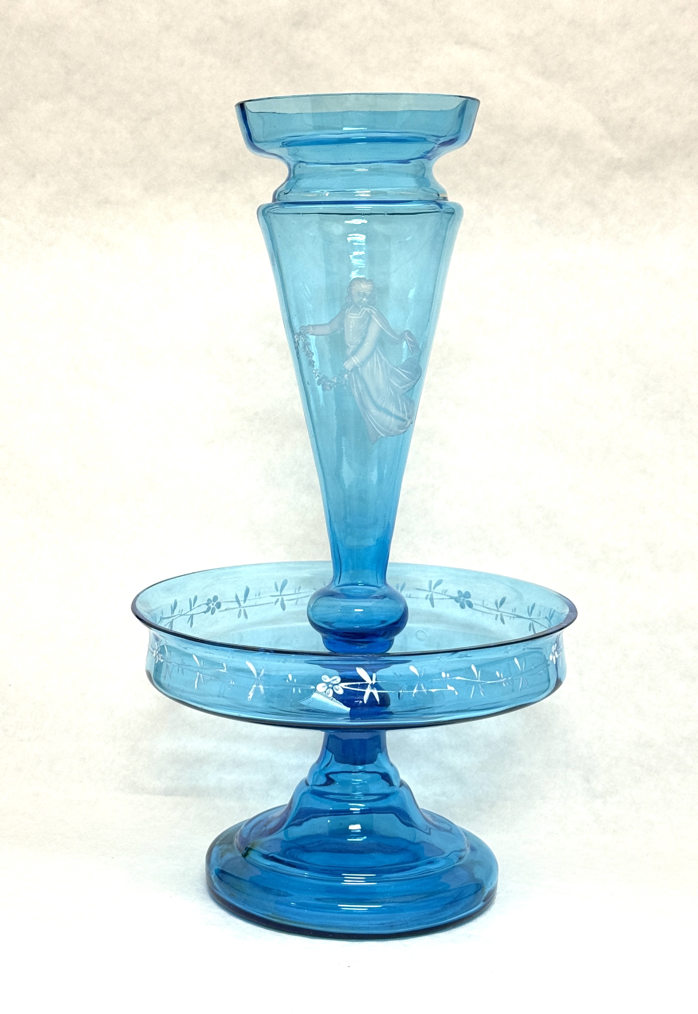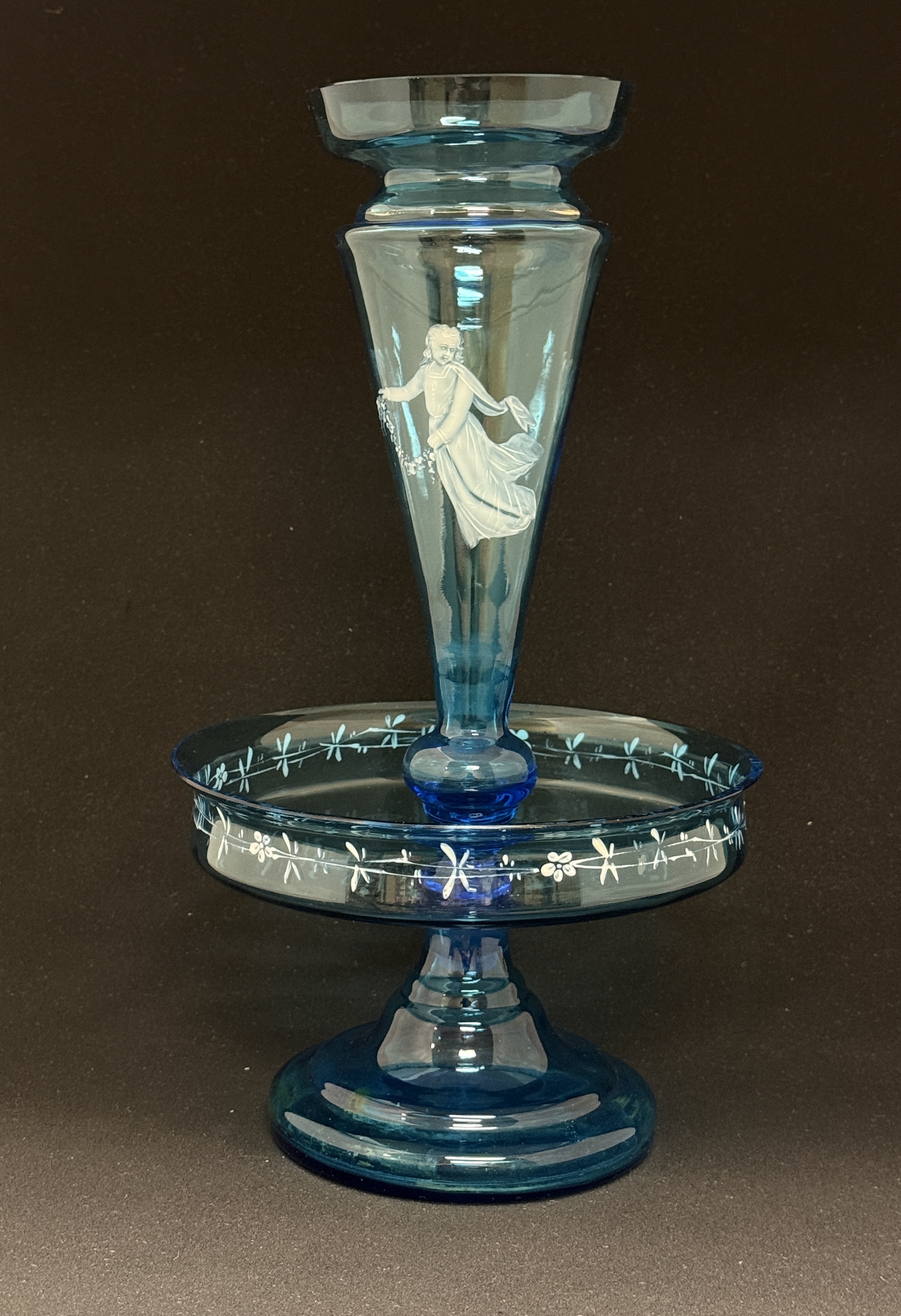 Mary Gregory blue epergne, 12 1/2″ ht. CONDITION: no chips, cracks, repairs, or material defects found, Jaremos attempts to call any material flaw that affects the price, but minor scratches and color variances are inherent to glass and antiques.