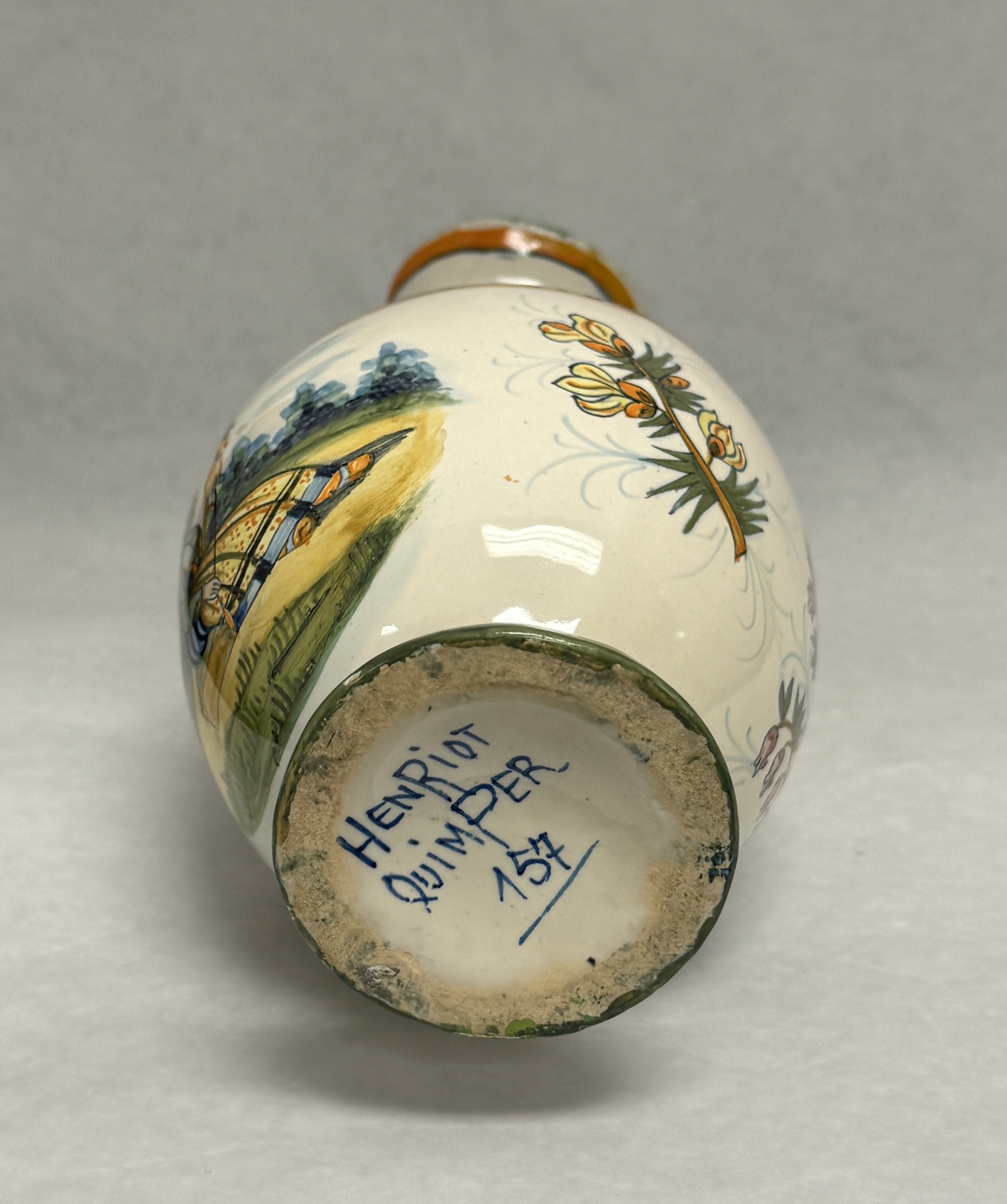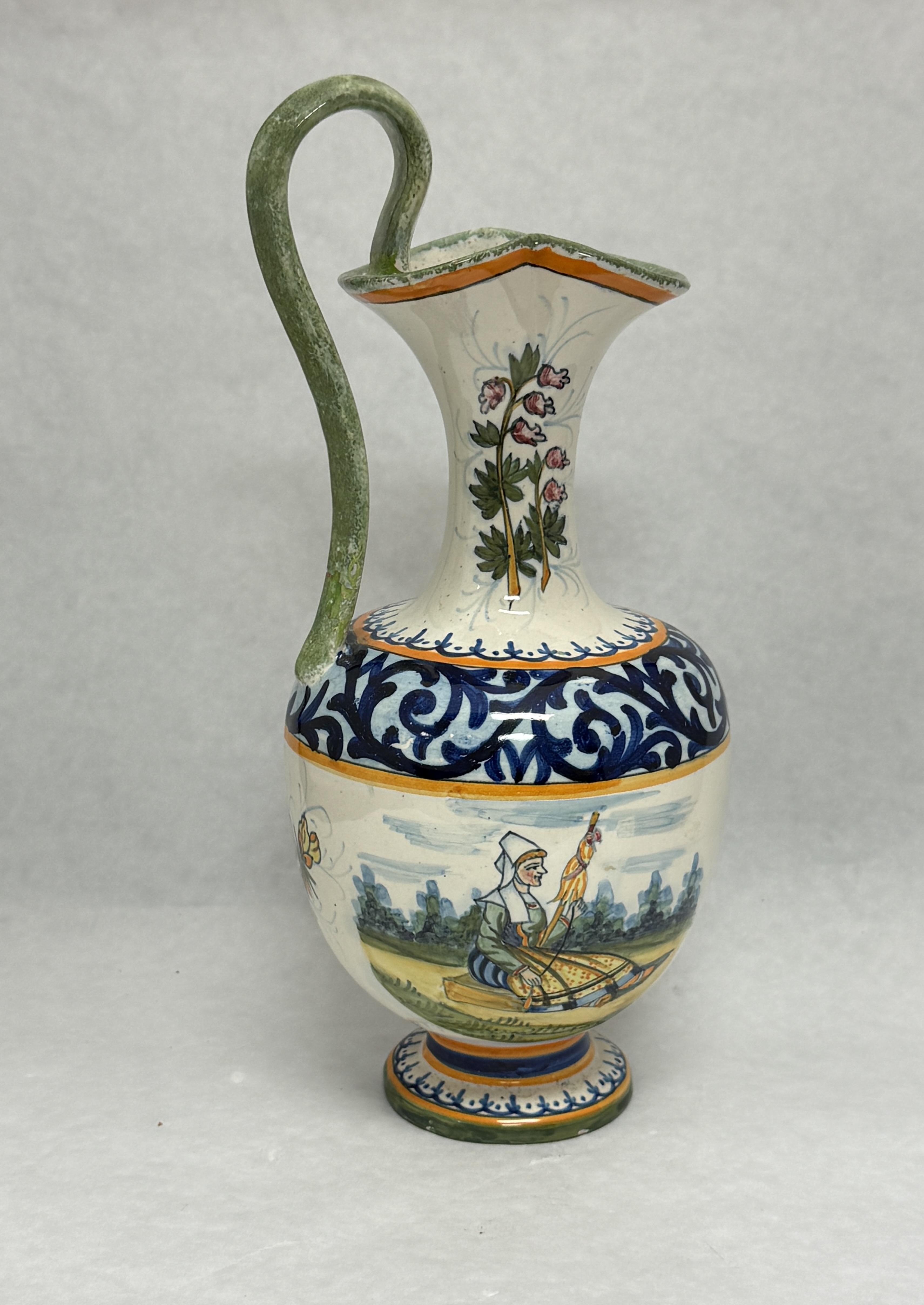 Henriot Quimper French Faience ewer; ht. 10 1/2″. CONDITION: no chips, cracks, repairs or material defects found, Jaremos attempts to call any material flaw that affects the price, but minor scratches and color variances are inherent to glass and antiques.