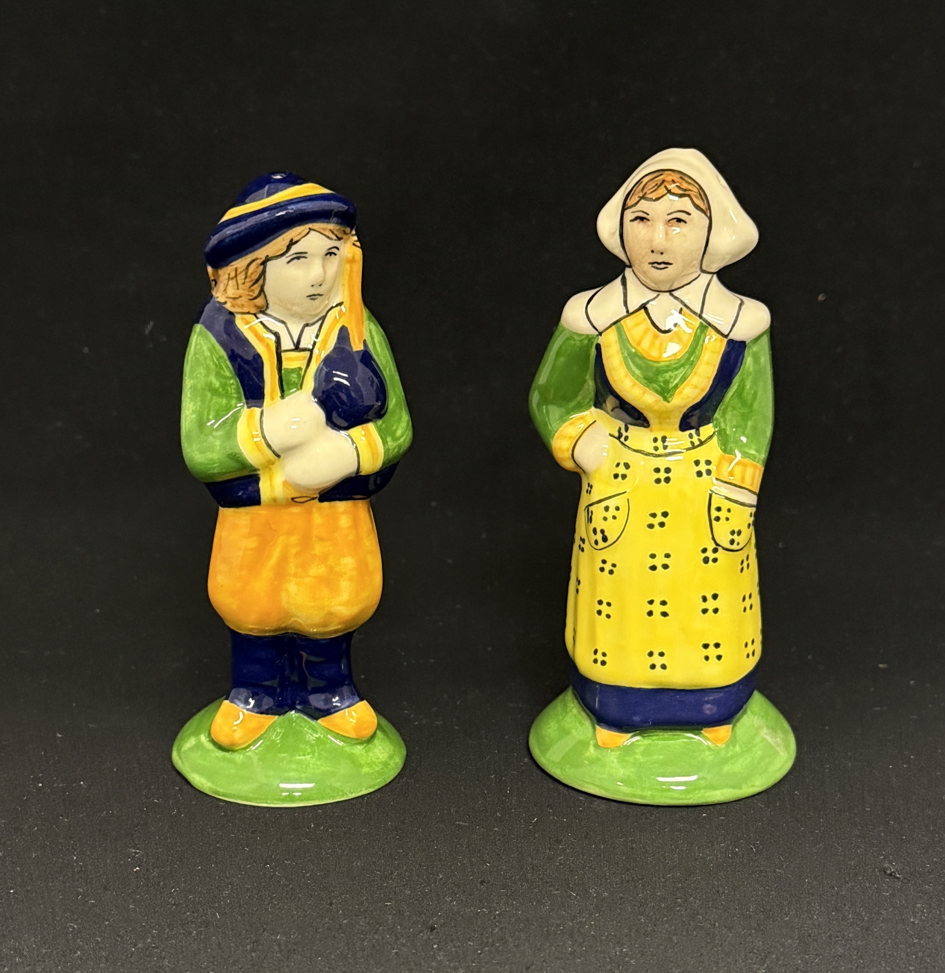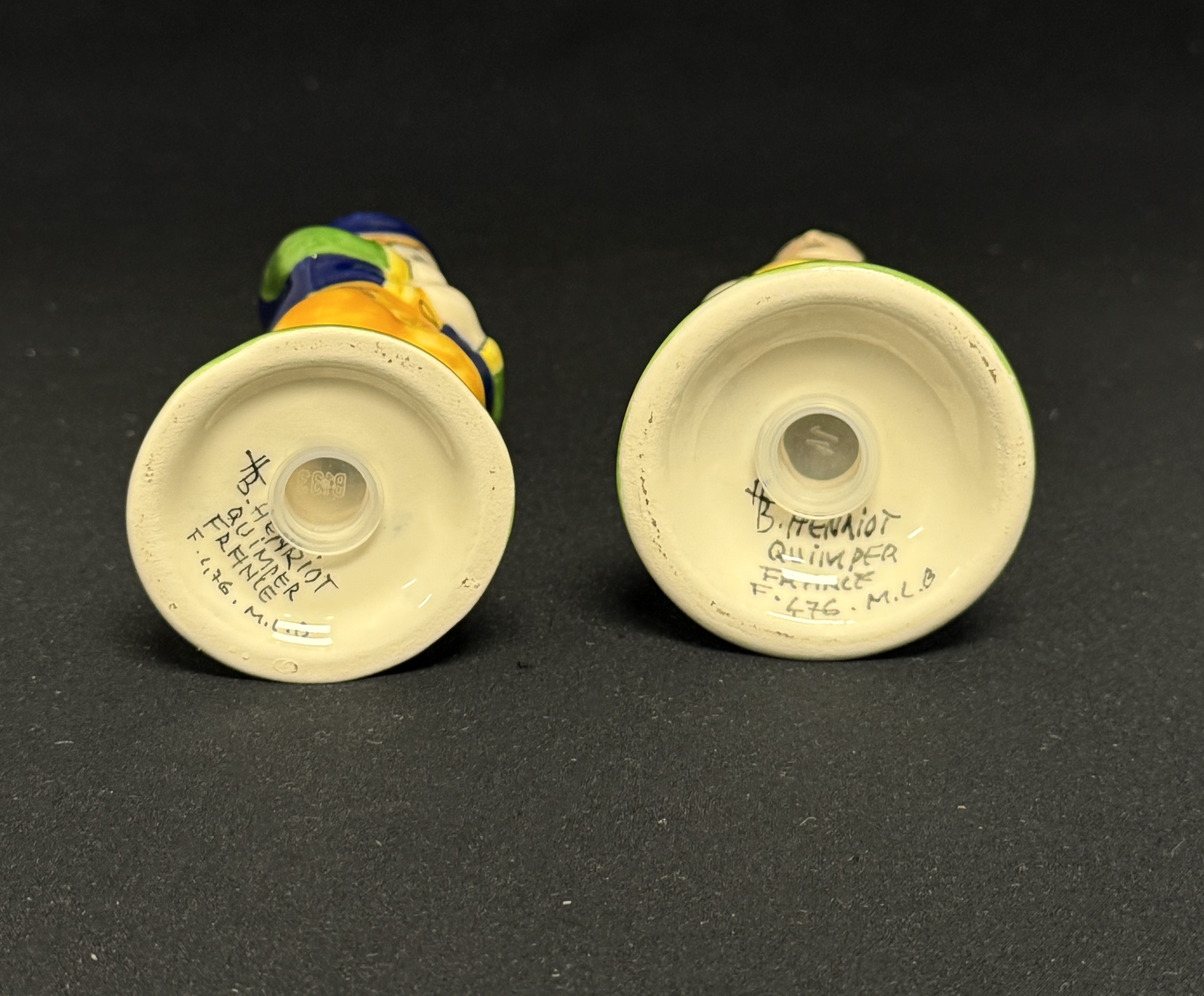 HB Henriot Quimper salt and pepper shakers, Bretonne and Breton; ht. 5 1/8″. CONDITION: no chips, cracks, repairs or material defects found, Jaremos attempts to call any material flaw that affects the price, but minor scratches and color variances are inherent to glass and antiques.