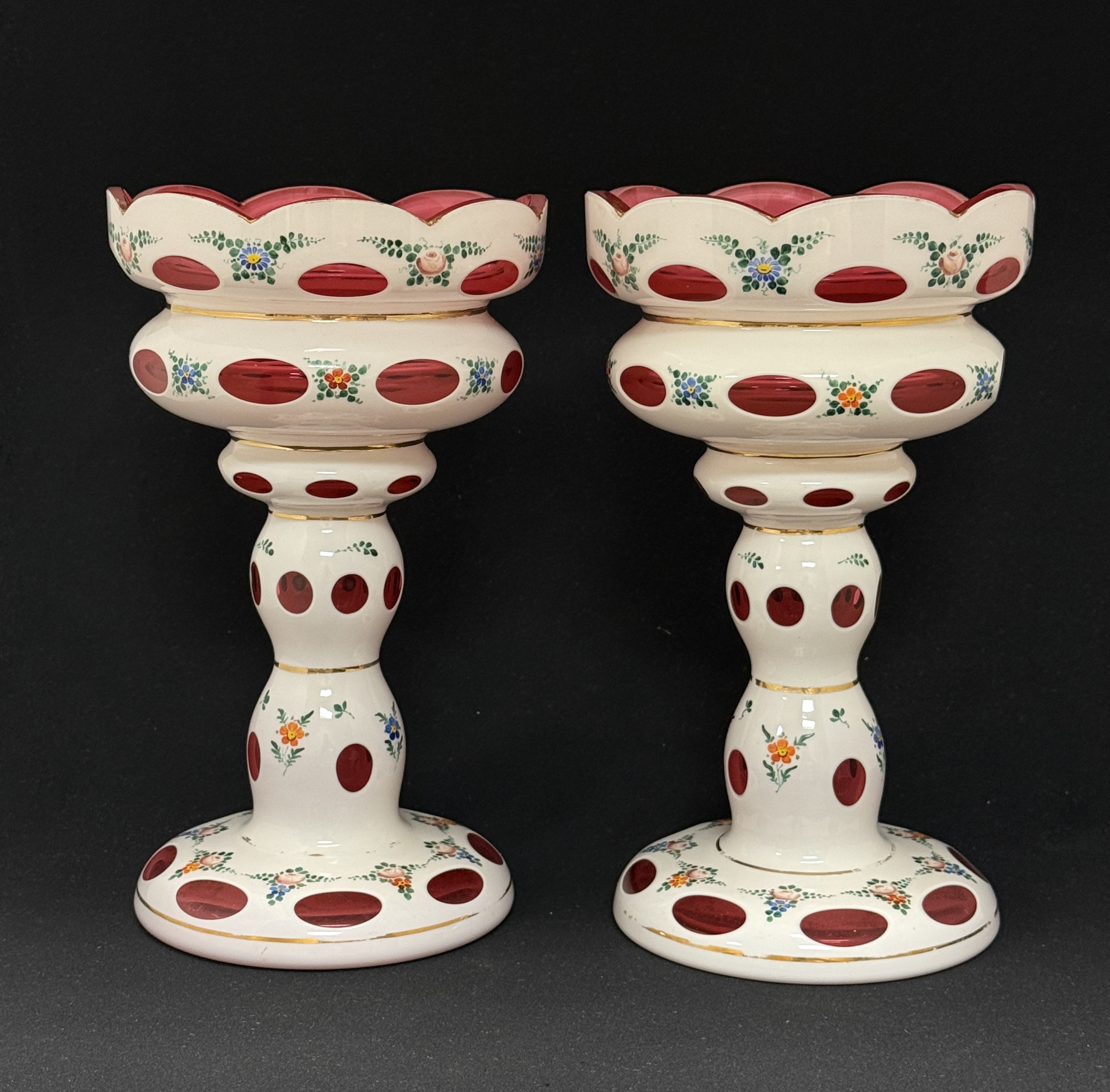 Opal mantle lusters cut to cranberry, 10″ ht. CONDITION: no chips, cracks, repairs, or material defects found, Jaremos attempts to call any material flaw that affects the price, but minor scratches and color variances are inherent to glass and antiques.
