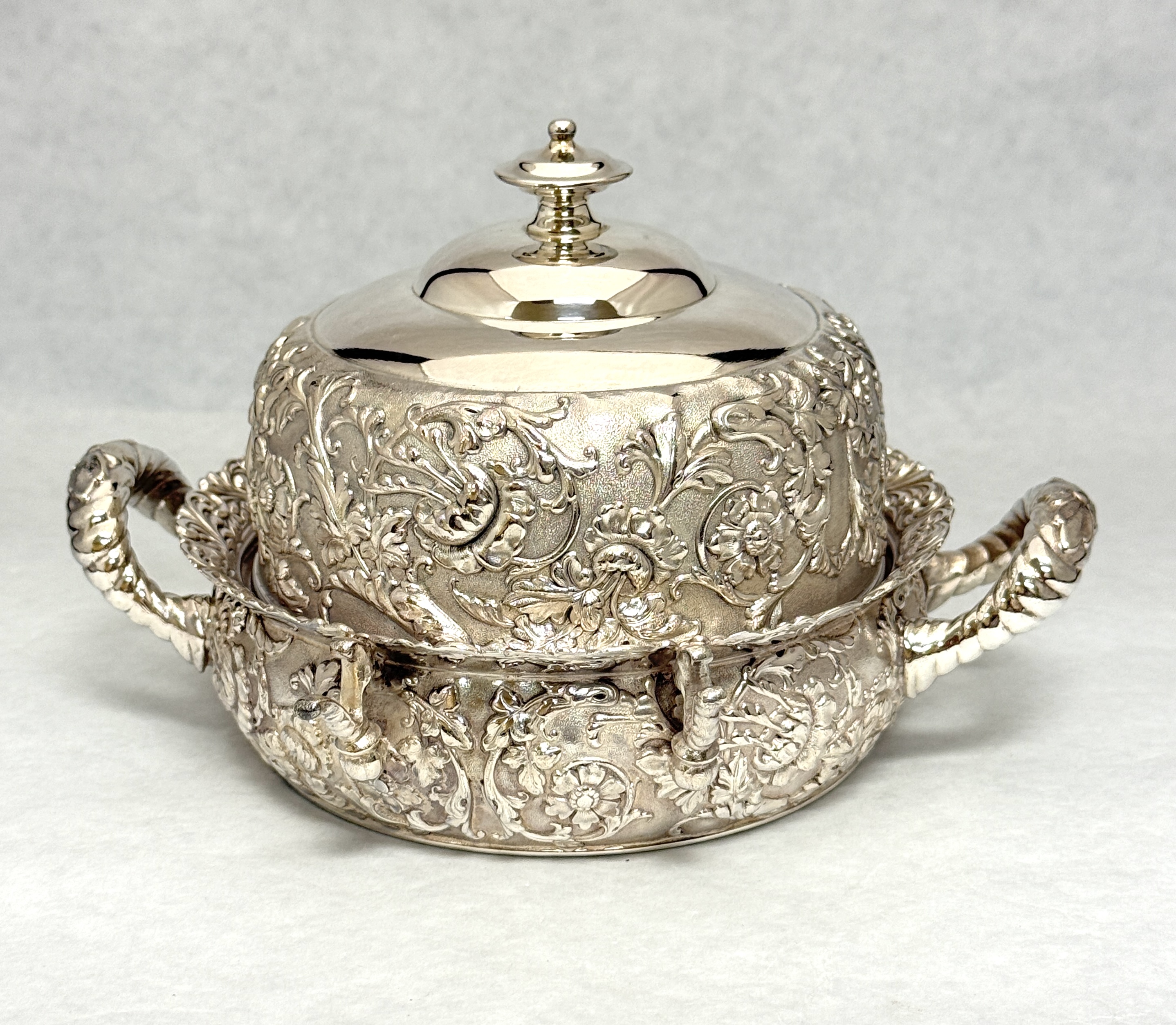 3 Silver Plate butter dishes, 8″ wide. CONDITION: no chips, cracks, repairs, or material defects found, Jaremos attempts to call any material flaw that affects the price, but minor scratches and color variances are inherent to glass and antiques.