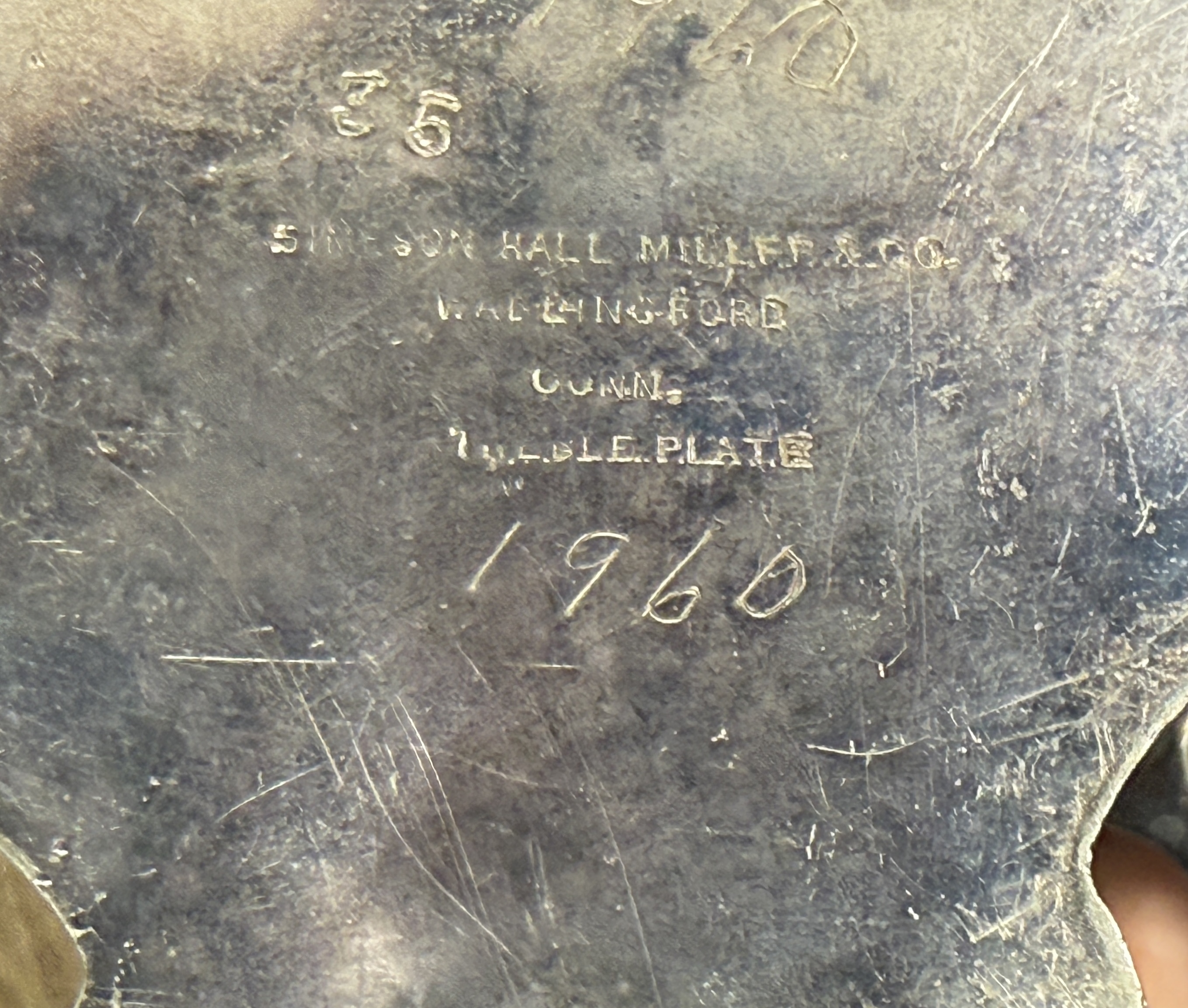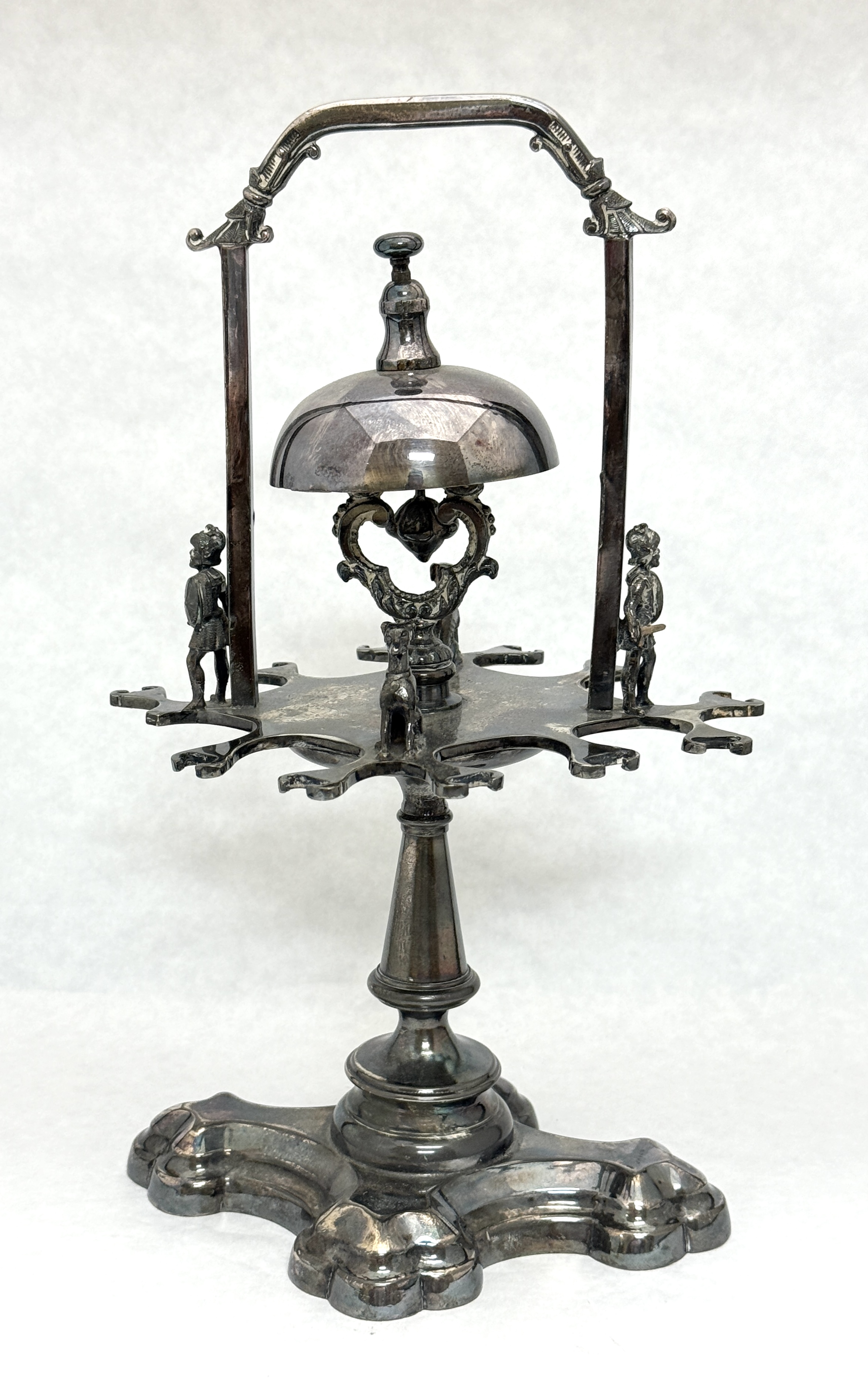 Simpson Hall silver plate spoon caddy with dinner bell, 10 1/2″ ht. CONDITION: no chips, cracks, repairs, or material defects found, Jaremos attempts to call any material flaw that affects the price, but minor scratches and color variances are inherent to glass and antiques.