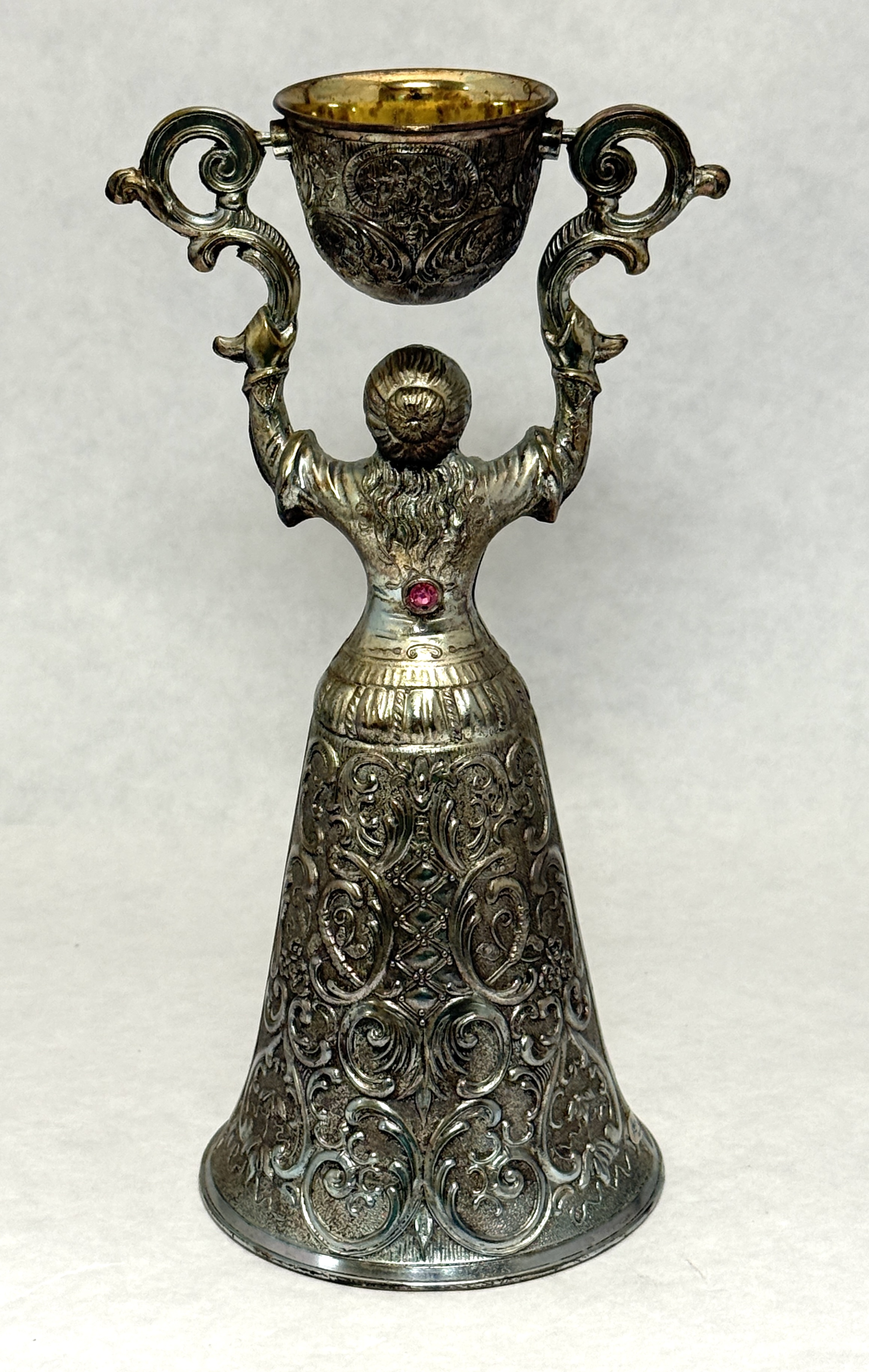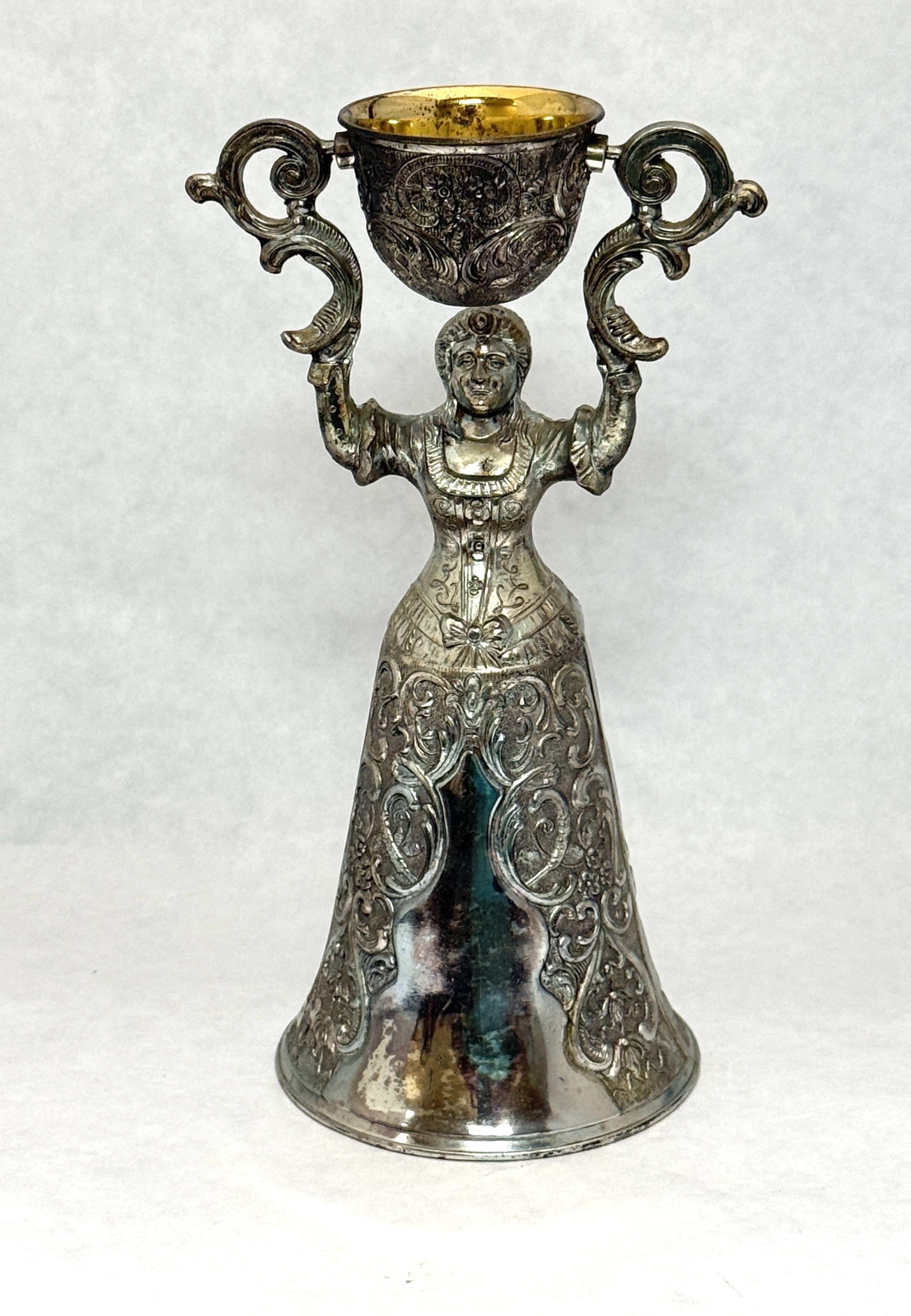 Silver plate German wedding bell, 7″ ht. CONDITION: no chips, cracks, repairs, or material defects found, Jaremos attempts to call any material flaw that affects the price, but minor scratches and color variances are inherent to glass and antiques.