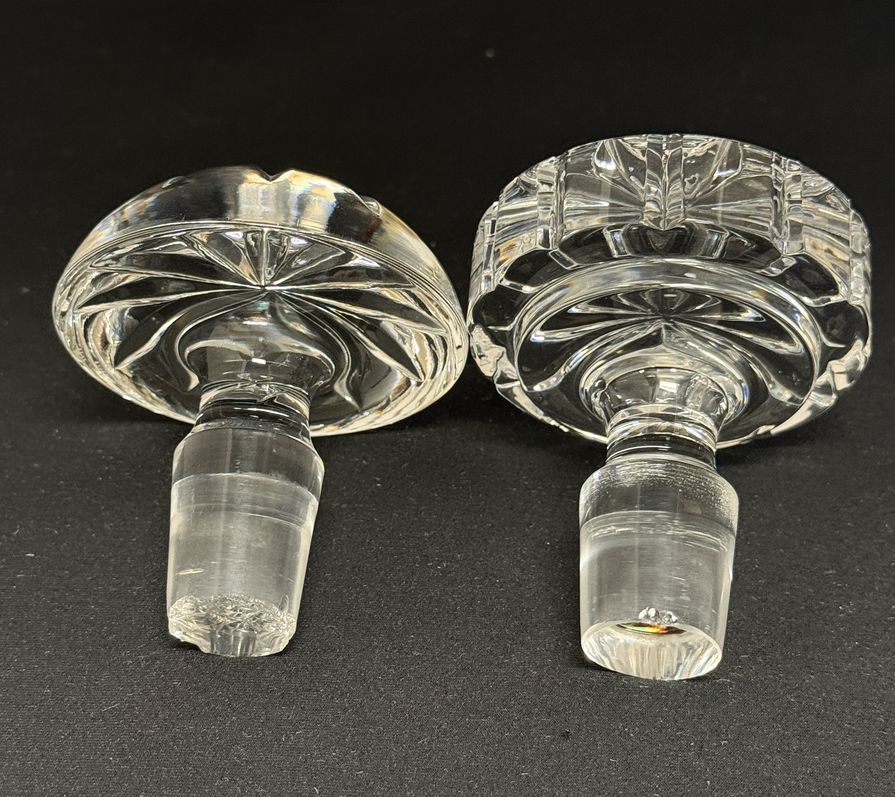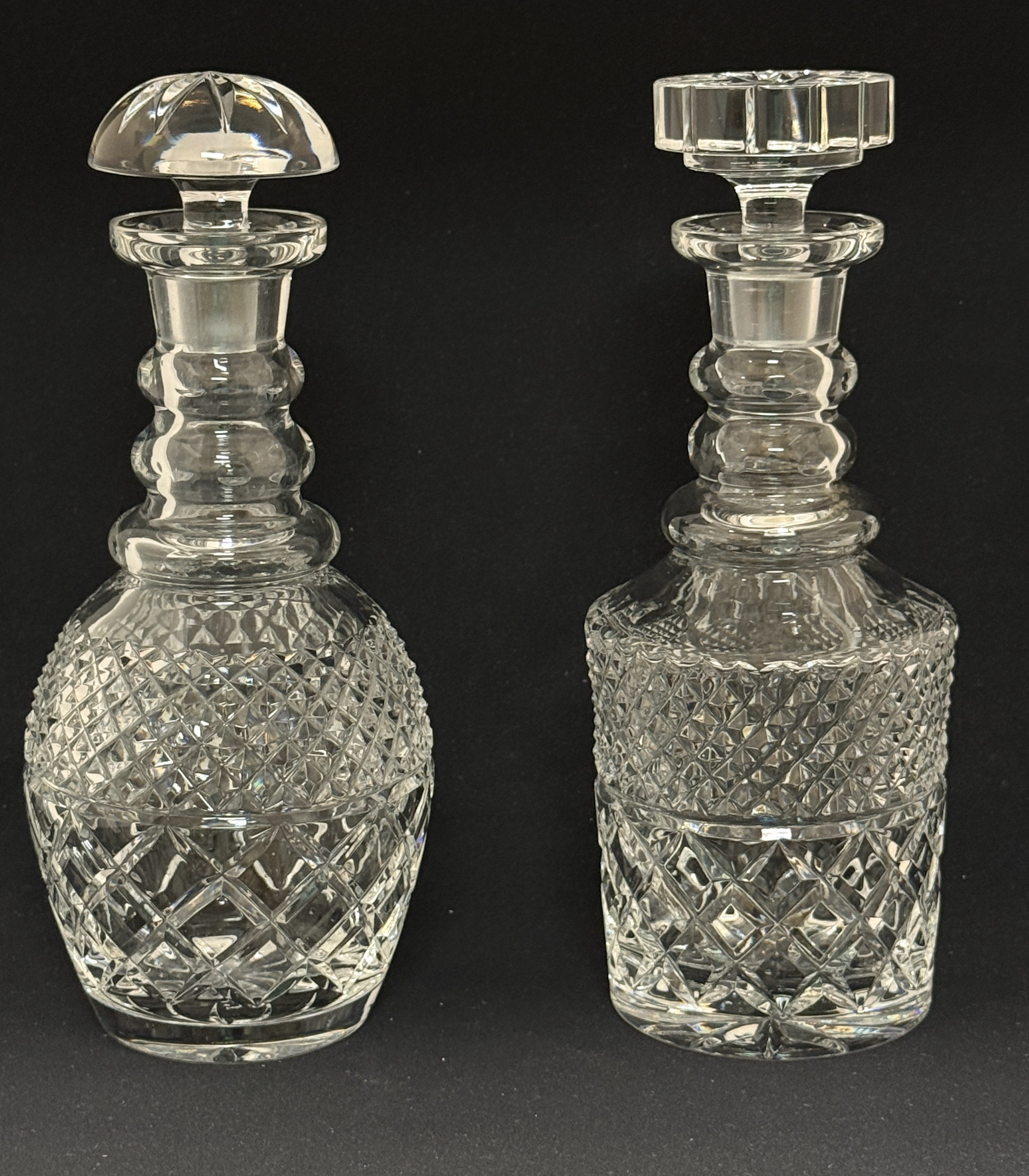 2 cut glass decanters, 11 1/2″ ht. CONDITION: roughness to inside of one of the stoppers.