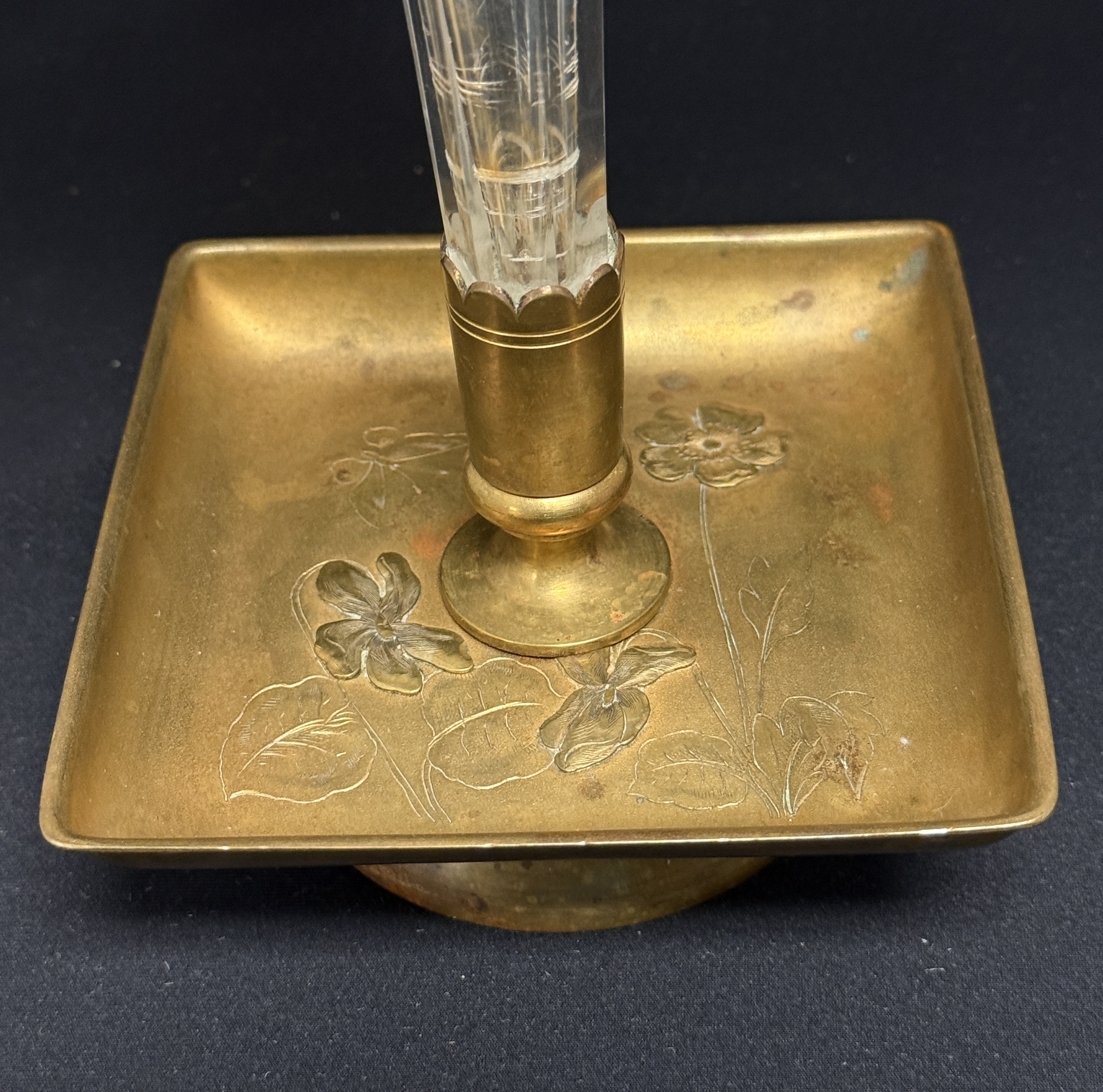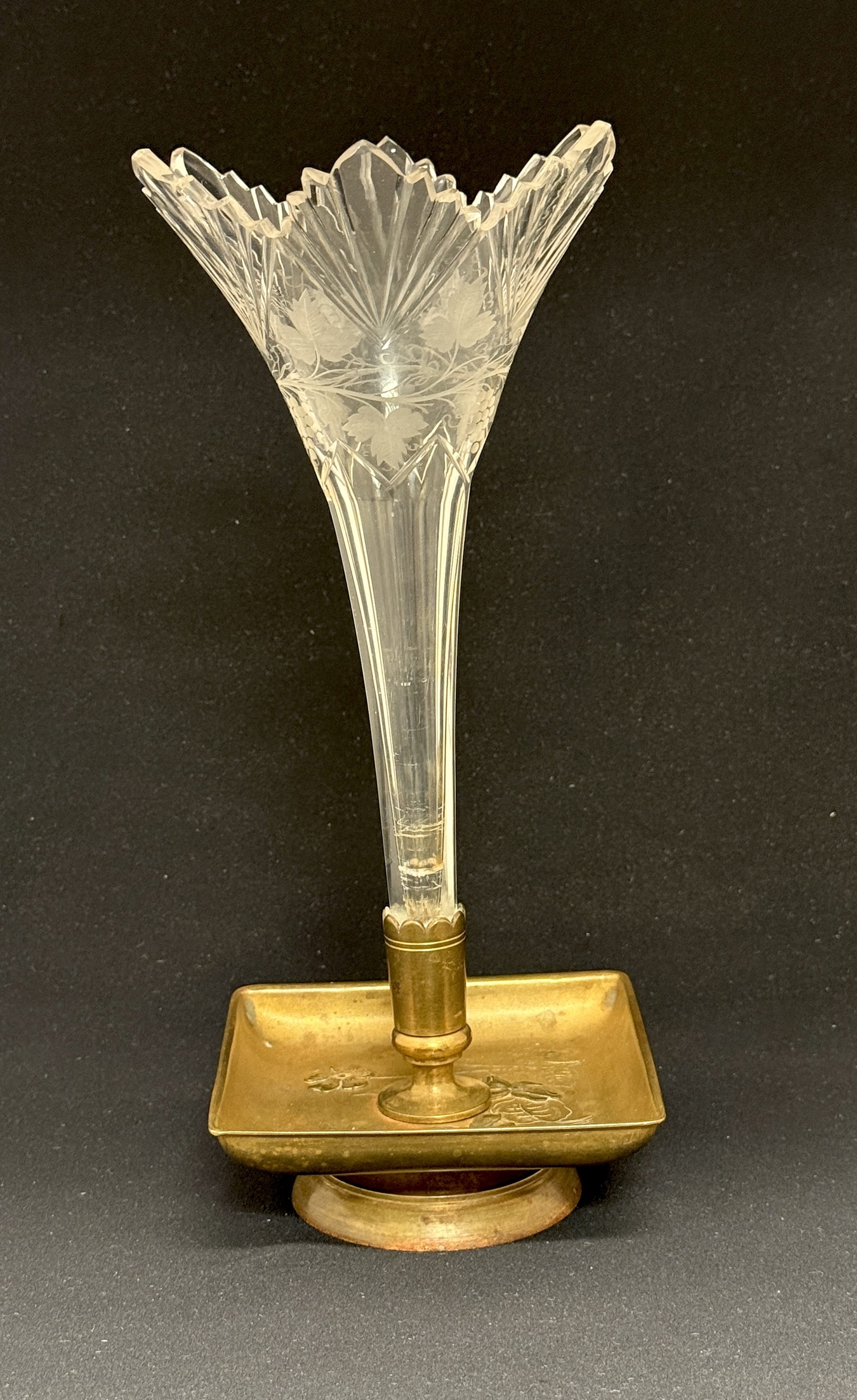 Etched glass and metal trumpet vase, 12 1/2″ ht. CONDITION: no chips, cracks, repairs, or material defects found, Jaremos attempts to call any material flaw that affects the price, but minor scratches and color variances are inherent to glass and antiques.