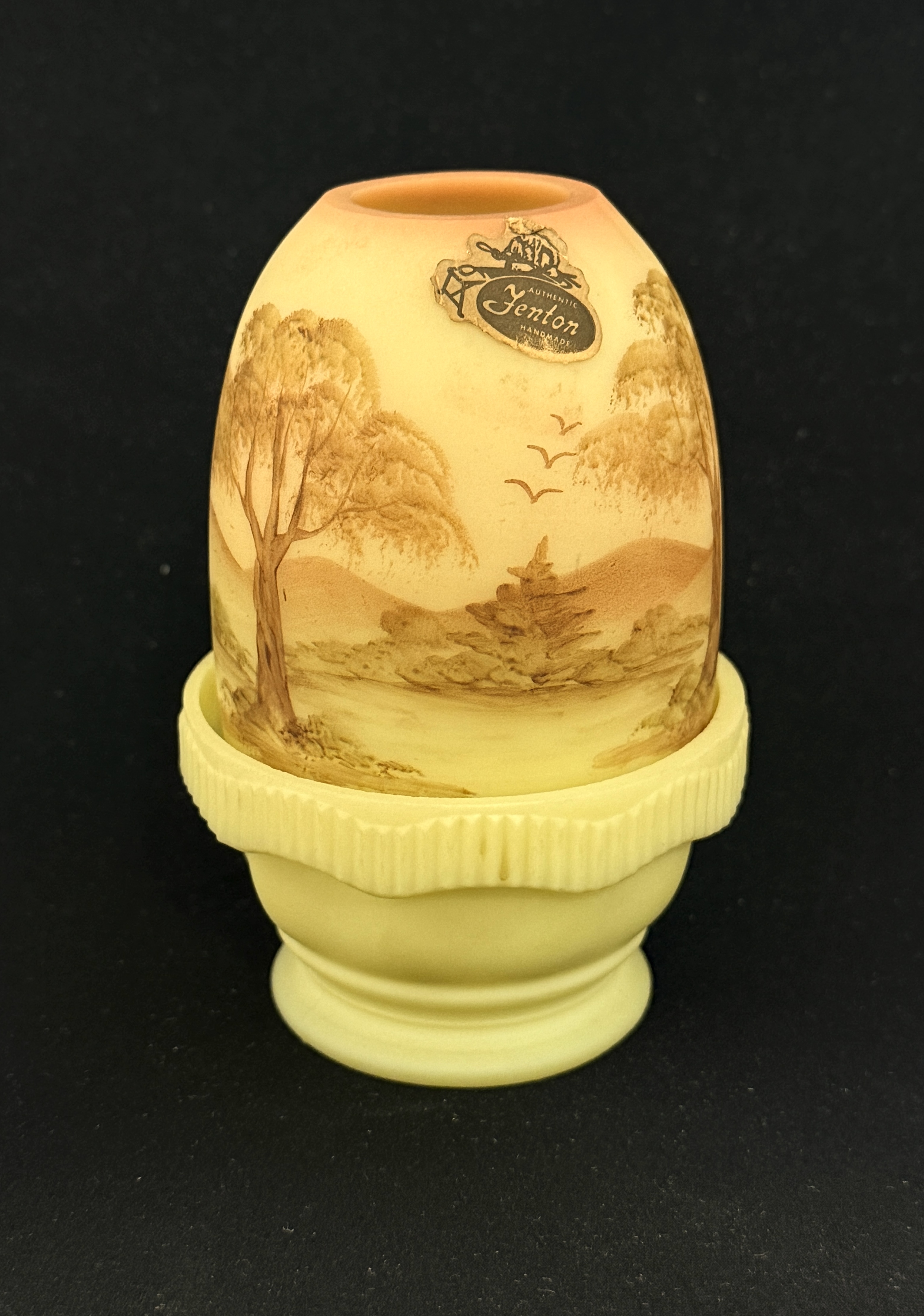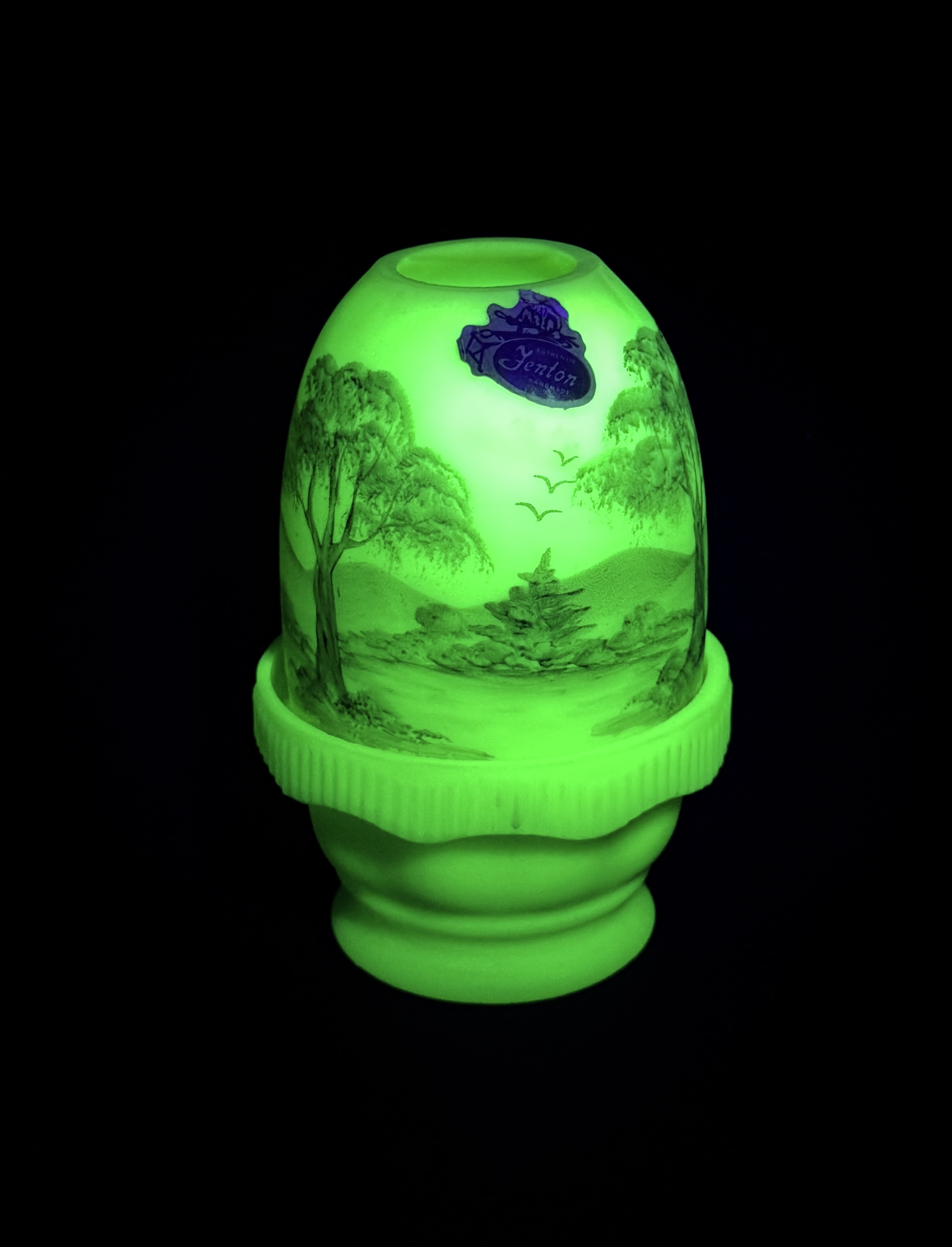 Fenton fairylamp, glows under blacklite, 4 1/2″ ht. CONDITION: no chips, cracks, repairs, or material defects found, Jaremos attempts to call any material flaw that affects the price, but minor scratches and color variances are inherent to glass and antiques.