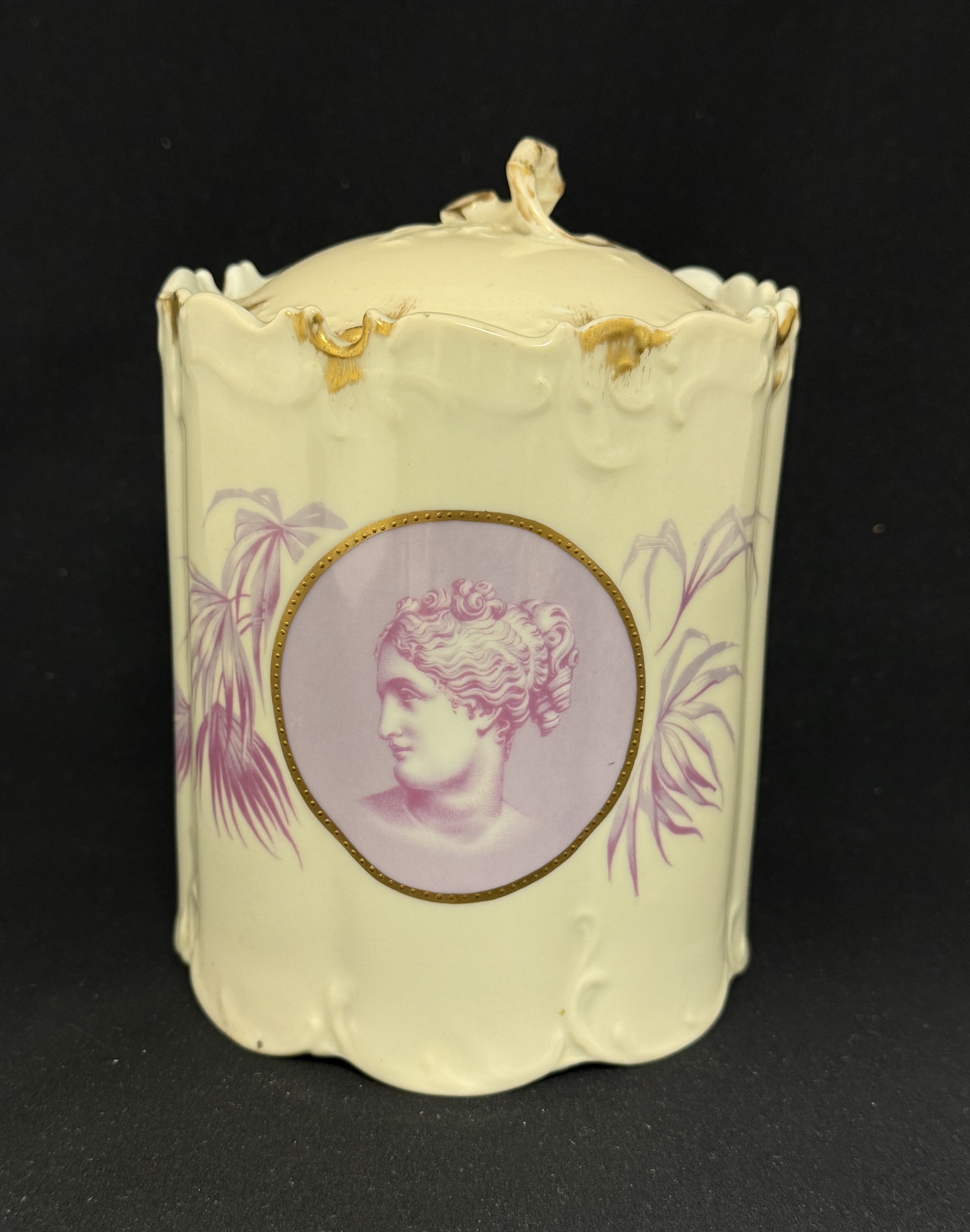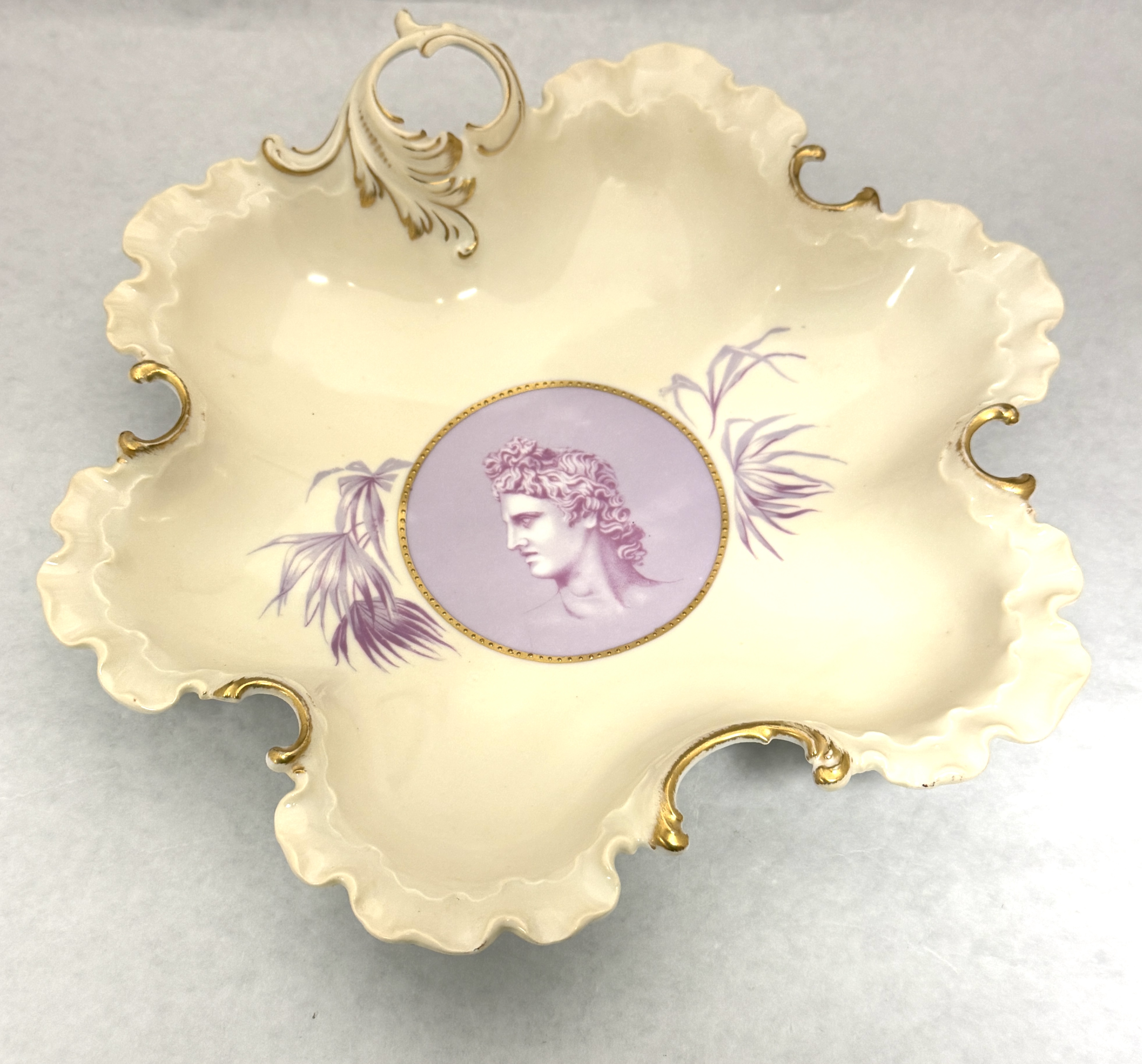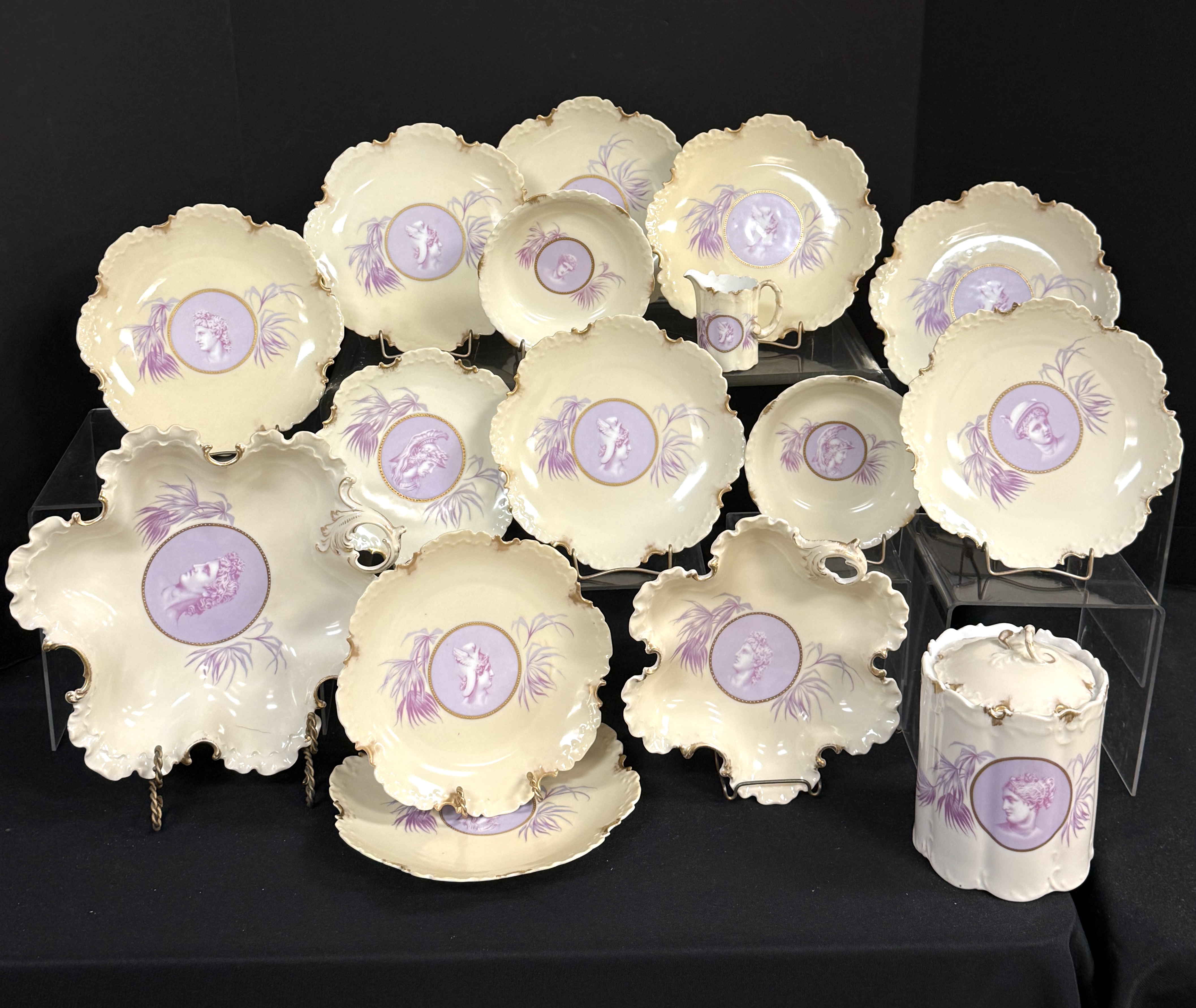 16 Rosenthal Monbijou cameo luncheon items including 2 handled serving trays, a covered biscuit, and 8 luncheon plates, largest tray 11″ diameter. CONDITION: no chips, cracks, repairs, or material defects found, Jaremos attempts to call any material flaw that affects the price, but minor scratches and color variances are inherent to glass and antiques.