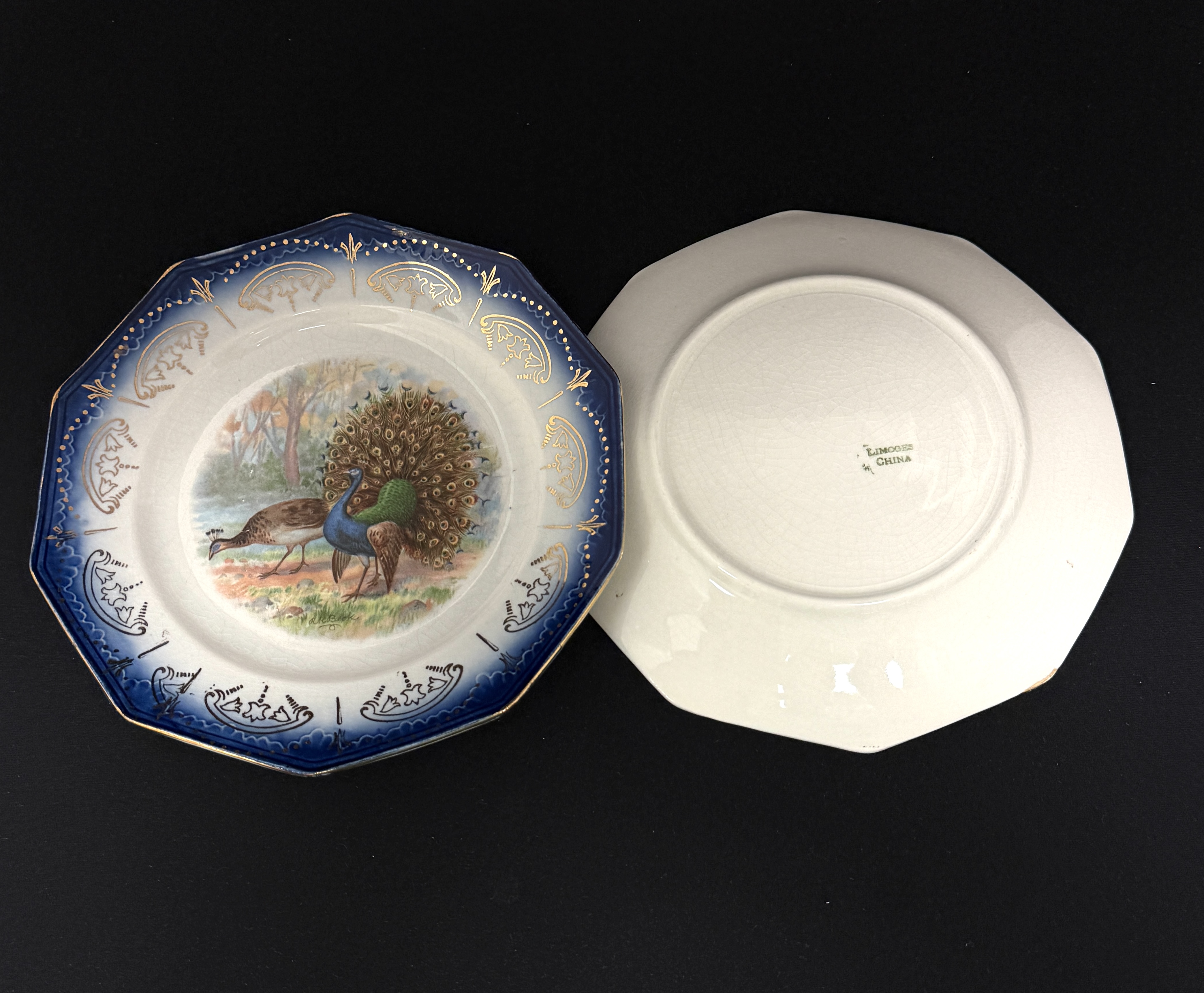 6 Limoges plates with peacocks, 8 1/4″ diameter. CONDITION: no chips, cracks, repairs, or material defects found, Jaremos attempts to call any material flaw that affects the price, but minor scratches and color variances are inherent to glass and antiques.