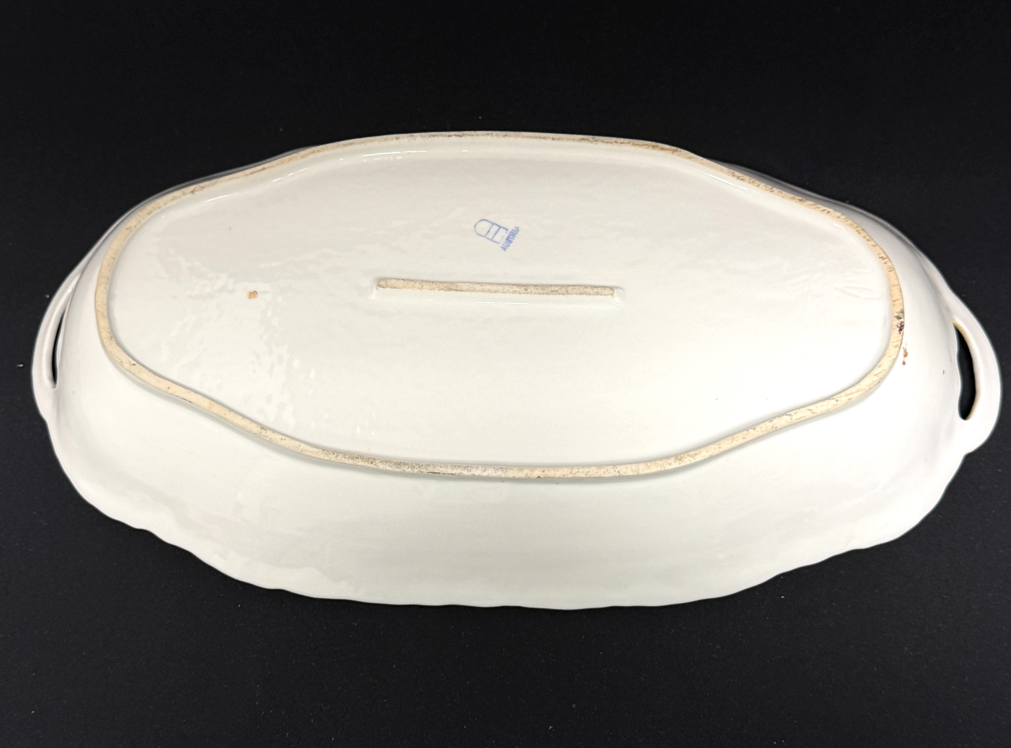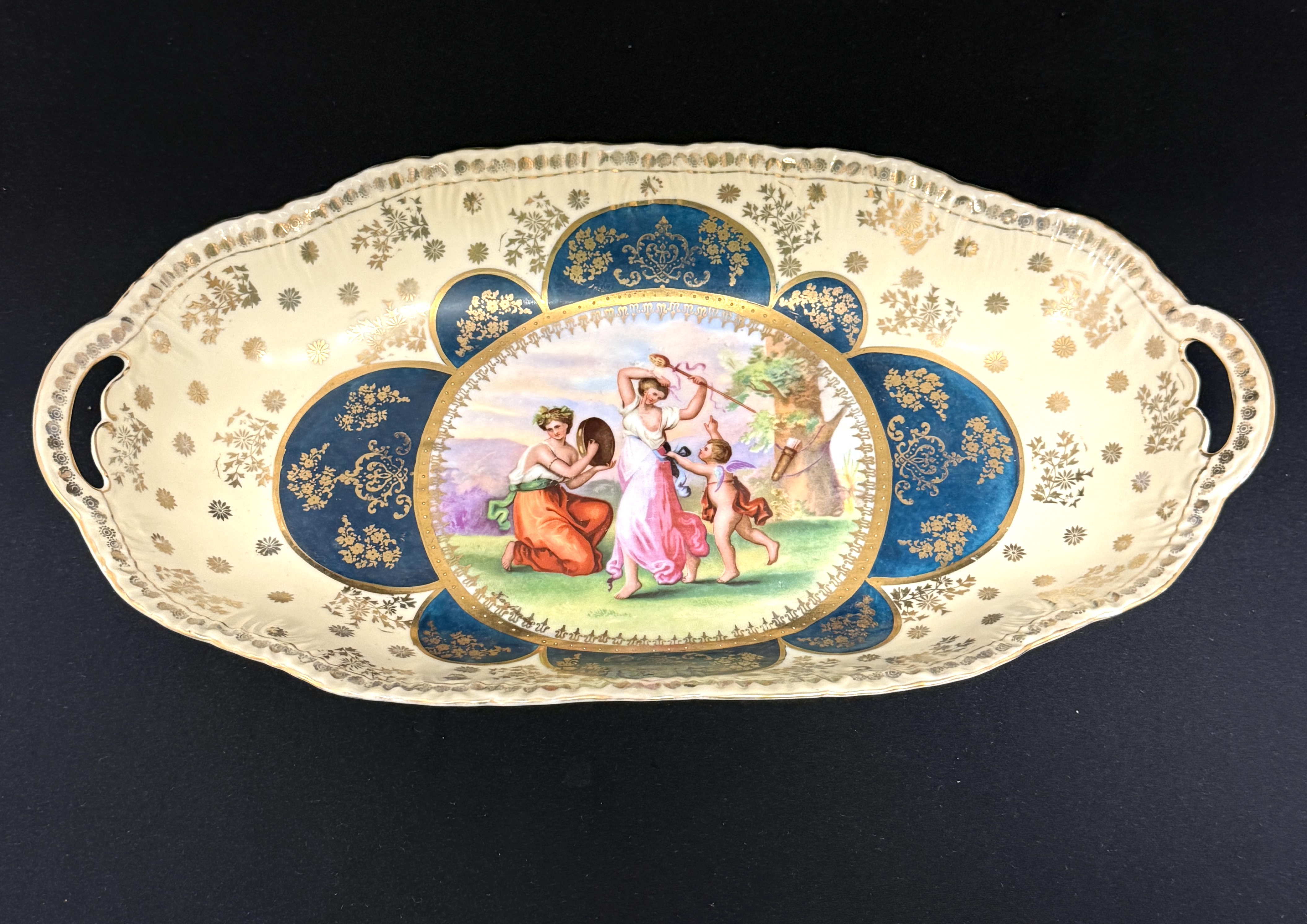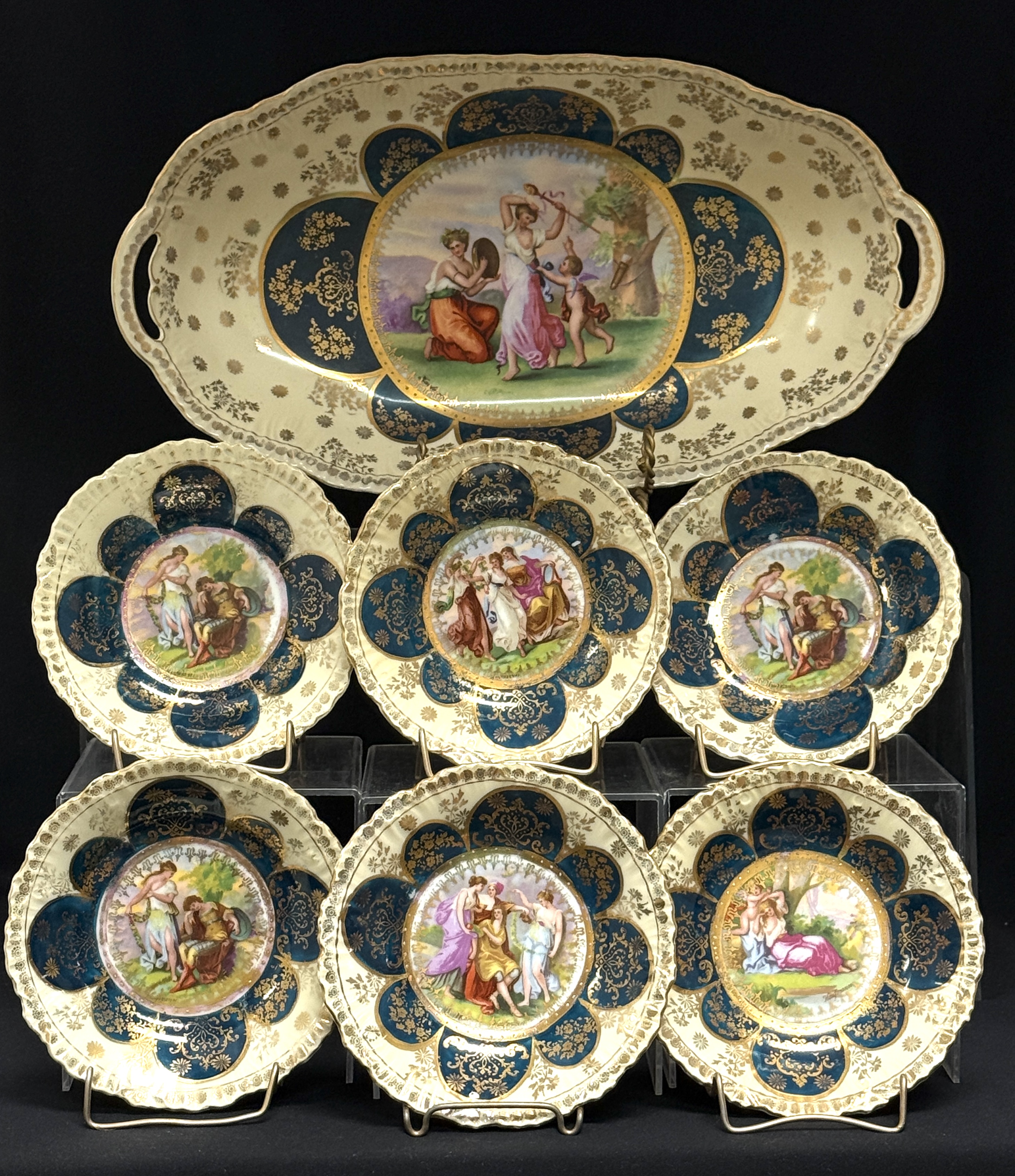 Austrian porcelain dessert set consisting of tray and 6 berry bowls, tray 15″ length. CONDITION: no chips, cracks, repairs, or material defects found, Jaremos attempts to call any material flaw that affects the price, but minor scratches and color variances are inherent to glass and antiques.