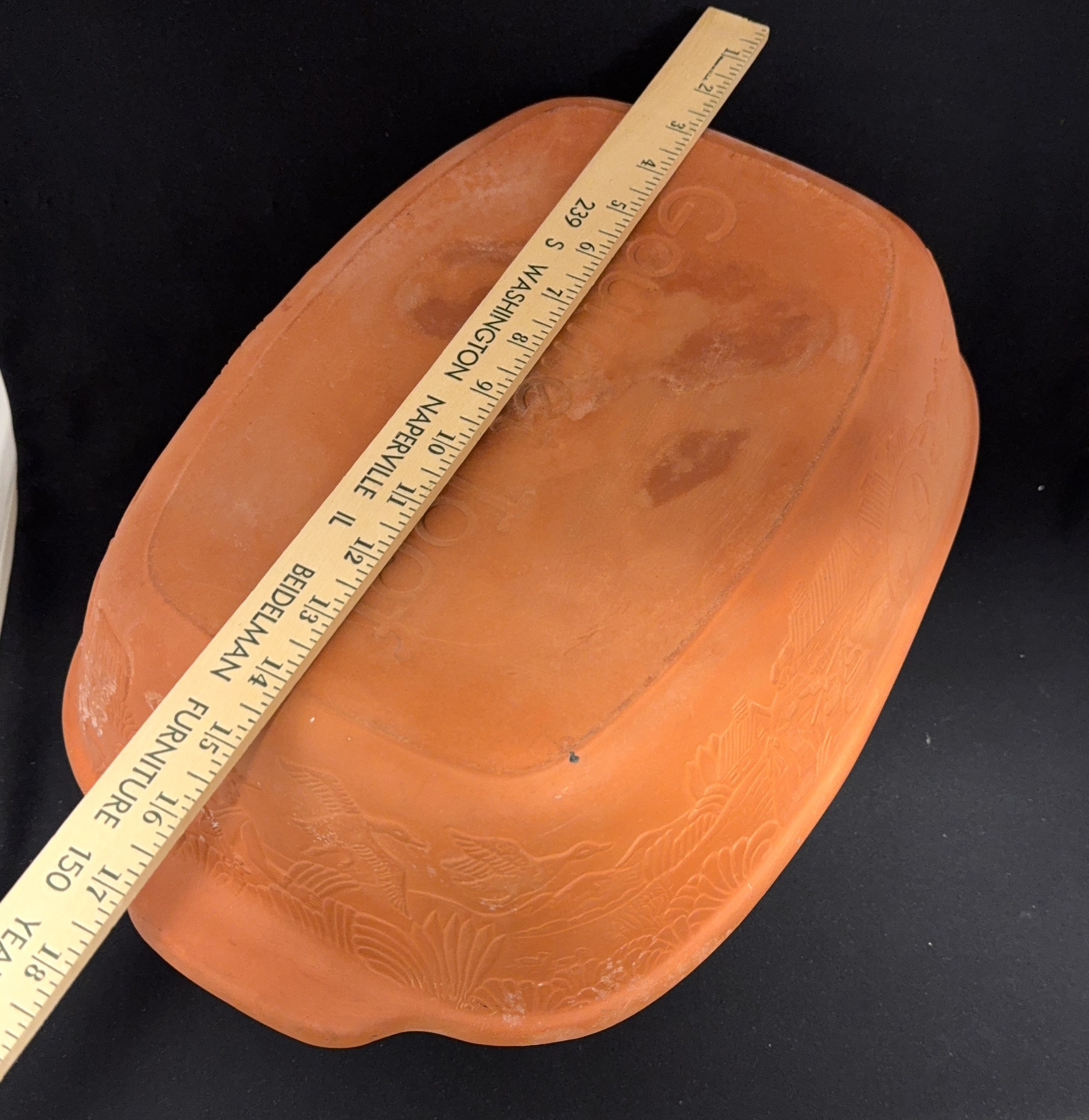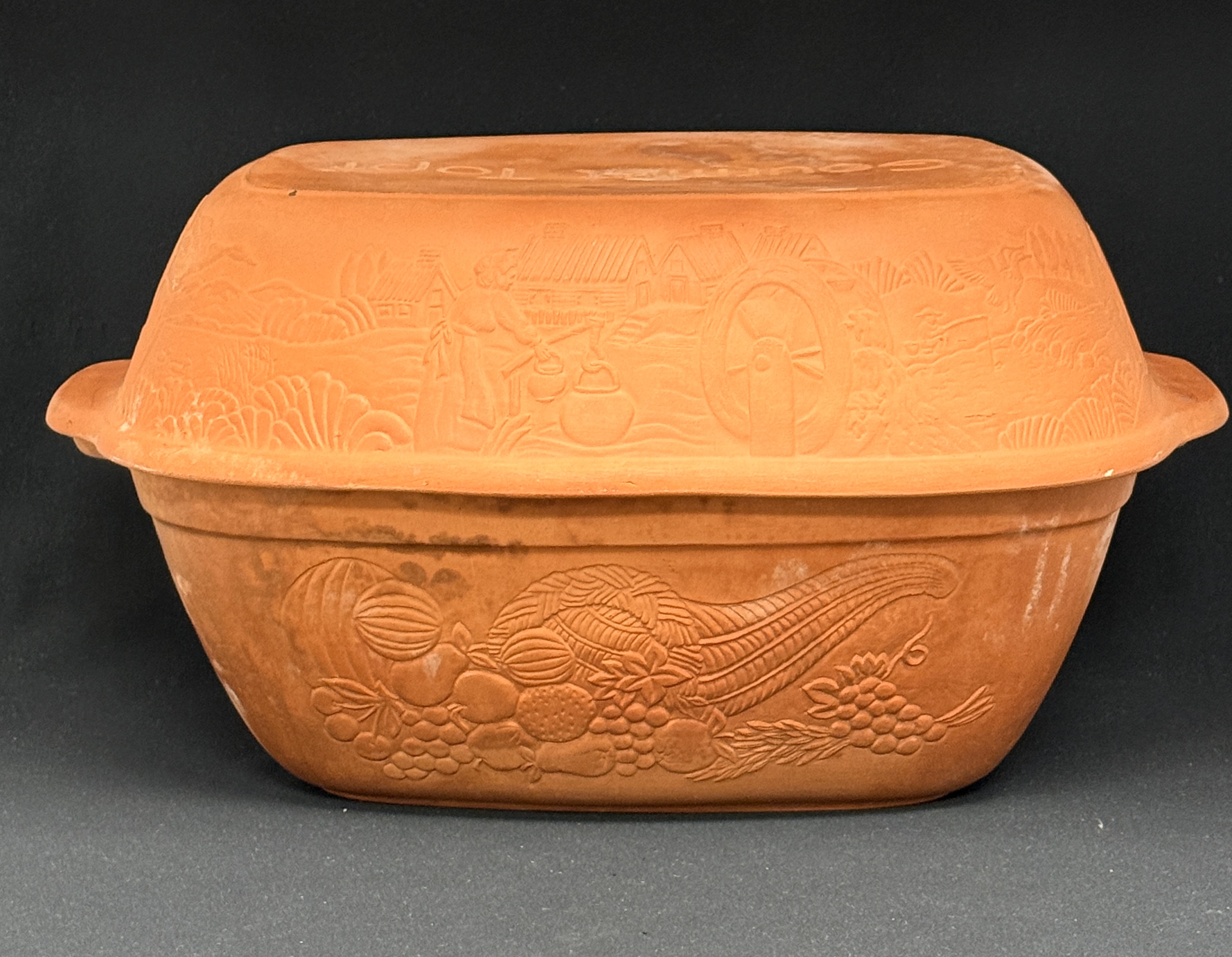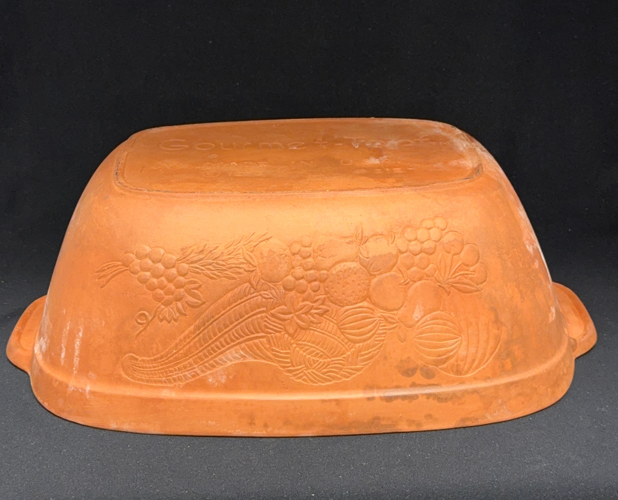 Large Gourmet Topf #312 clay Dutch oven, 16 3/4″ length, 11″ width. CONDITION: no chips, cracks, repairs, or material defects found, Jaremos attempts to call any material flaw that affects the price, but minor scratches and color variances are inherent to glass and antiques.