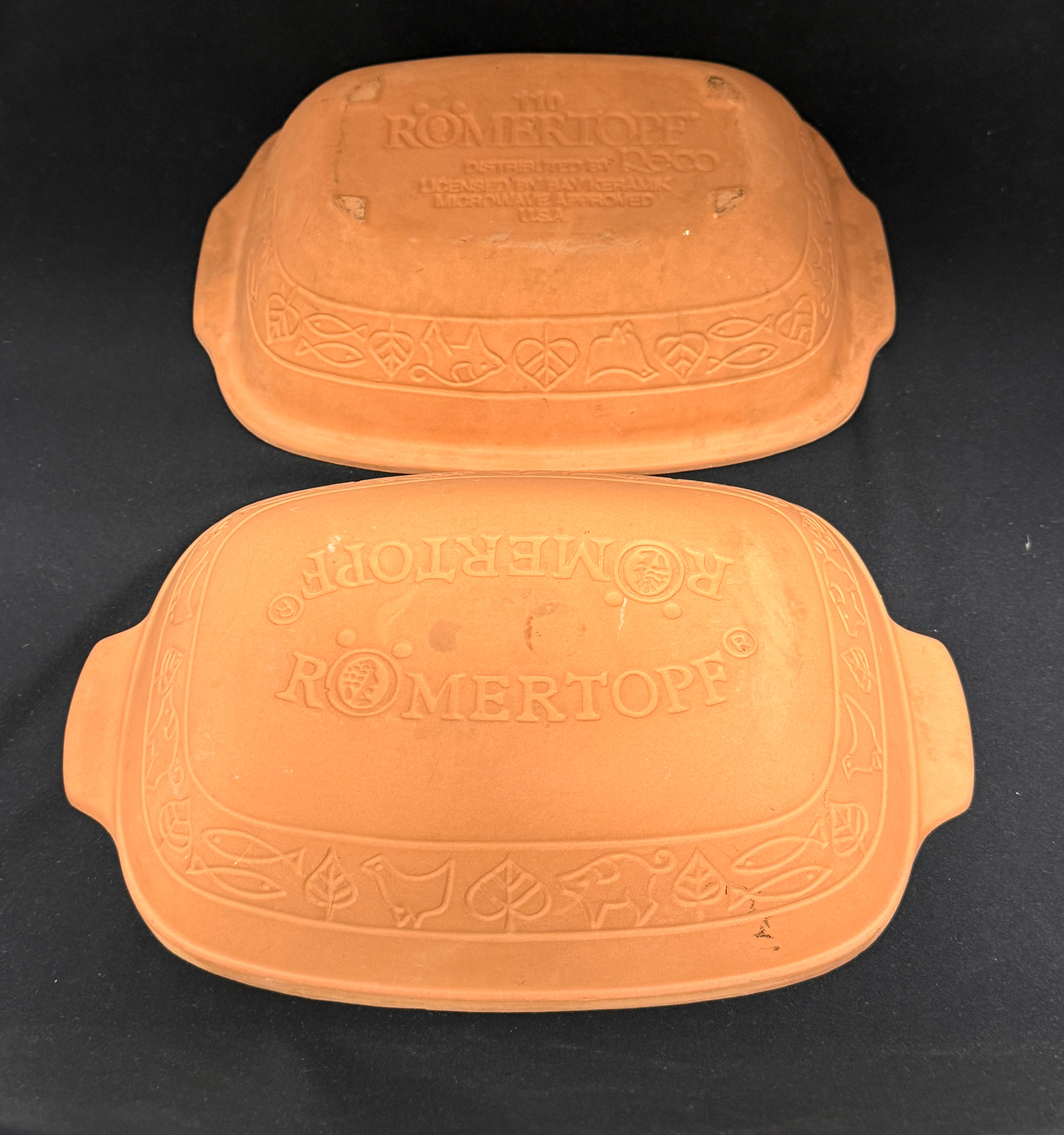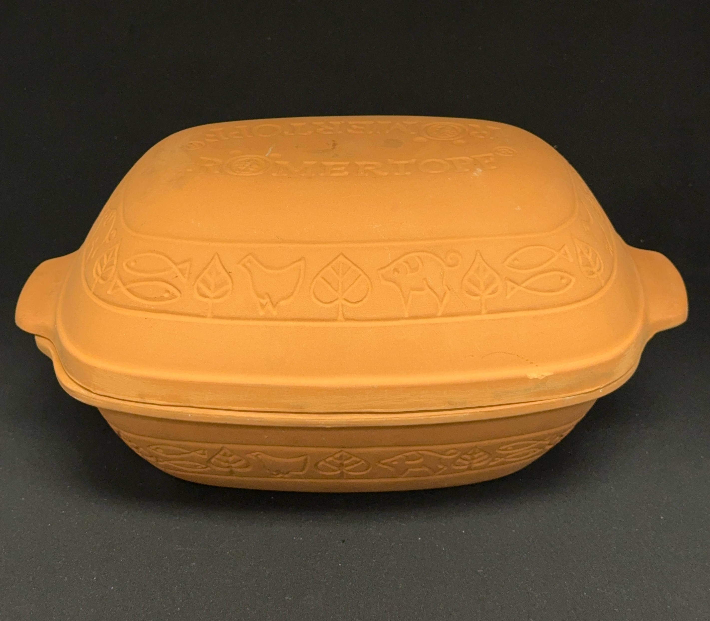 Romertopf clay Dutch oven #110, 11 1/4″ length, 7 3/4″ width. CONDITION: no chips, cracks, repairs, or material defects found, Jaremos attempts to call any material flaw that affects the price, but minor scratches and color variances are inherent to glass and antiques.