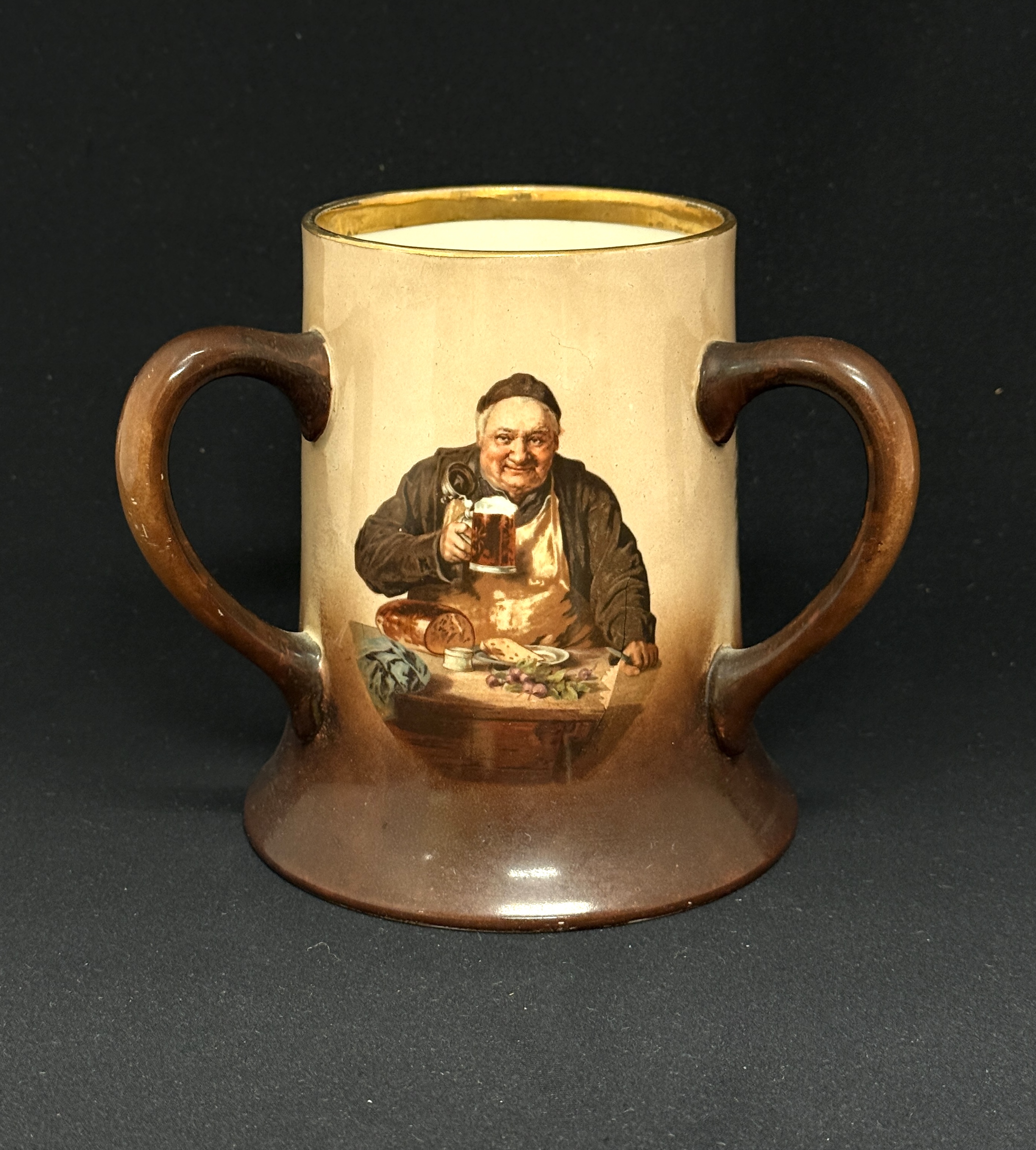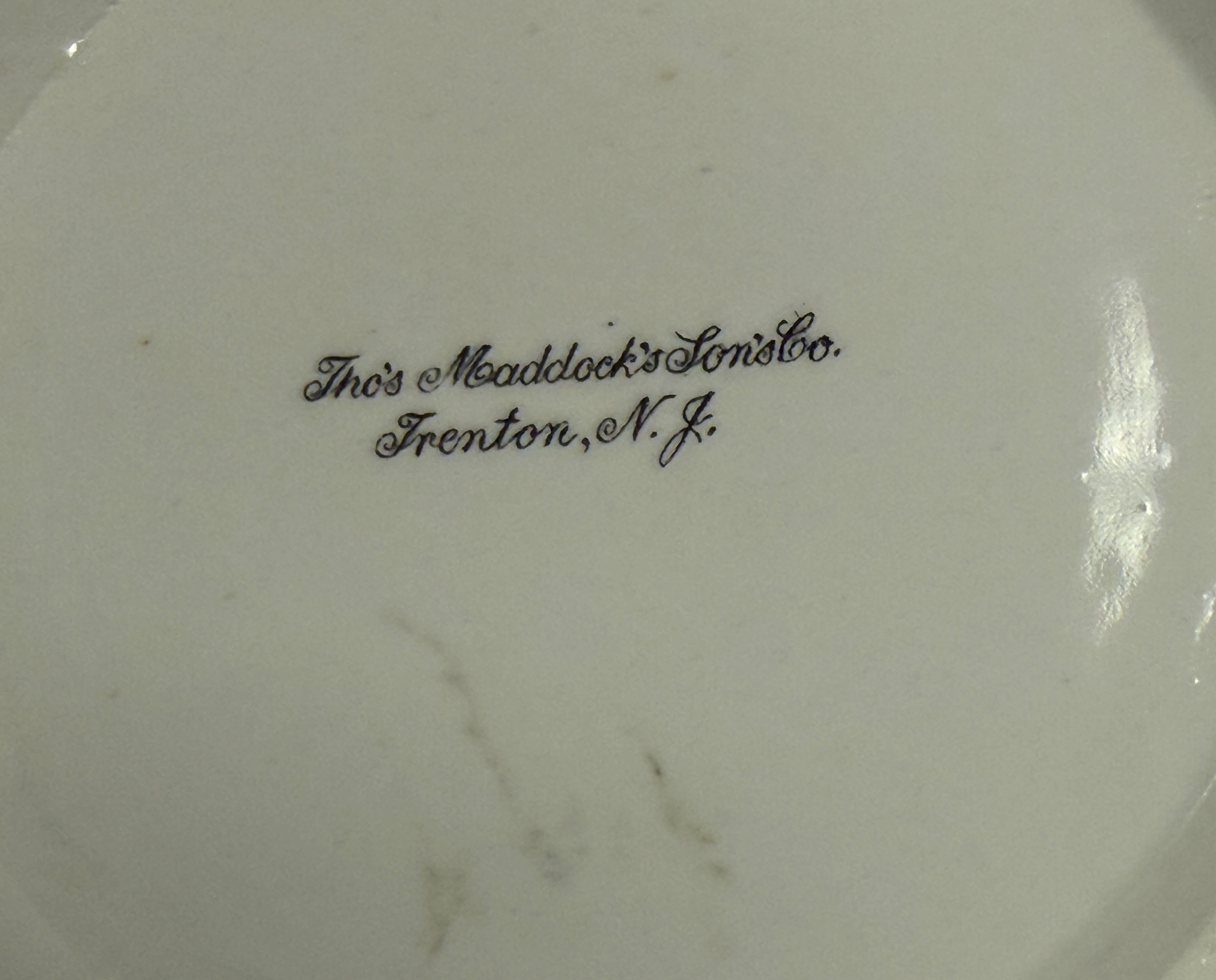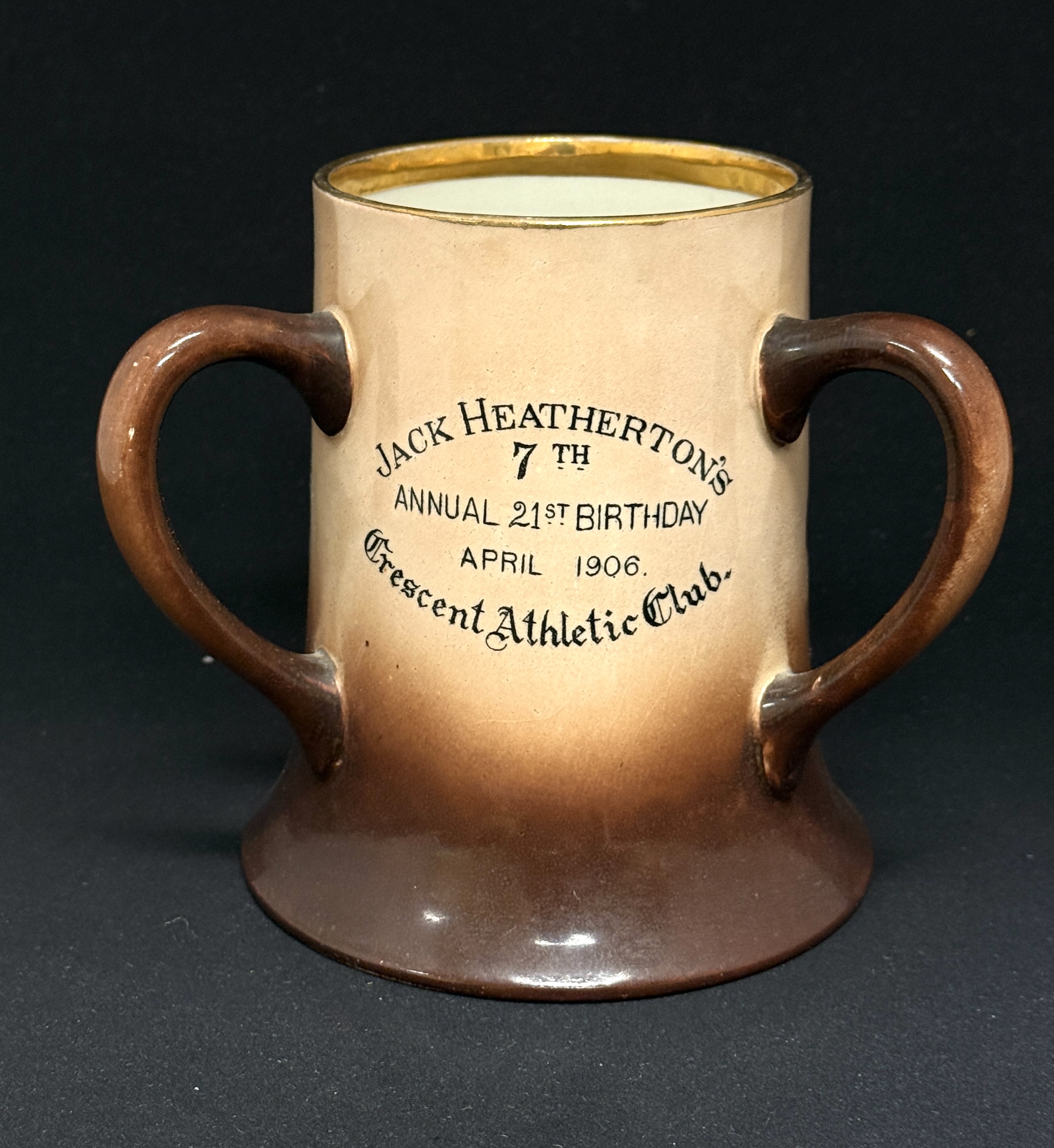 Billiard tournament 2 handled loving cup trophy, “Jack Heatherton’s 7th Annual 21st Birthday April 1906 Cresent Athletic Club”, signed Tho’s Maddock’s Sons Co Trenton, NJ, ht. 5 1/2″. CONDITION: no chips, cracks, repairs, or material defects found, Jaremos attempts to call any material flaw that affects the price, but minor scratches and color variances are inherent to glass and antiques.
