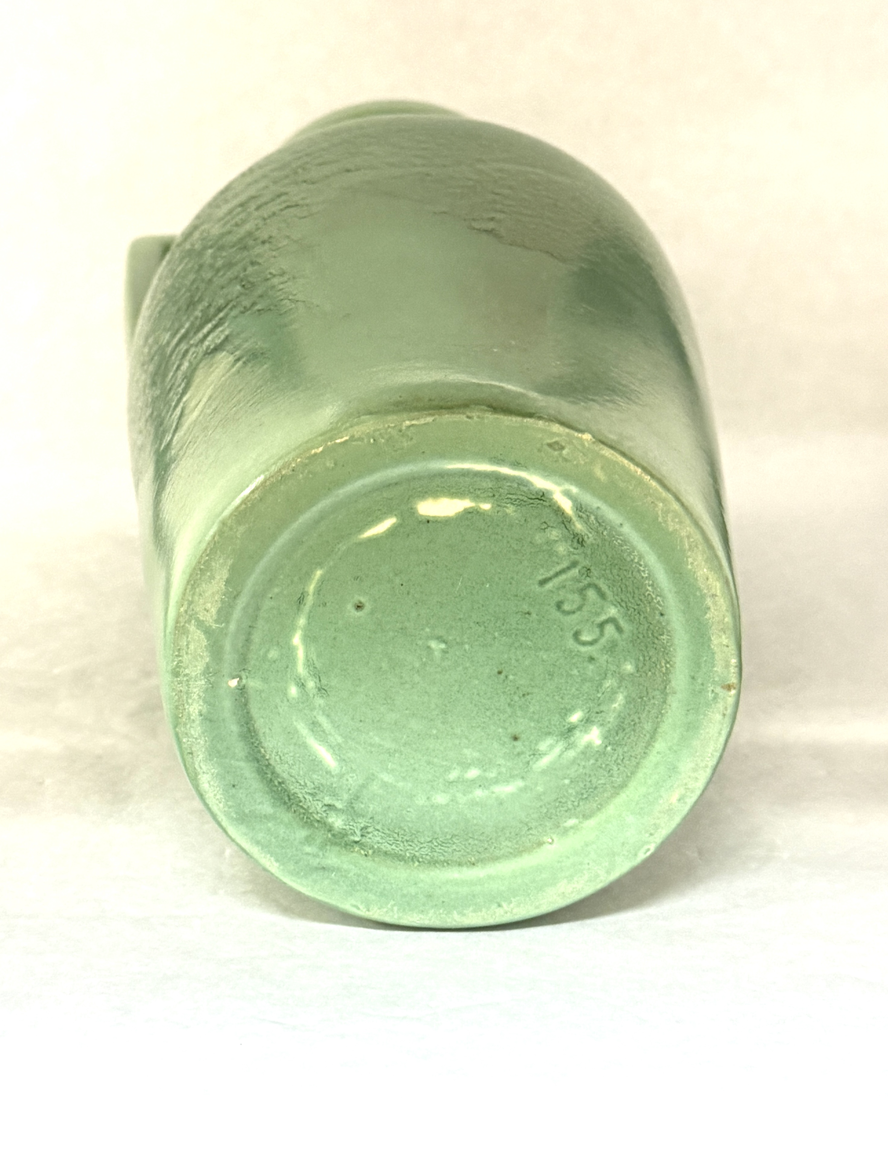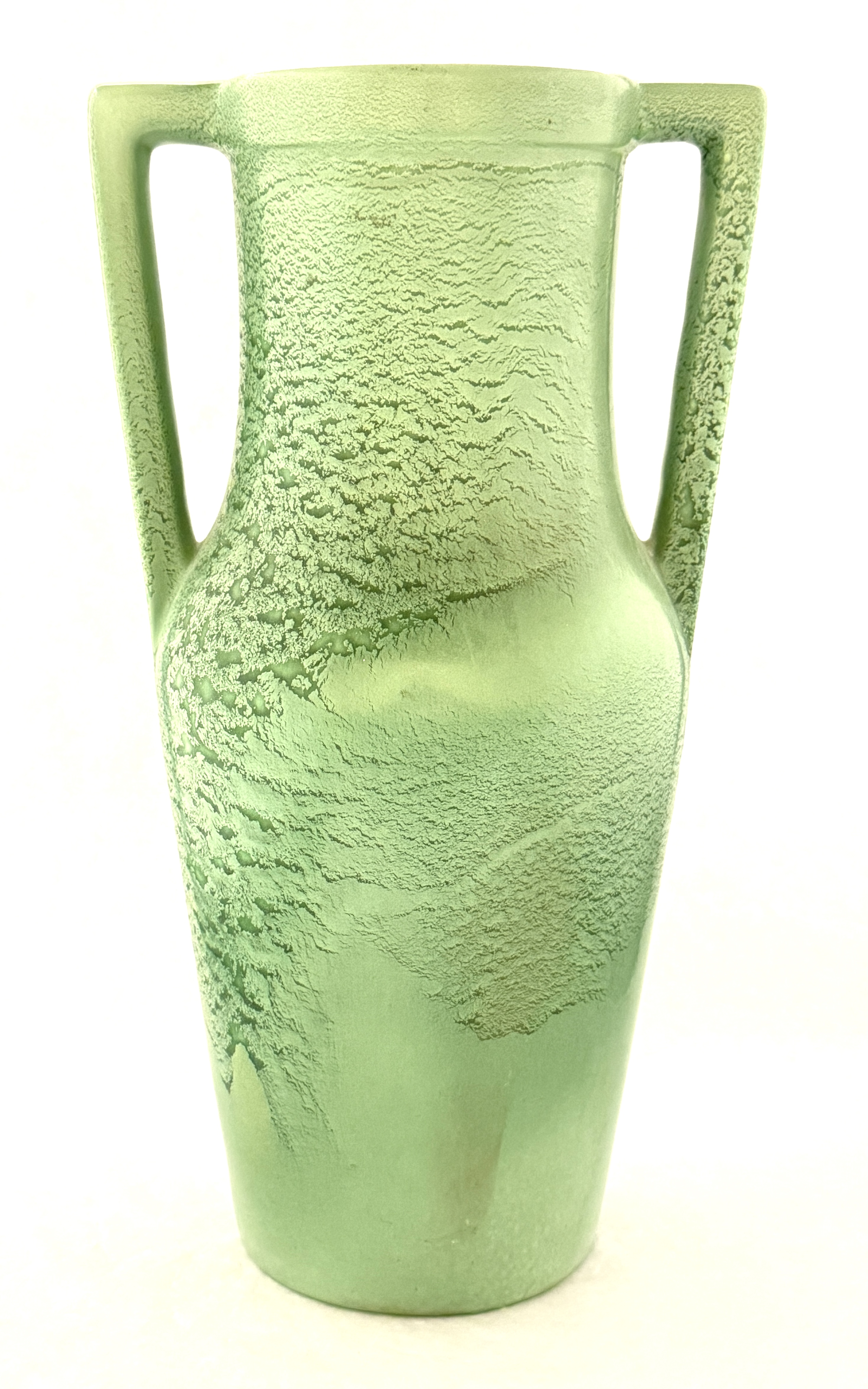 Tall green mat arts and crats vase with buttress handles, numbered; ht. 15 3/8″. CONDITION: no chips, cracks, repairs, or material defects found, Jaremos attempts to call any material flaw that affects the price, but minor scratches and color variances are inherent to glass and antiques.